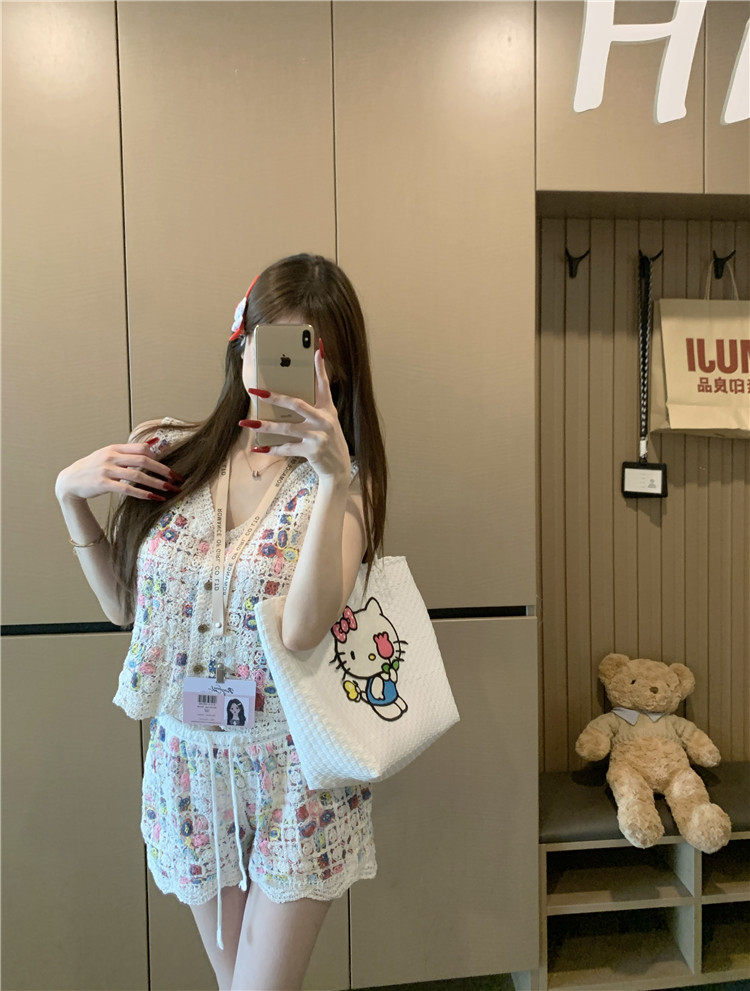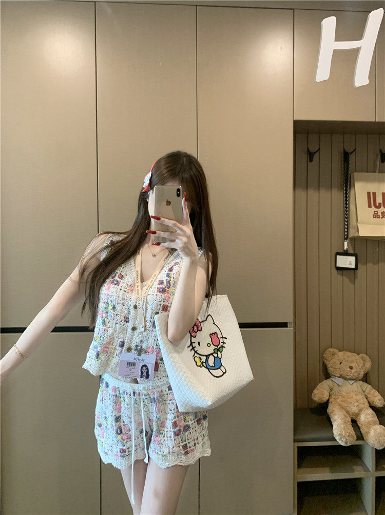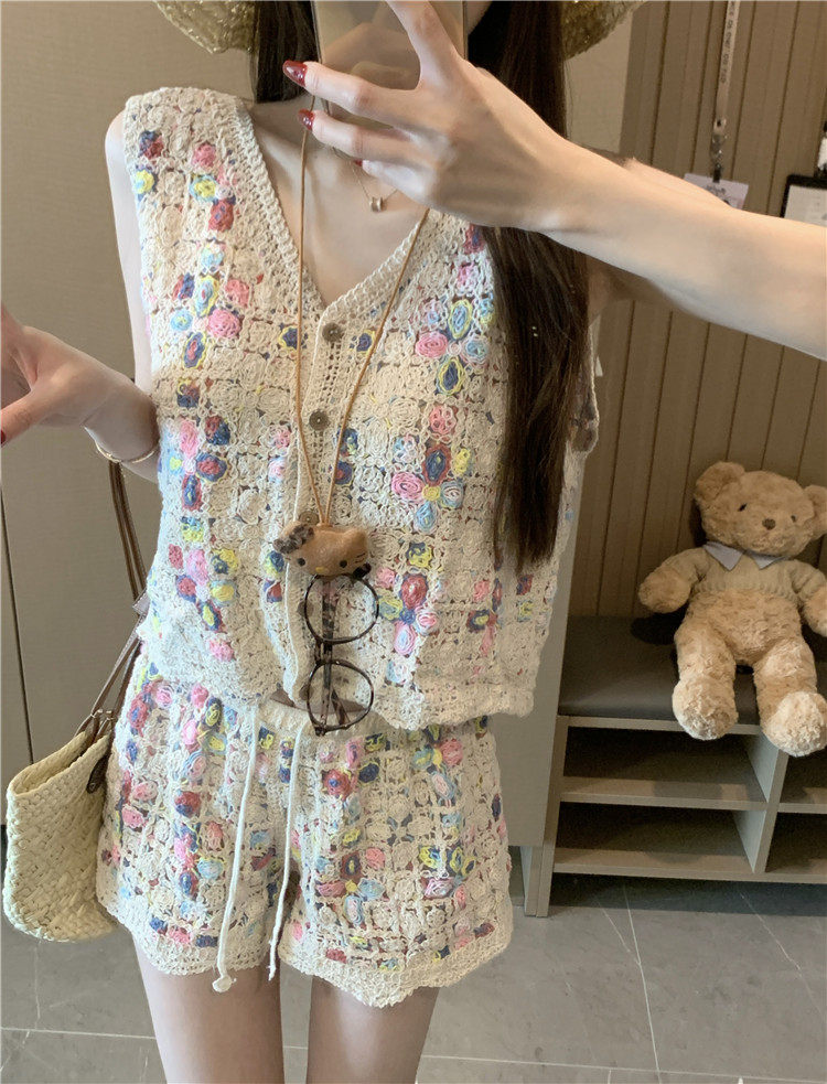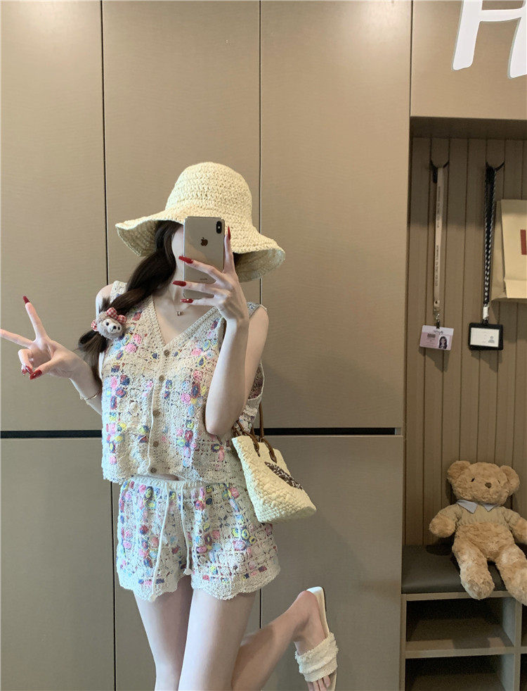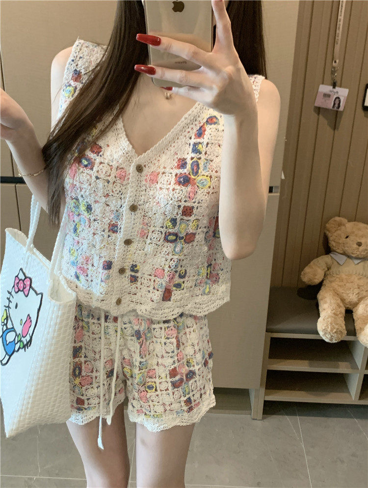 Lin Xi Xi ~ Beach Vacation Style Casual Suit Plaid Hollow-Out V-Neck Sleeveless Top High-Waisted Short Style
