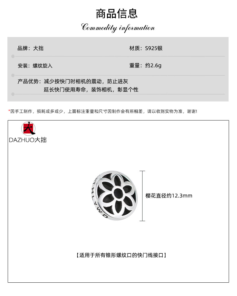 Dazhuo GOOD ART sterling silver cherry blossom SLR camera shutter button key accessories suitable for Leica, Fuji and Canon