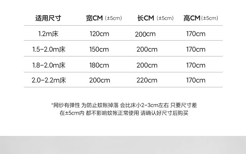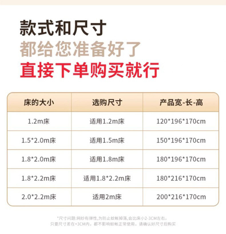 Applicable bed size Patented anti-fall mosquito nets are launched in the market! Good mosquito nets must have a base (good mosquito nets! Used from small to large),Suitable for 1.2m bed width 120cm* length 200cm* height 170cm,Suitable for 1.5m bed, width 150cm* length 200cm* height 170cm,Suitable for 1.8m bed, width 180cm* length 200cm* height 170cm,Suitable for 2.0m bed width 200cm* length 220cm* height 170cm,Upgraded lifetime warranty, suitable for 1.2m bed, width 120cm*length 200cm*height 170cm,Upgraded lifetime warranty, suitable for 1.5m bed, width 150cm*length 200cm*height 170cm,Upgraded lifetime warranty, suitable for 1.8m bed, width 180cm* length 200cm* height 170cm,Upgraded lifetime warranty, suitable for 2.0m bed, width 200cm* length 220cm* height 170cm