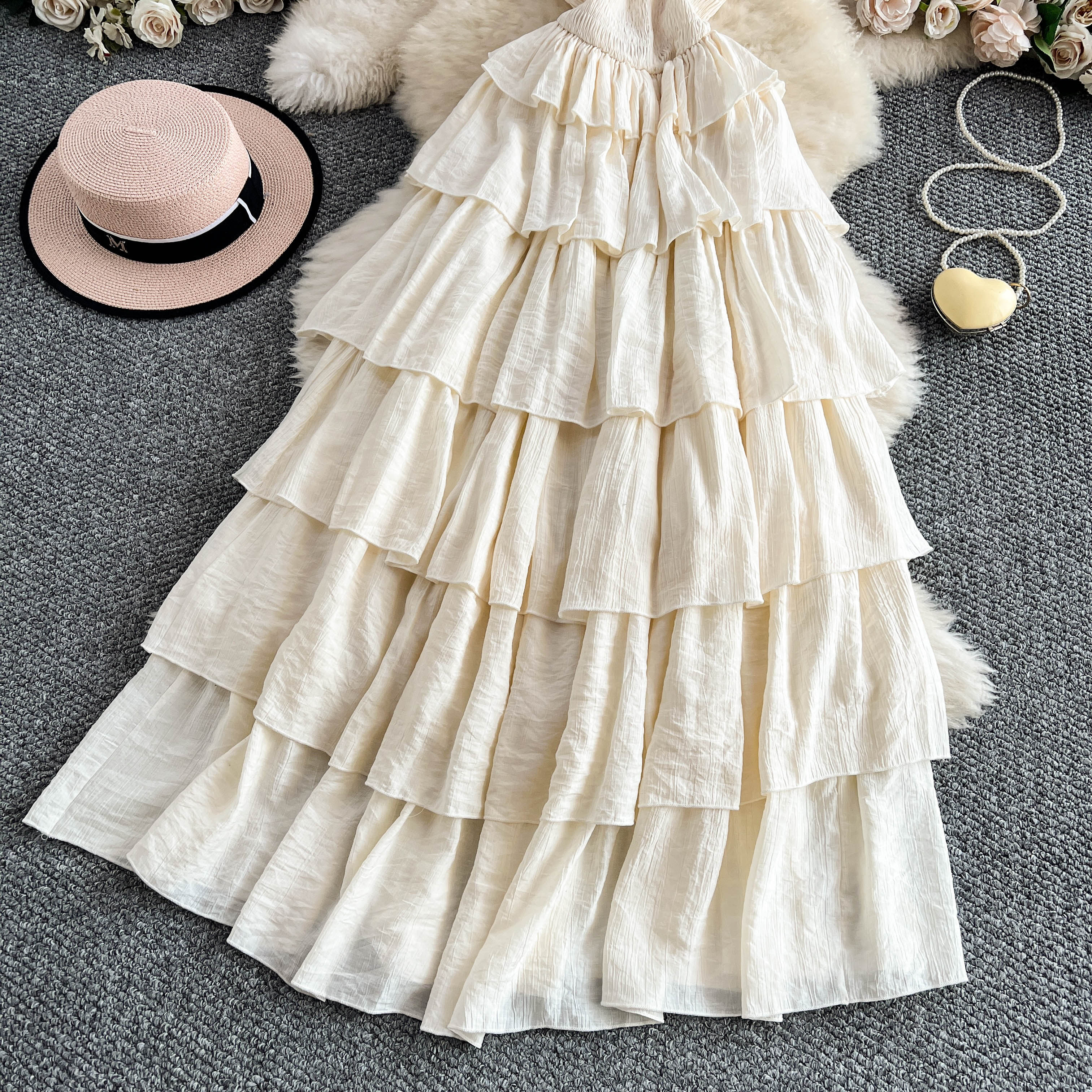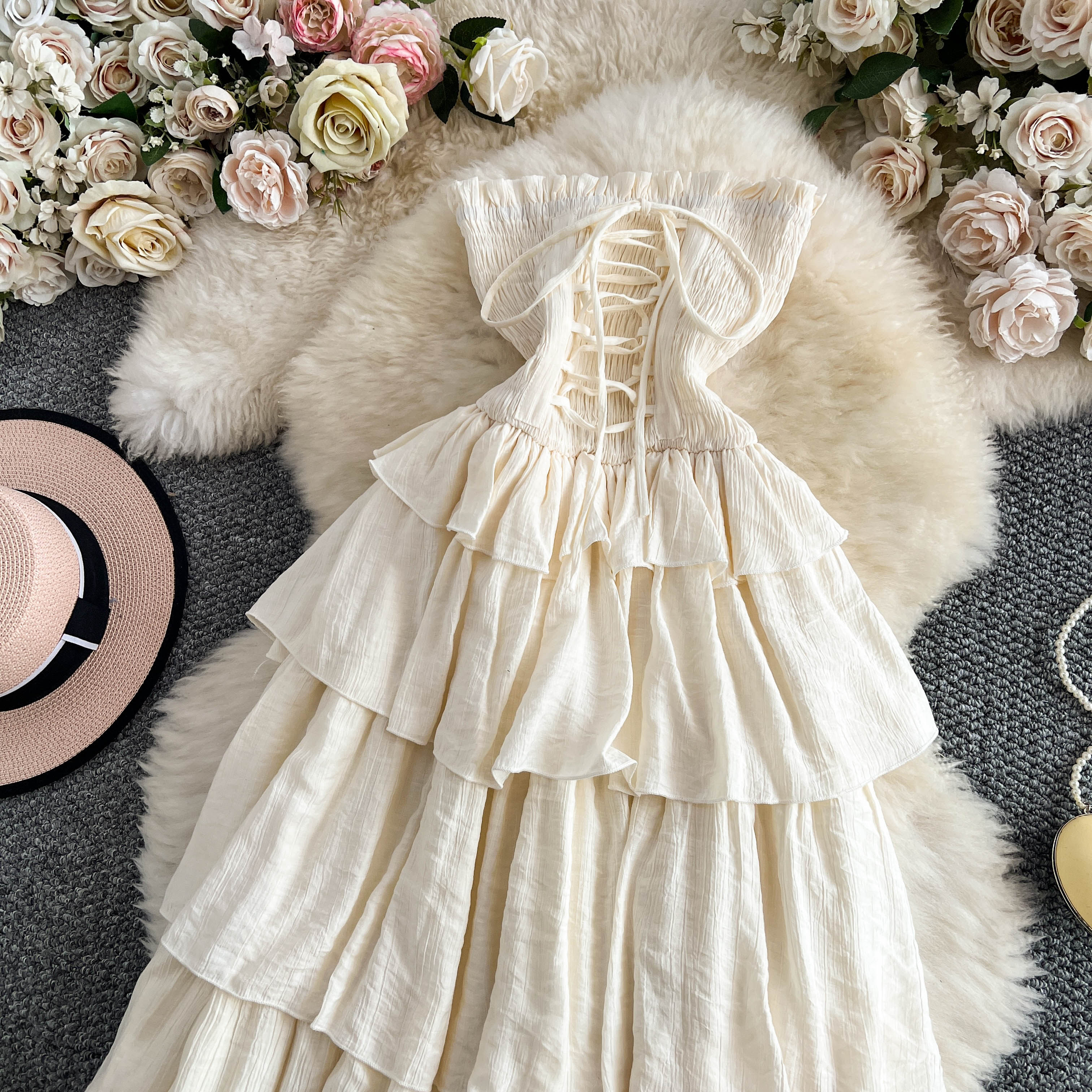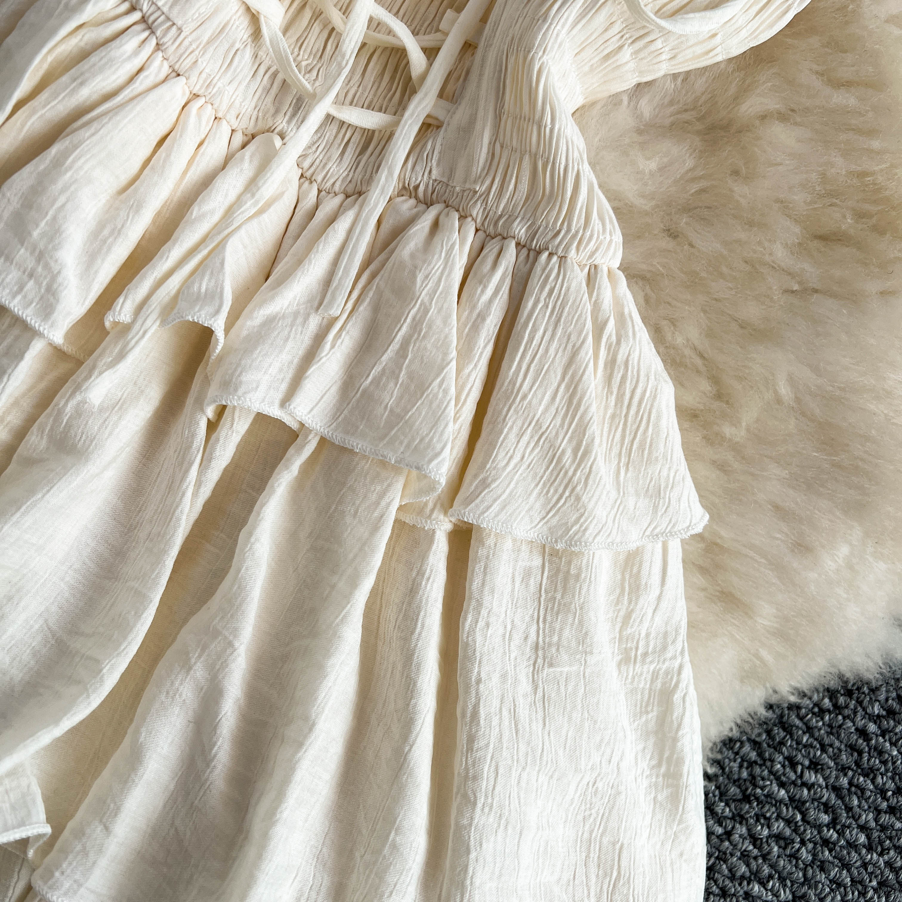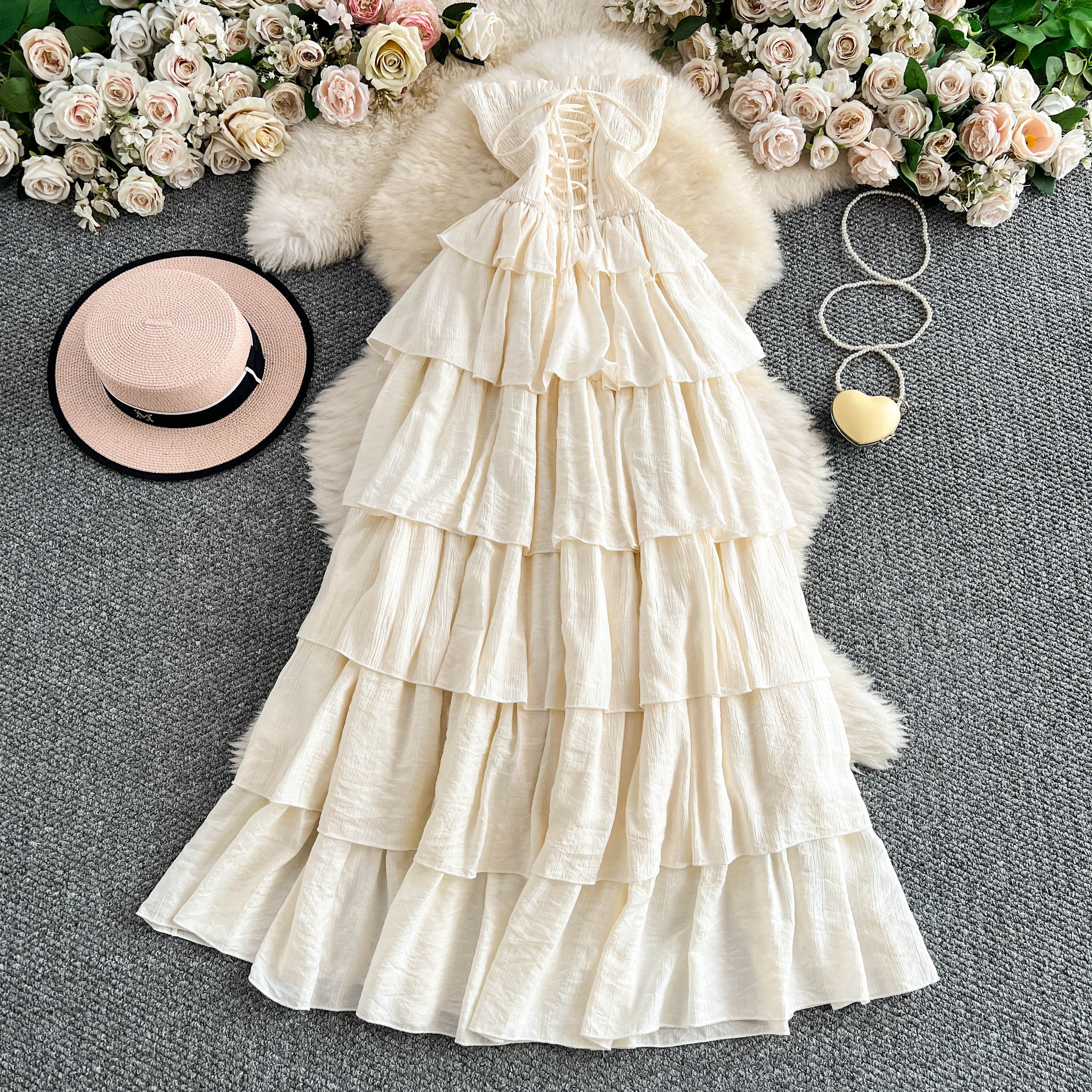 Atmospheric Niche French-Style Lace-Up Dress for Women, New Summer Style, Sexy Waist-Cinching, Slimming, Layered Ruffle Long Dress