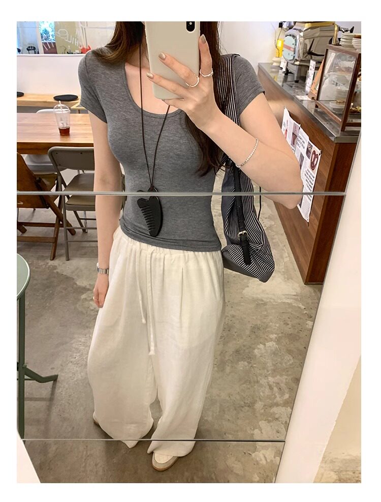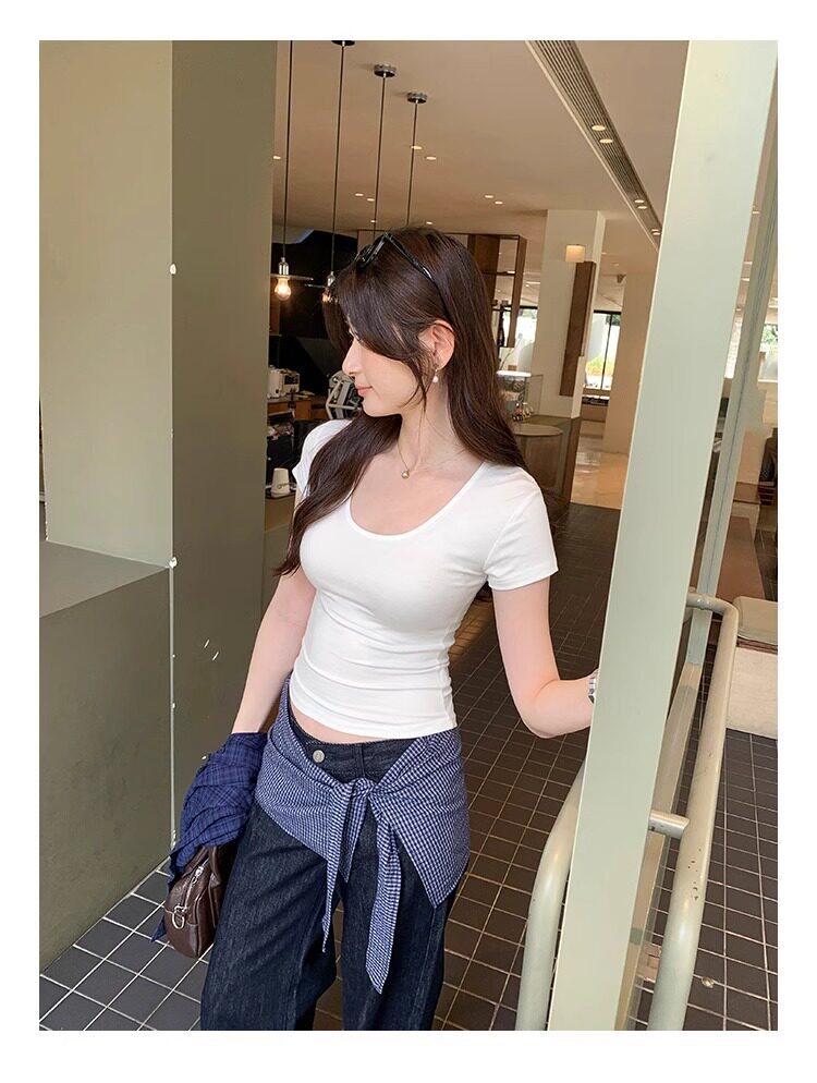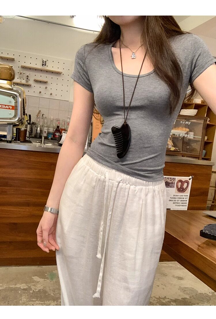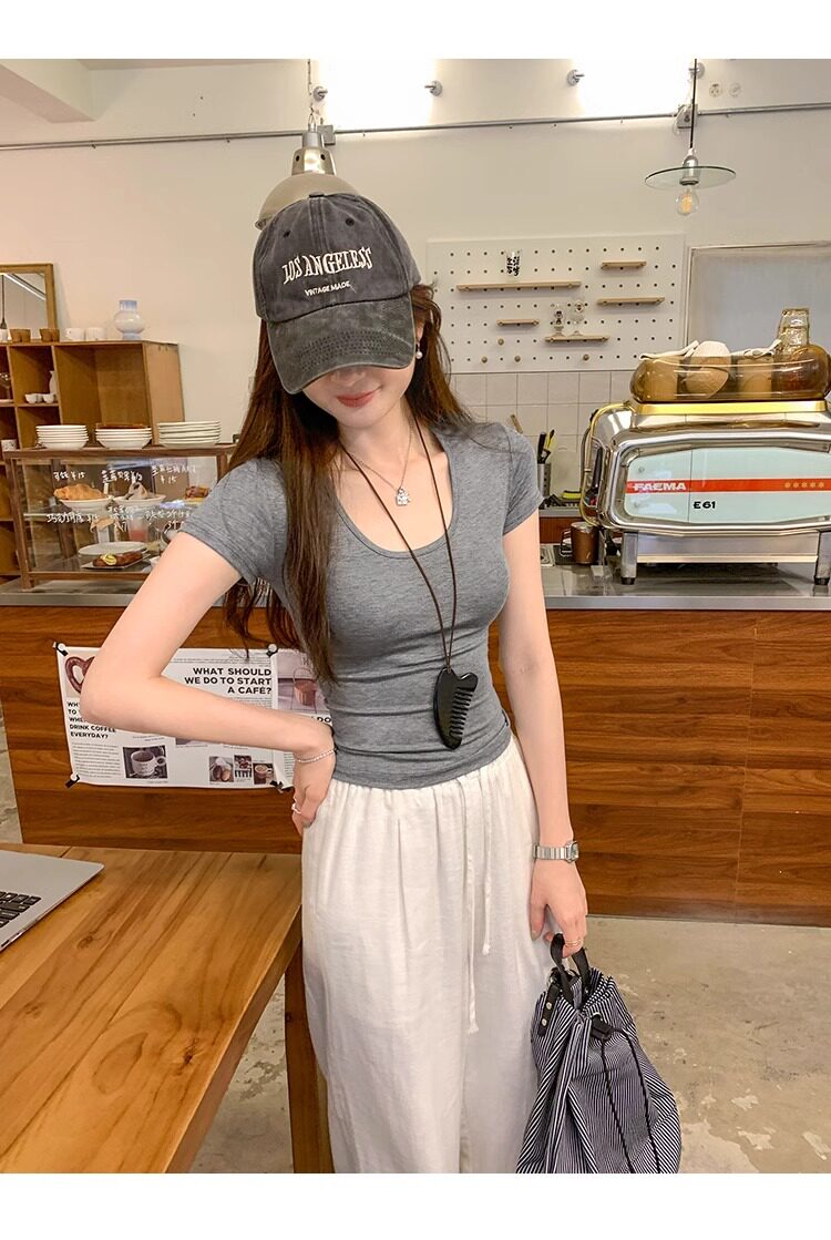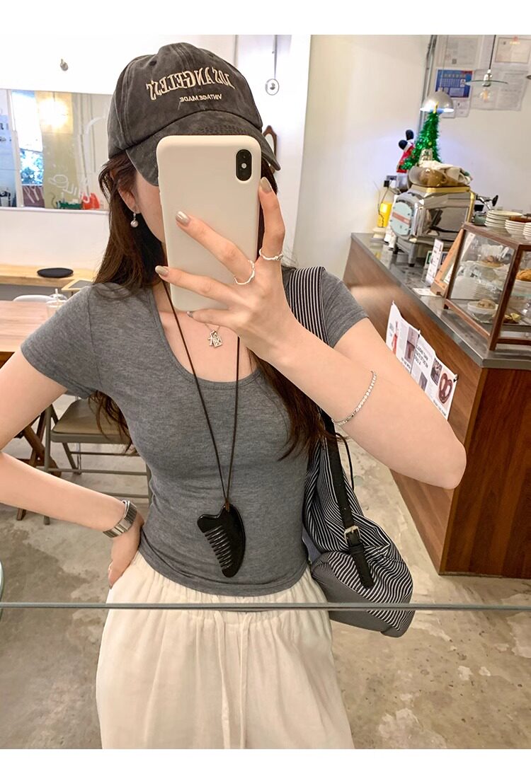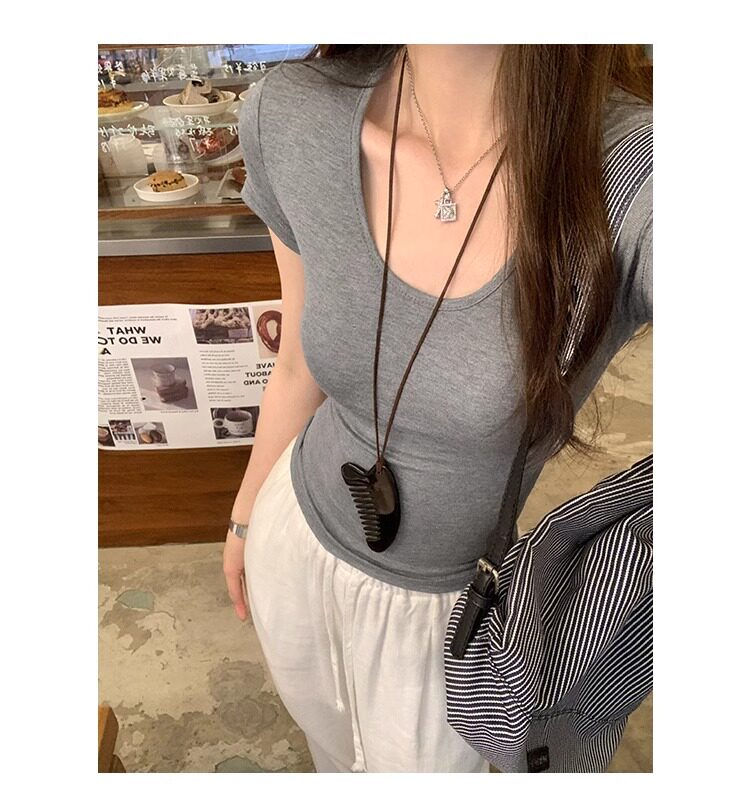 Spicy Girl Style Elastic U-Neck Short-Sleeve T-Shirt for Women, Summer Tight-Fitting, Figure-Flattering, Slim-Fit Short Base Shirt, Gray Crop Top