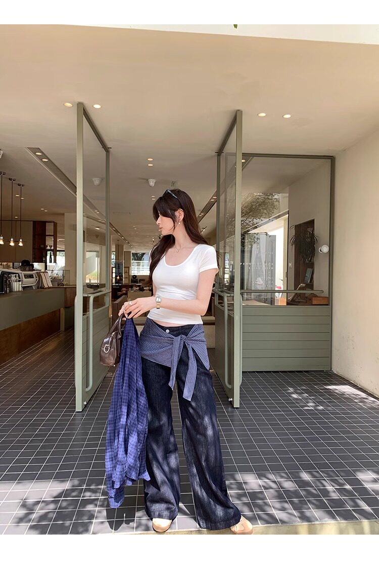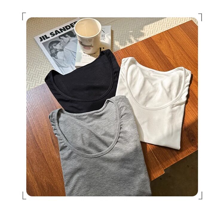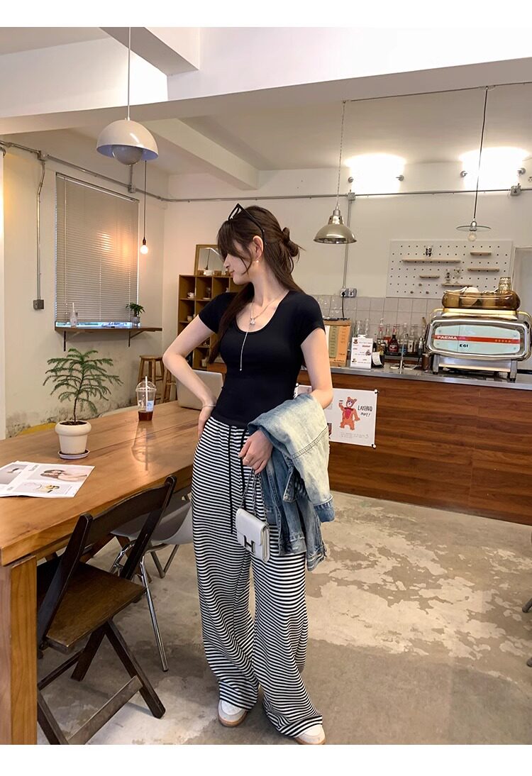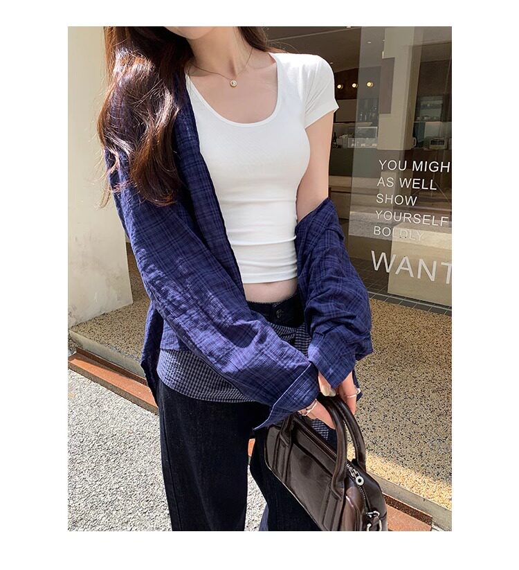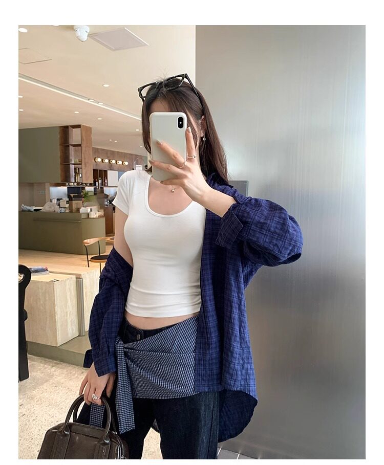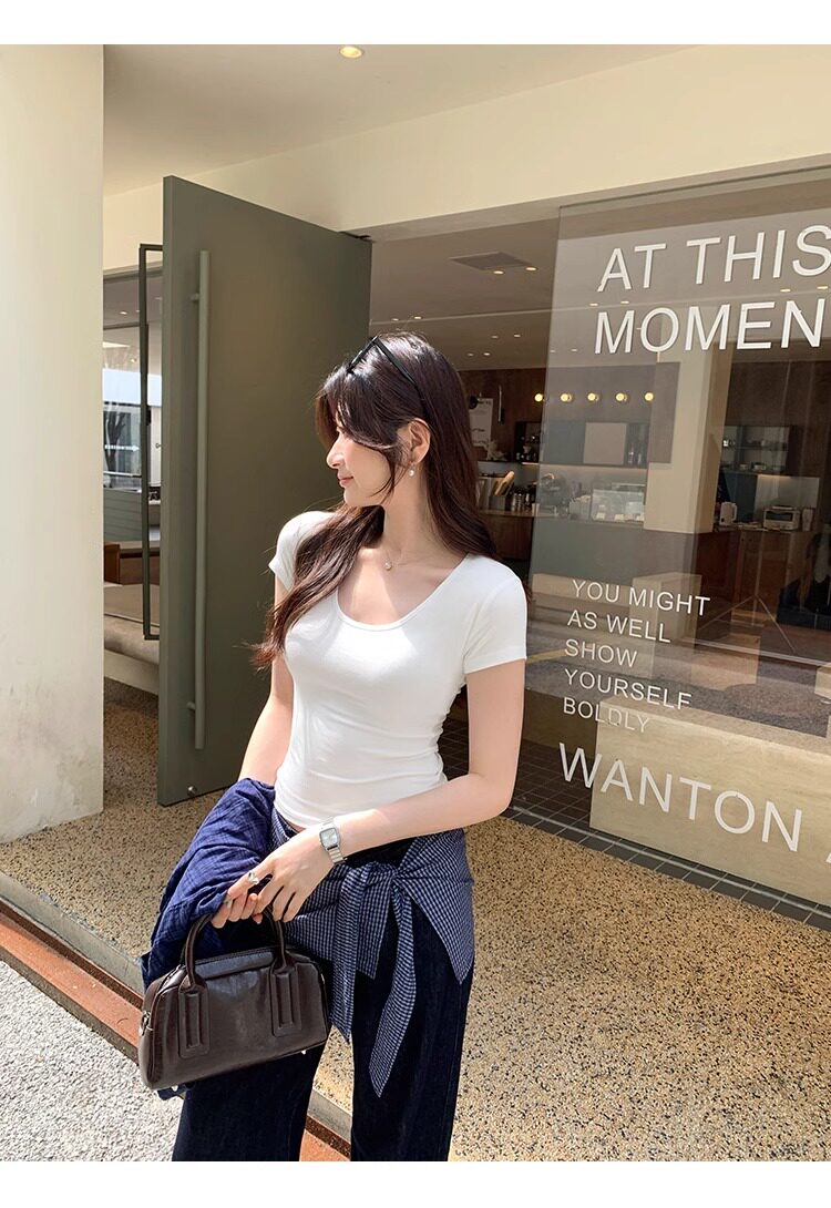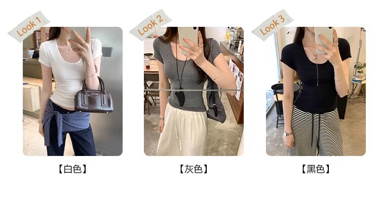 Spicy Girl Style Elastic U-Neck Short-Sleeve T-Shirt for Women, Summer Tight-Fitting, Figure-Flattering, Slim-Fit Short Base Shirt, Gray Crop Top