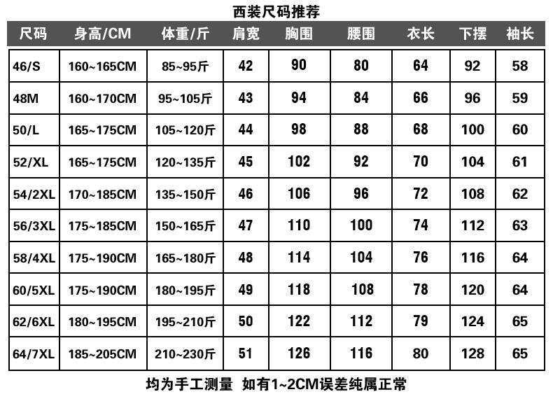 Size 48/M recommended 95-105 Jin Jin is equal to 0.5 kg,50/L recommended 105-120Jin Jin is equal to 0.5kg,52/XL recommended 120-135Jin Jin is equal to 0.5kg,54/2XL recommends 135-148 Jin Jin equal to 0.5 kg,56/3XL recommends 148-160Jin Jin equal to 0.5kg,58/4XL recommended 160-175Jin Jin is equal to 0.5kg,60/5XL recommended 175-190Jin Jin is equal to 0.5kg,62/6XL recommended 190-205Jin Jin is equal to 0.5kg,64/7XL recommends 205-220Jin Jin equal to 0.5kg