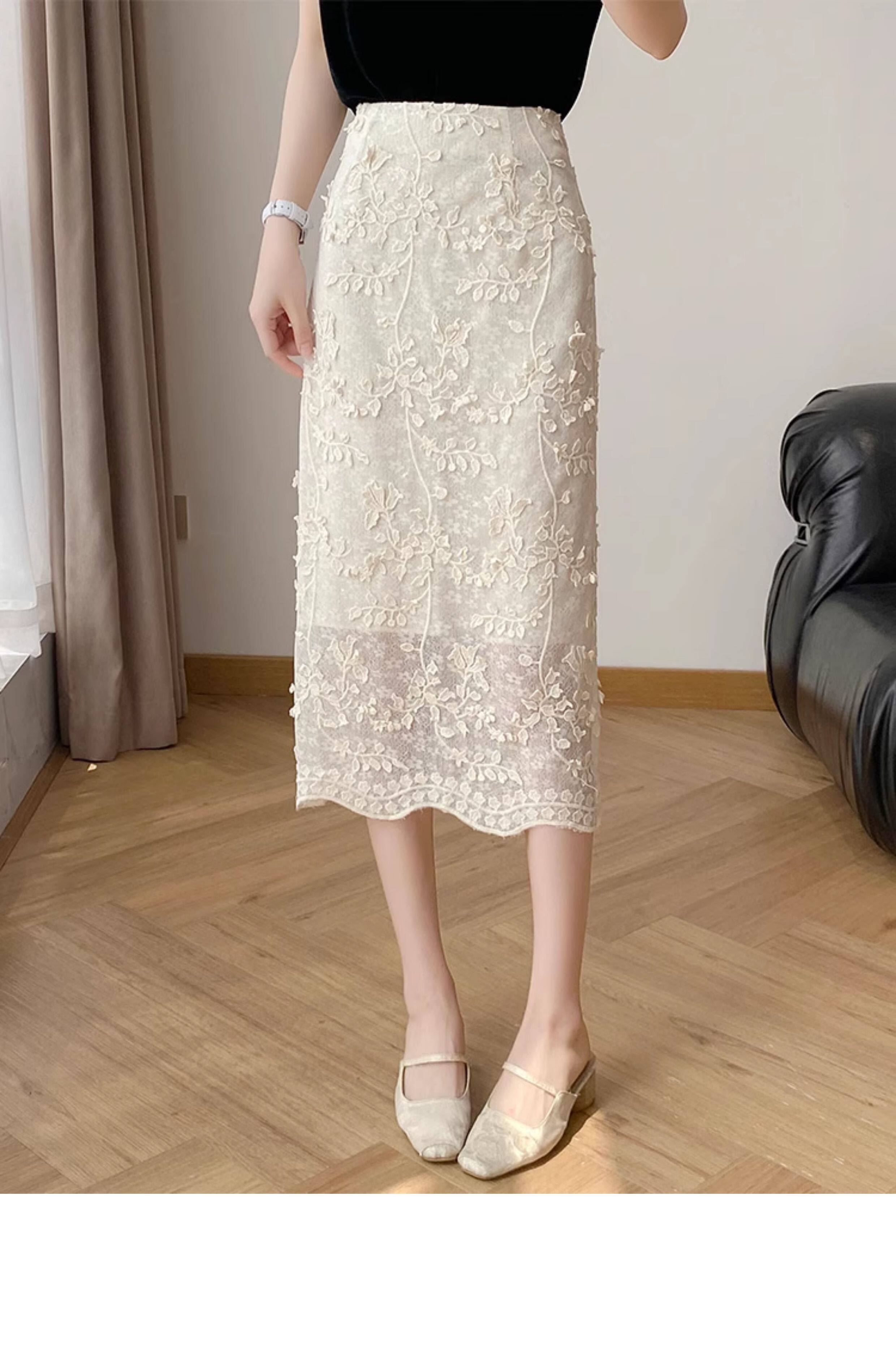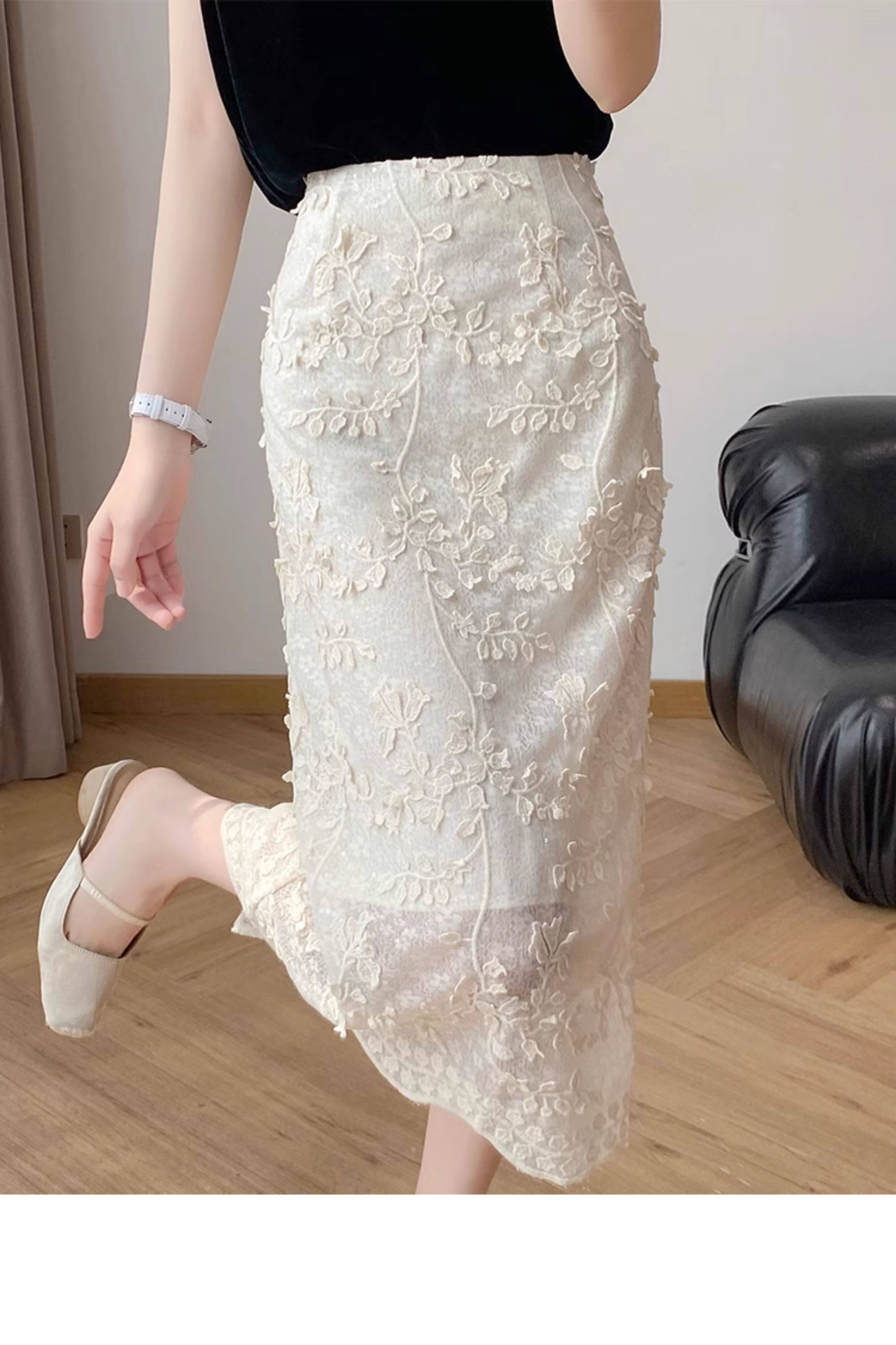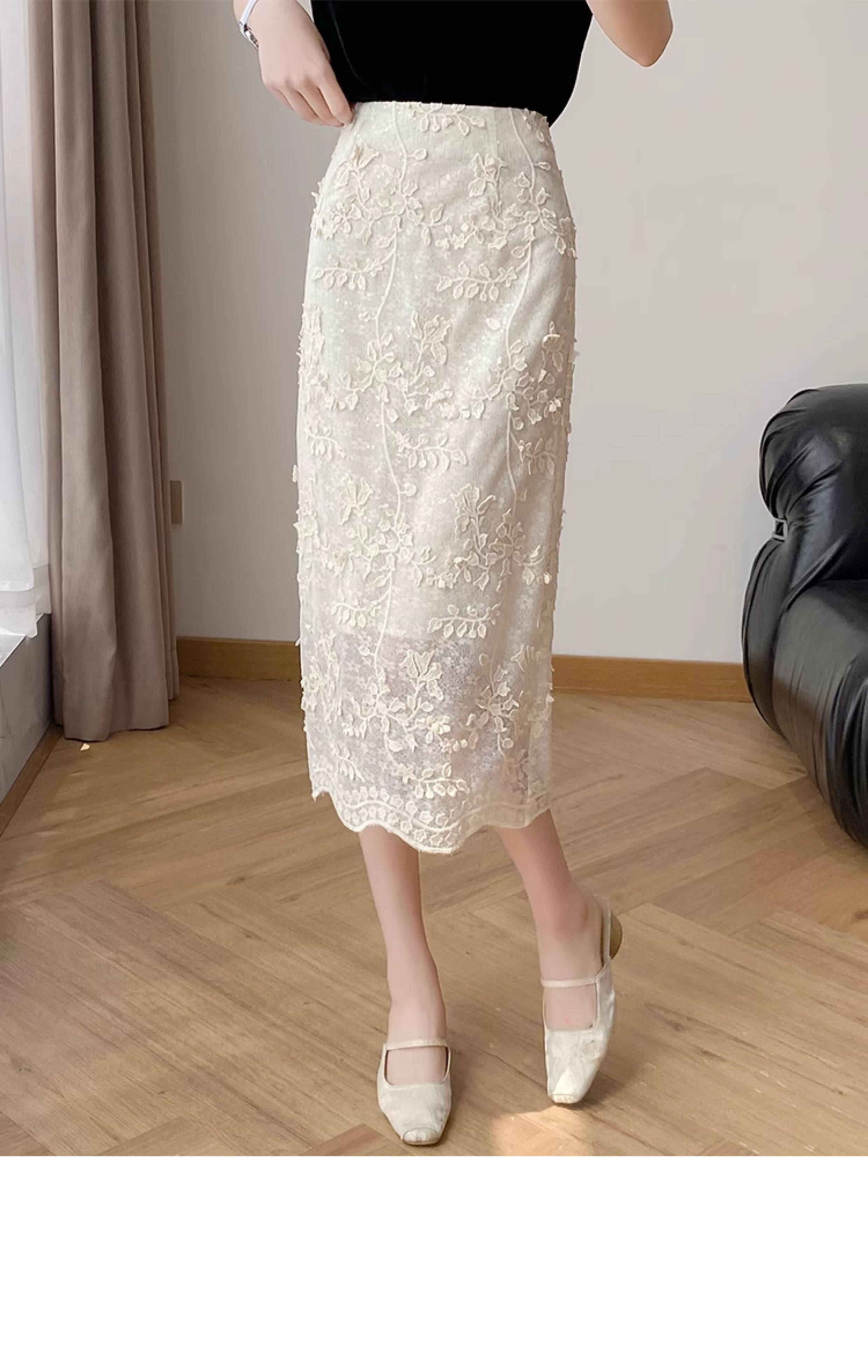 Lingze Xitong White Summer Skirt for Women with Three-Dimensional Lace Embroidery, Straight-Cut, Chanel-Style Midi Skirt