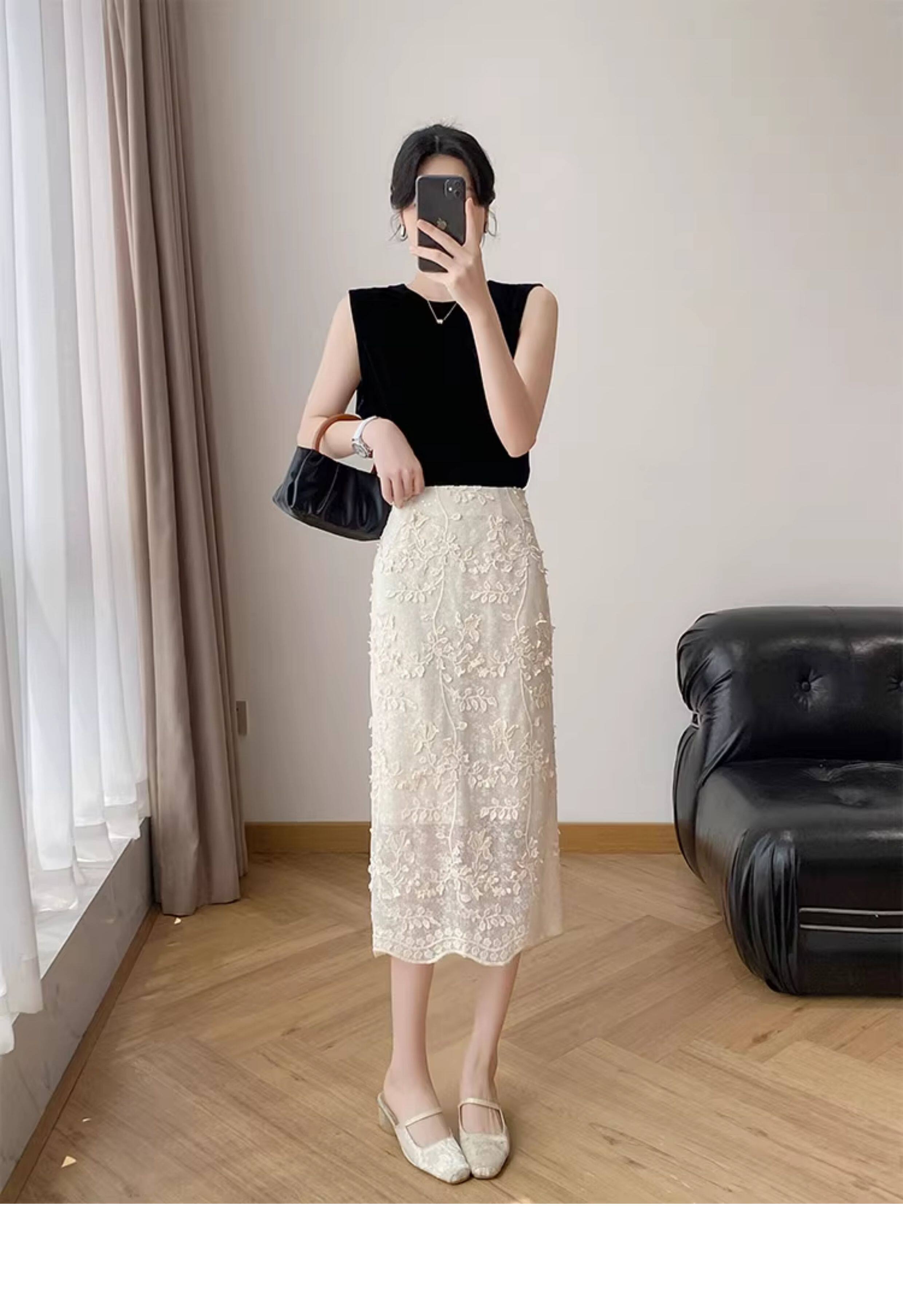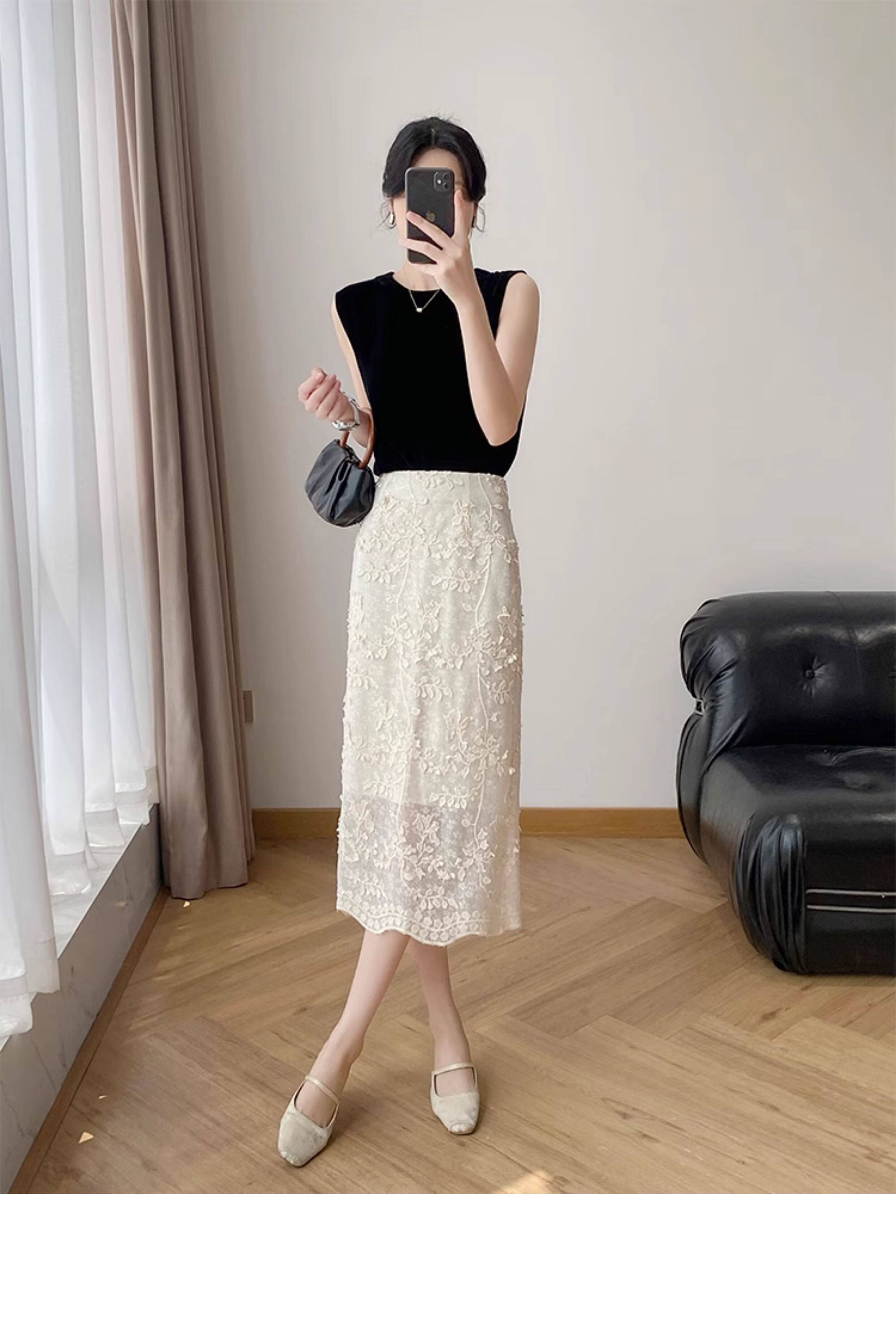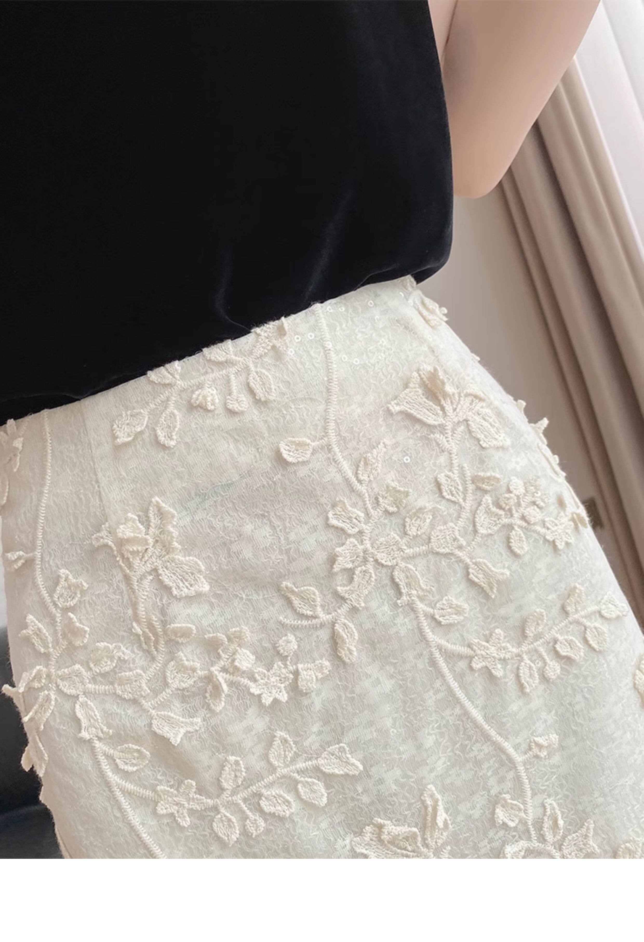 Lingze Xitong White Summer Skirt for Women with Three-Dimensional Lace Embroidery, Straight-Cut, Chanel-Style Midi Skirt