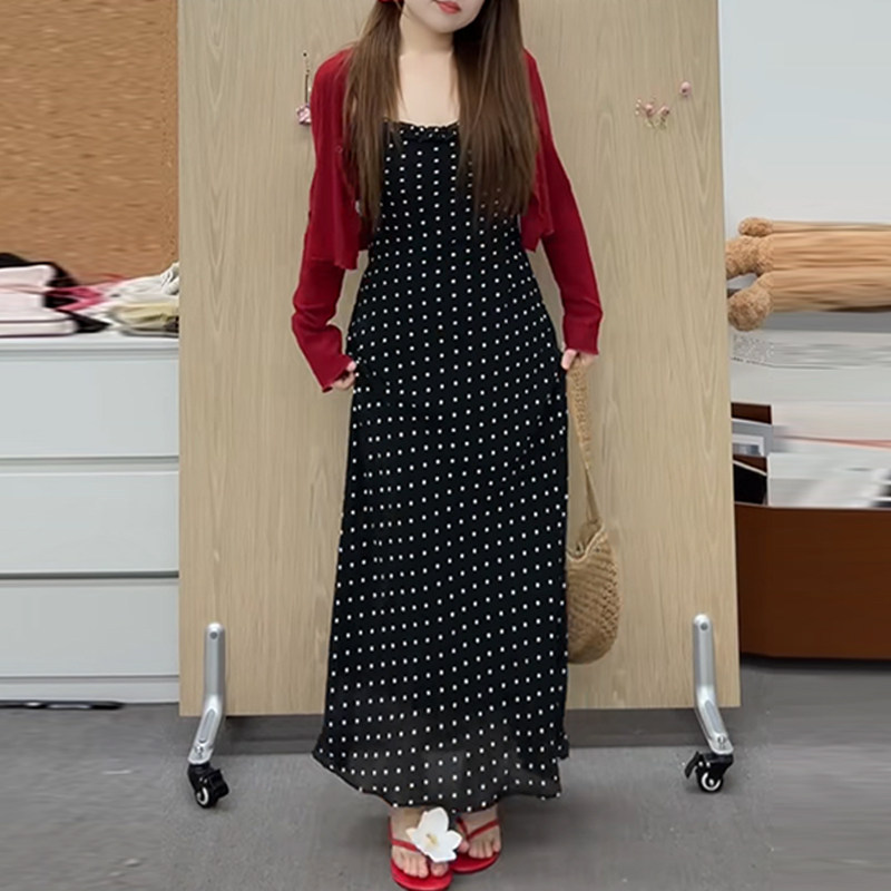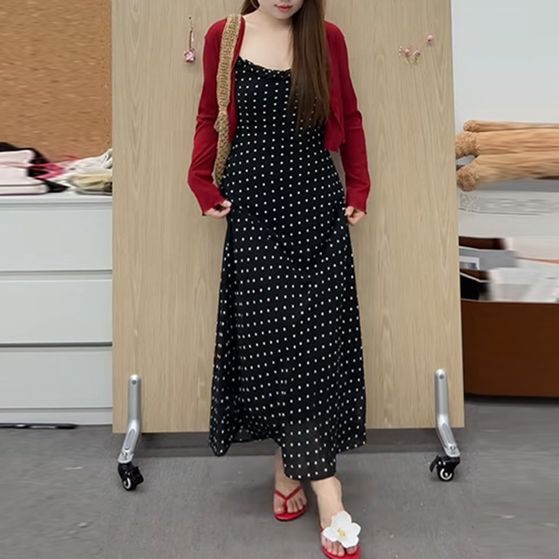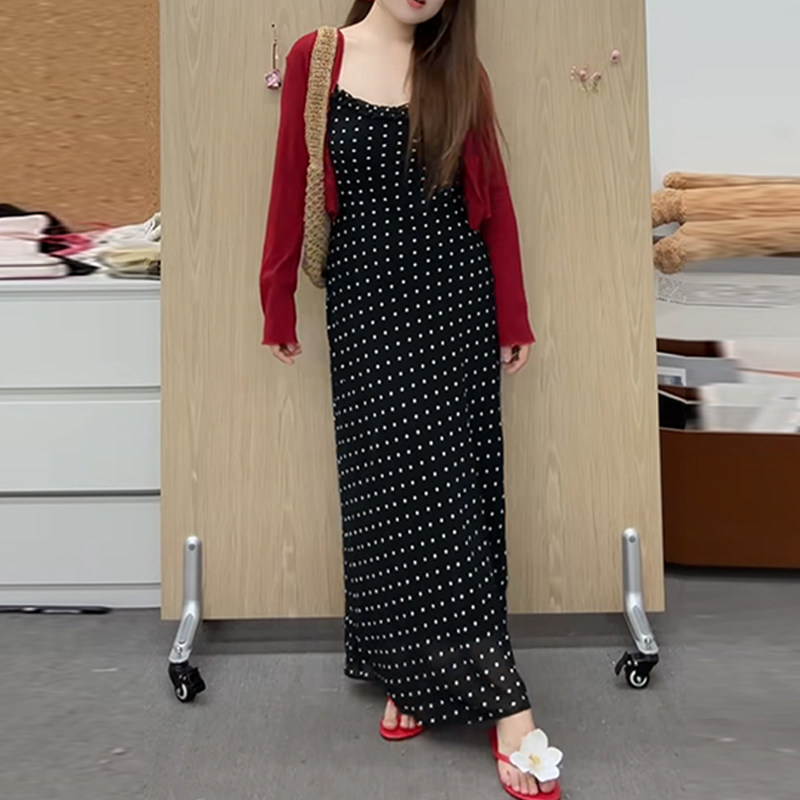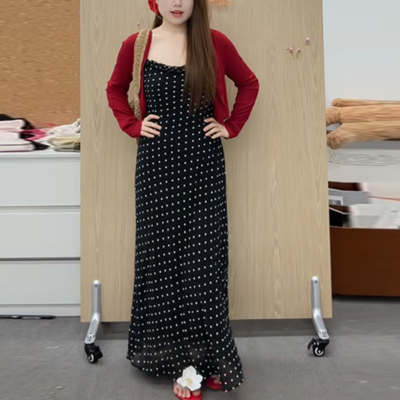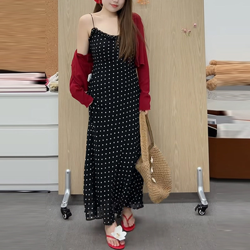Plus-Size French Retro Polka-Dot Spaghetti Strap Dress for Women, Summer Slimming Design, Flattering Vacation Long Dress