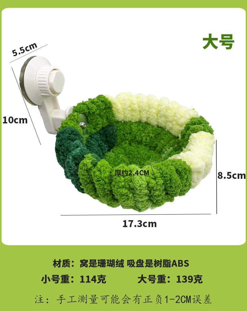 Color Classification [Small Size]Semi-Circular Forest Green with Suction Cup 19*18*10cm,[Large Size]Semi-Circular Forest Green with Suction Cup 22*20*11cm,[Small Size]Semicircular Fresh Blue with Suction Cup 19*18*10cm,[Large Size]Semicircular Fresh Blue with Suction Cup 22*20*11cm,[Small Size]Semicircular Marshmallow with Suction Cup 19*18*10cm,[Large Size]Semicircular Marshmallow with Suction Cup 22*20*11cm,[Wool Platform]Forest Green 16*7cm,[Wool Platform]Sea of ​​Clouds 16*7cm,[Wool Platform]Cherry Blossoms Fall 16*7cm,[Wool Platform]Marshmallow 16*7cm,[Wool Platform]Grapefruit 16*7cm,[Wool Loop Swing]Forest Green 17*10cm,[Wool Loop Swing]Sea of ​​Clouds 17*10cm,[Wool Loop Swing]Cherry Blossoms Fall 17*10cm,[Wool Loop Swing]Marshmallow 17*10cm,[Wool Loop Swing]Grapefruit 17*10cm,[Wool Bed]Forest Green (Free Pillow + Nest Pad) 27*16*10cm,[Wool Bed]Sea of ​​Clouds (Free Pillow + Nest Pad) 27*16*10cm,[Wool Bed]Falling Cherry Blossoms (Free Pillow + Nest Pad) 27*16*10cm,[Wool Bed]Marshmallow (Free Pillow + Nest Pad) 27*16*10cm,[Wool Bed]Grapefruit (Free Pillow + Nest Pad) 27*16*10cm,[Velvet Flying Carpet]Forest Green 20*20*20cm,[Velvet Flying Carpet]Sea of ​​Clouds 20*20*20cm,[Velvet Flying Carpet]Cherry Blossoms Fall 20*20*20cm,[Velvet Flying Carpet]Marshmallow 20*20*20cm,[Velvet Flying Carpet]Grapefruit 20*20*20cm
