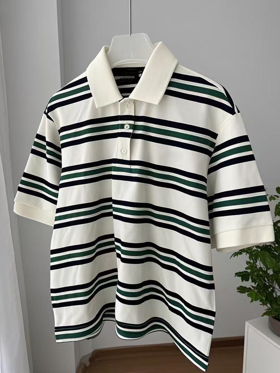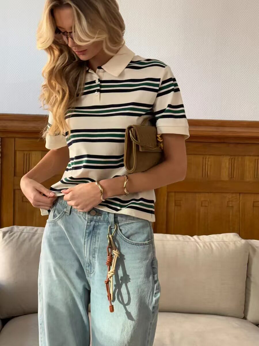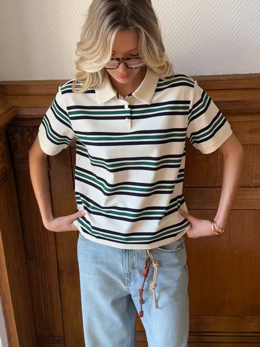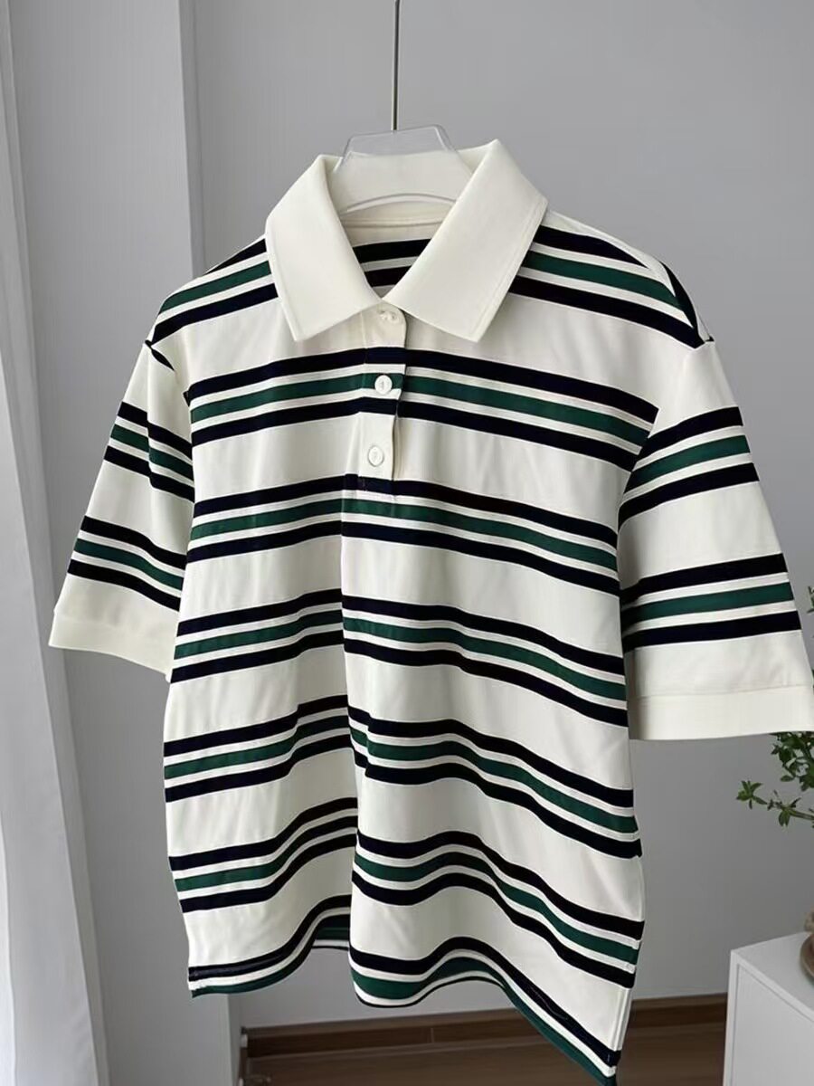 European and American Style New Fashion Retro Striped Short-Sleeved T-Shirt Loose Polo Shirt Top Loose Striped Top
