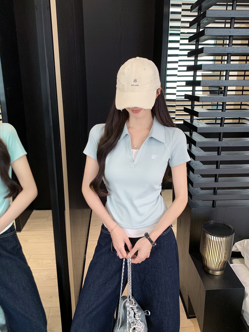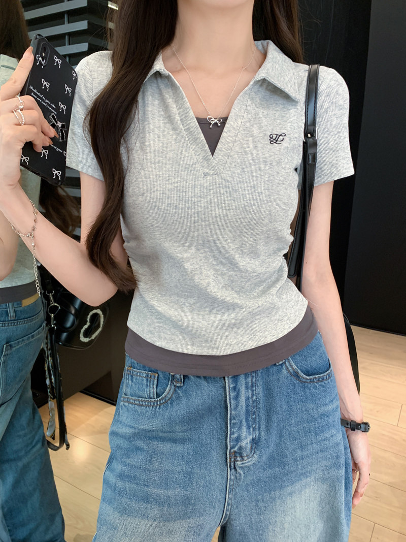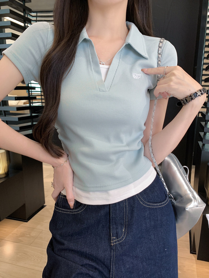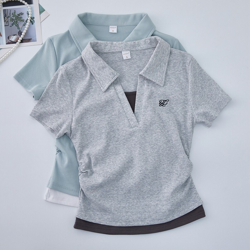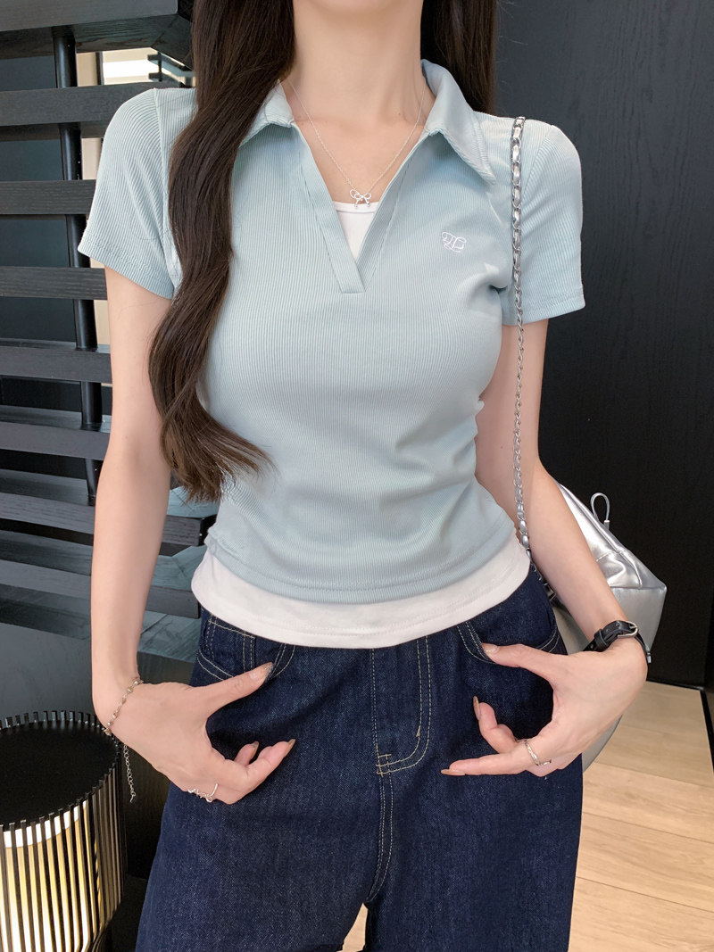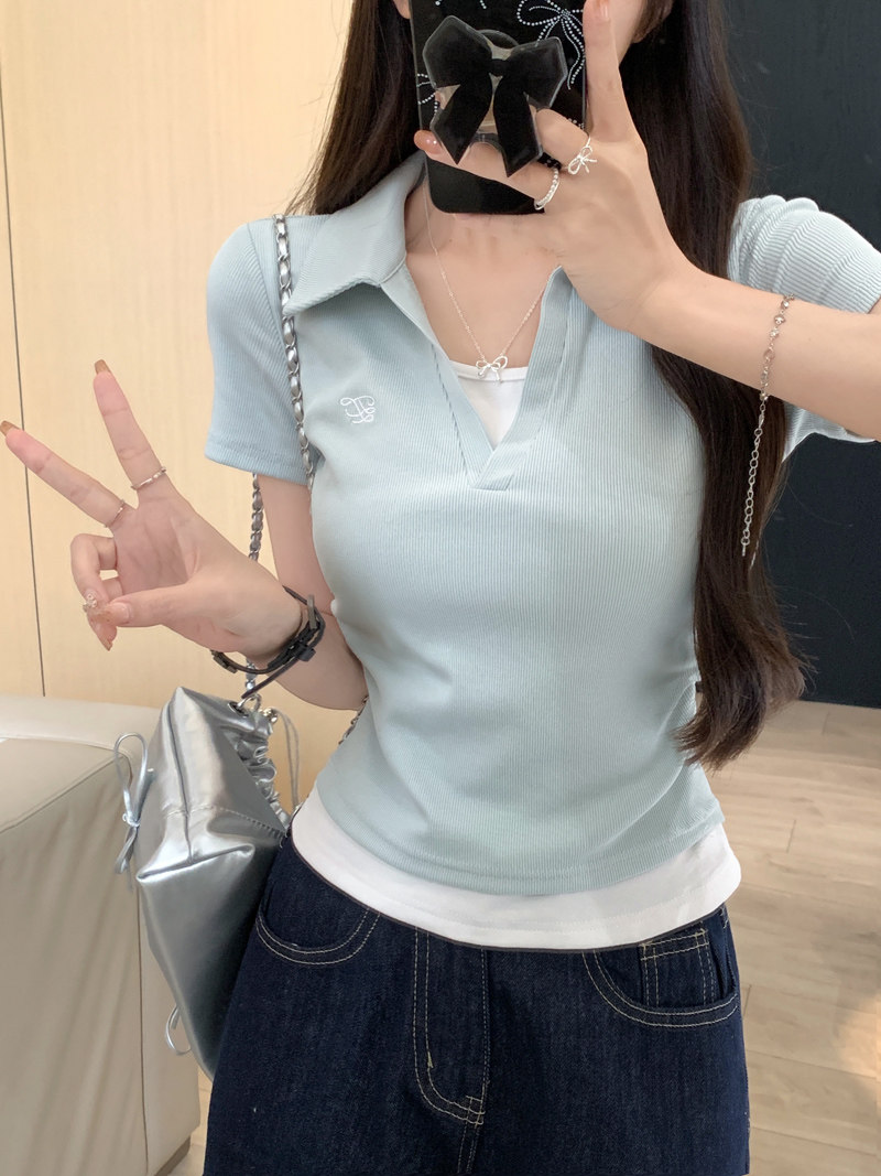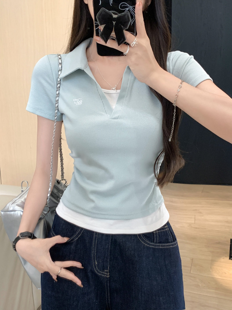 Clever Side Ruching Design Short-Sleeve Faux Two-Piece Women's Summer New Style Fresh Blue Polo Collar Slim-Fit Top