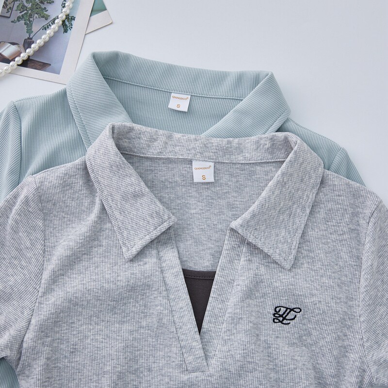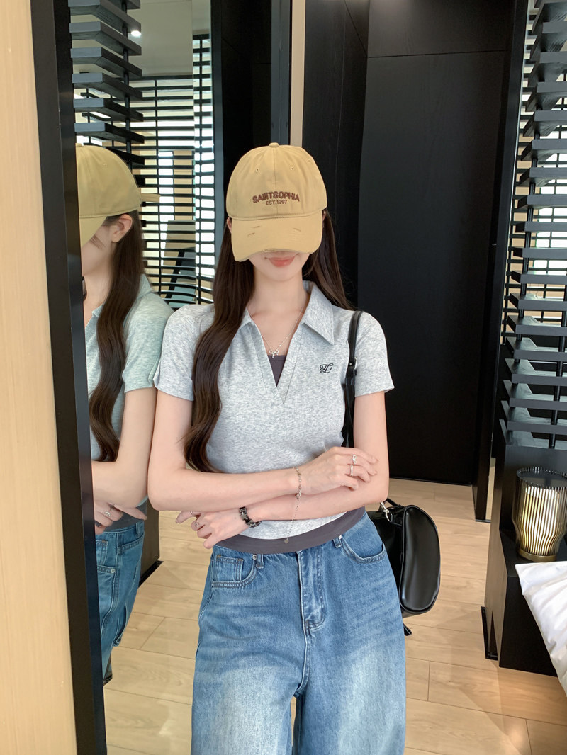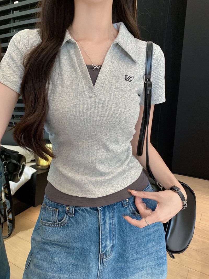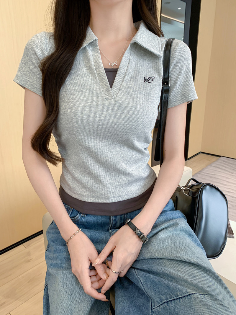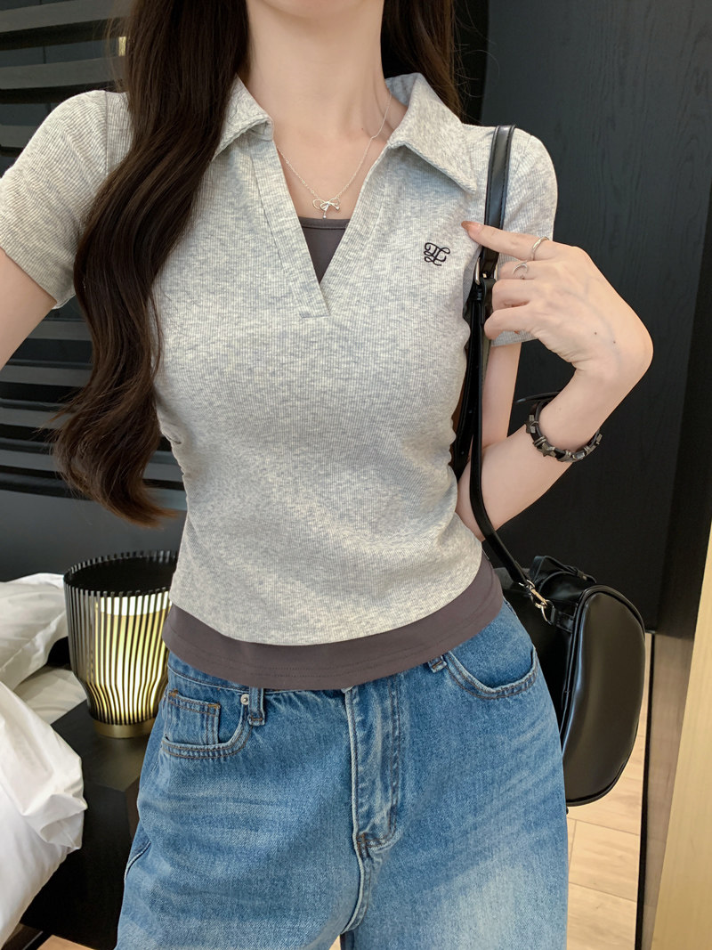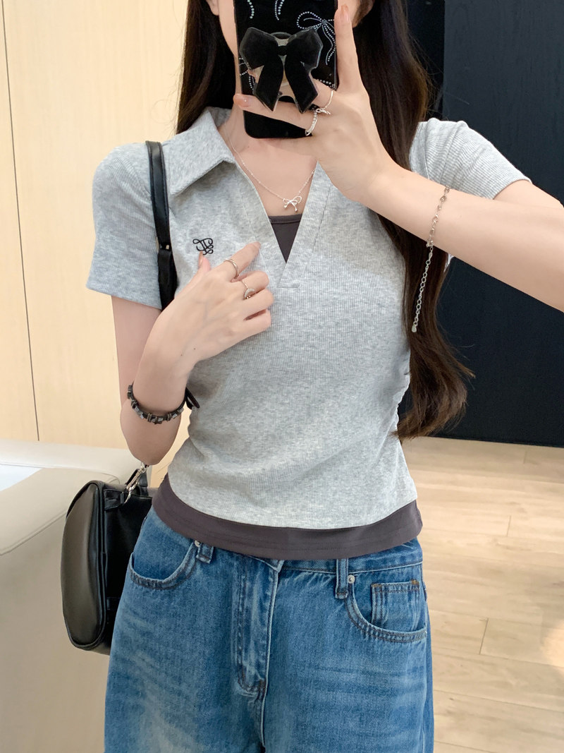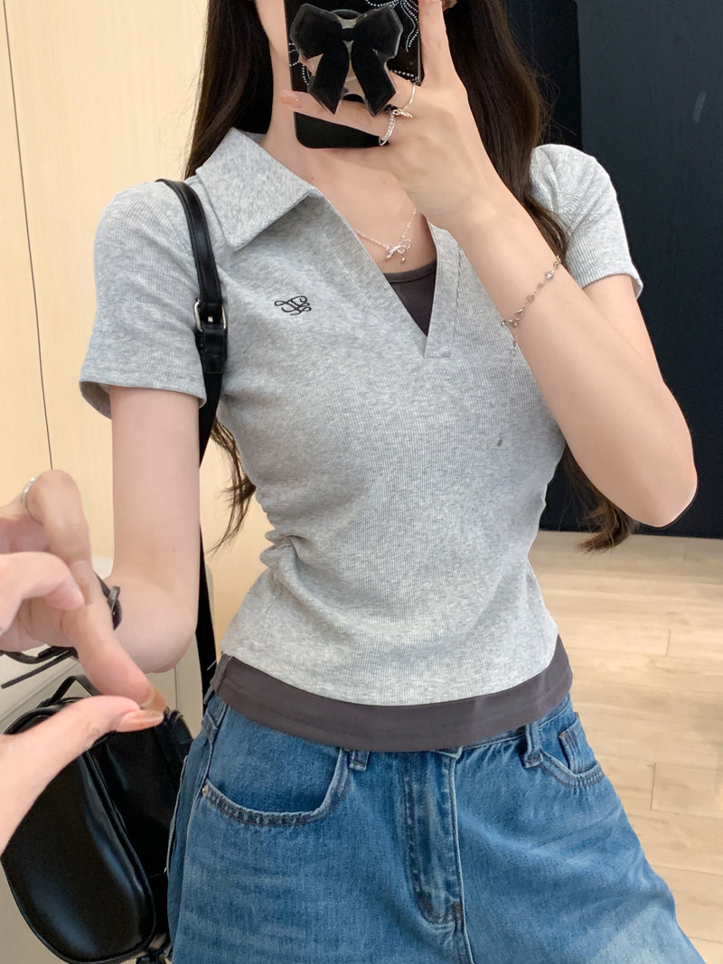 Clever Side Ruching Design Short-Sleeve Faux Two-Piece Women's Summer New Style Fresh Blue Polo Collar Slim-Fit Top