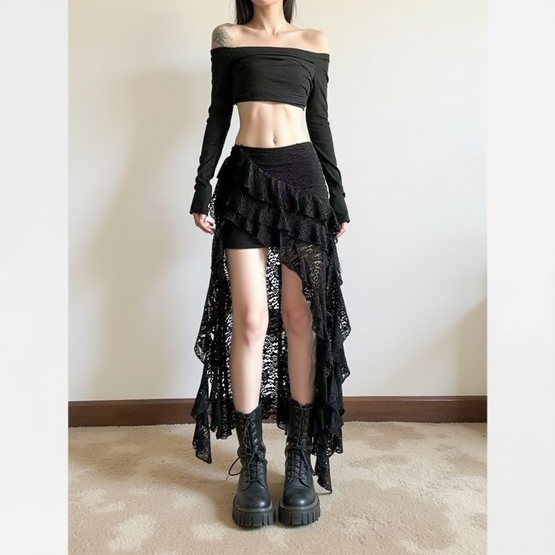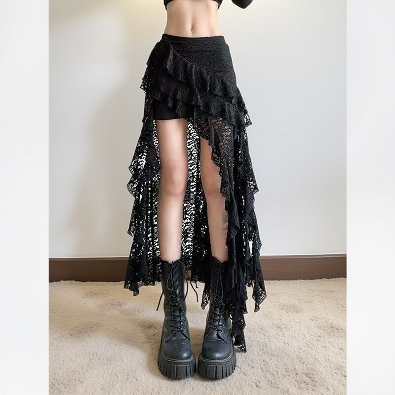 Plus-Size French-Style Spicy Girl Irregular Lace Patchwork Skirt, New High-Waisted Design with Ribbon Short Skirt