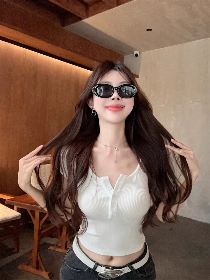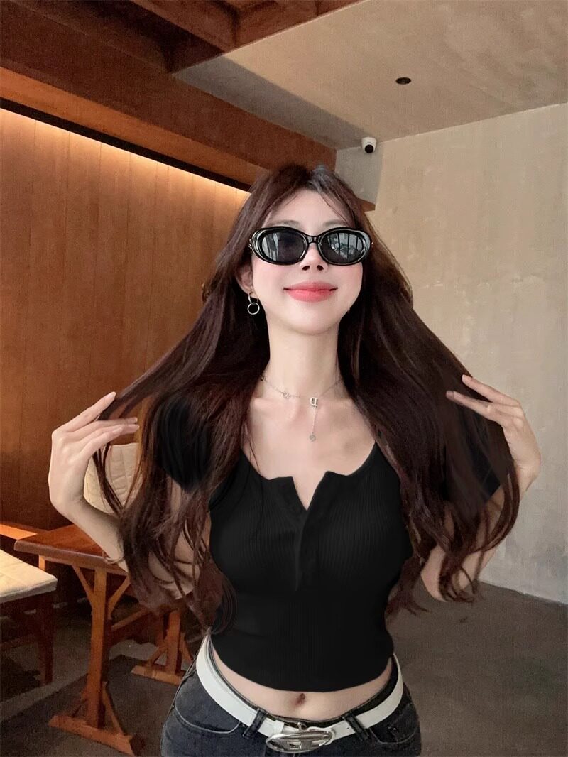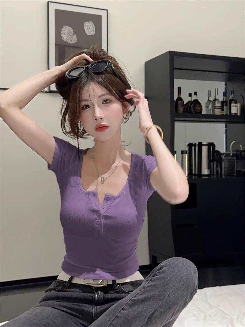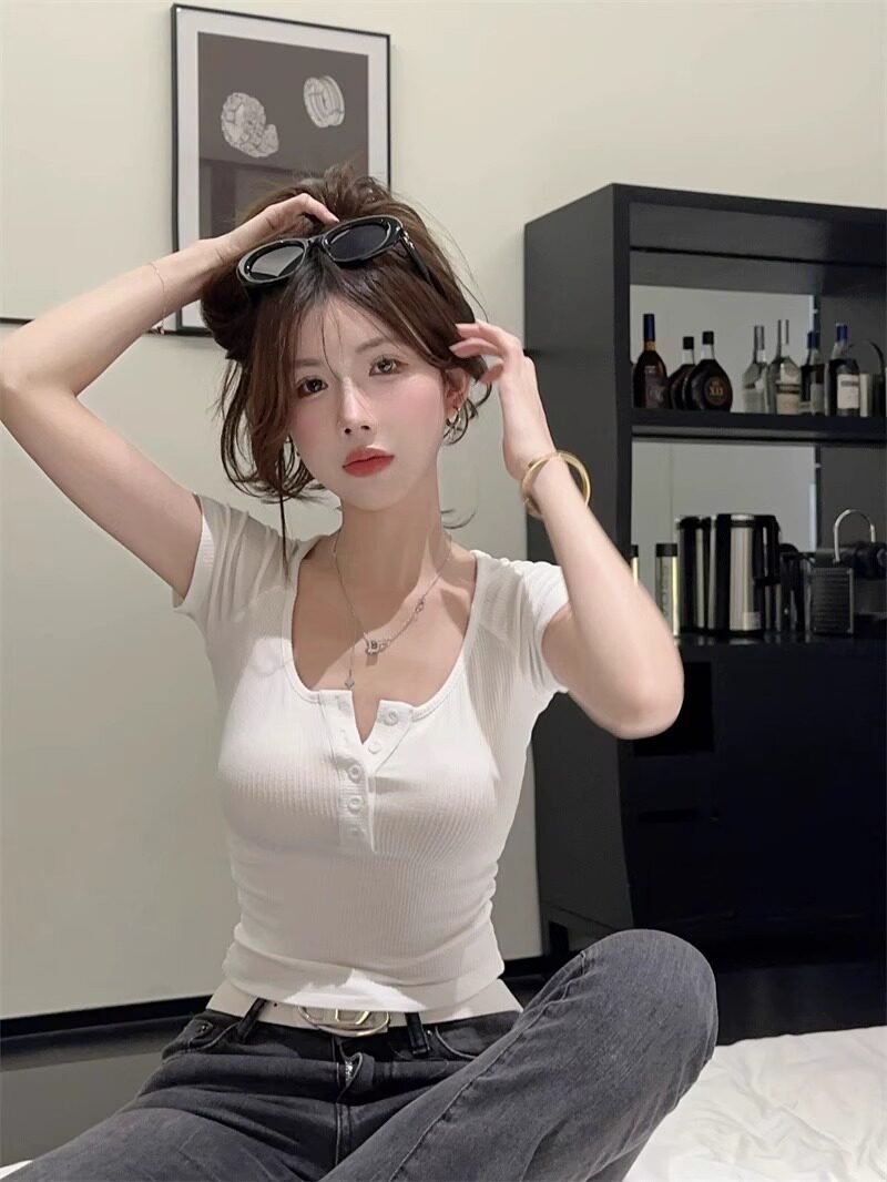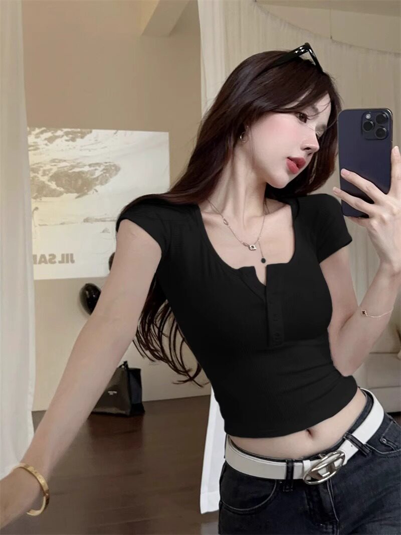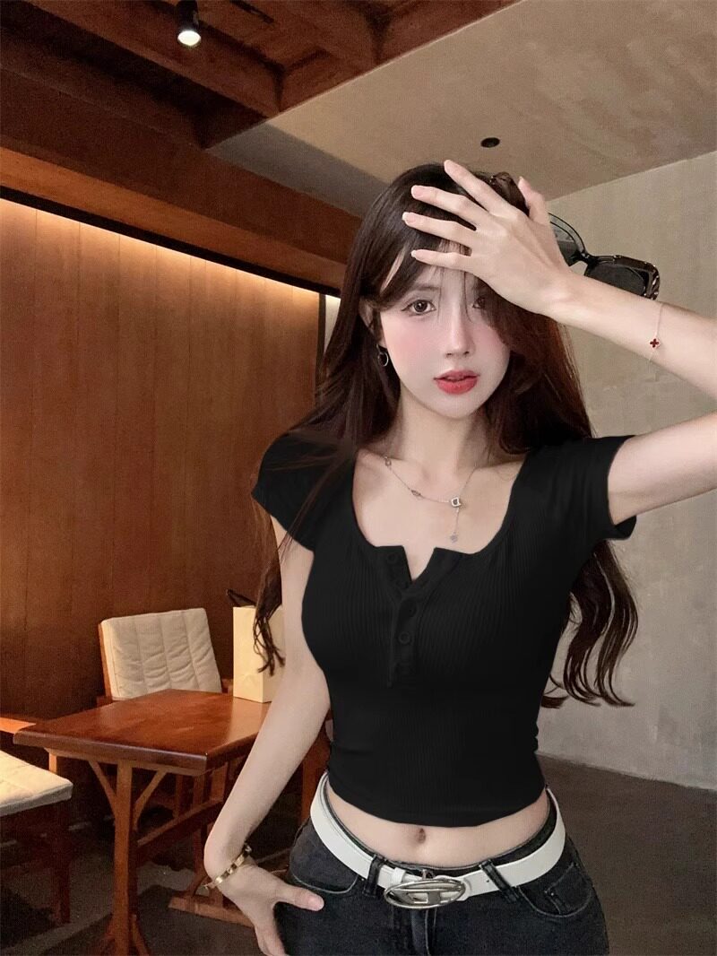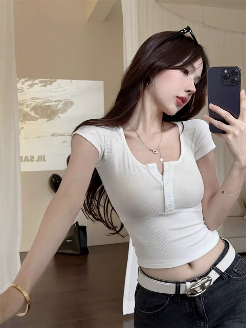 Trendy Short-Sleeve U-Neck T-Shirt for Women, Summer 2025 New Design, Unique Button-Up, Slim-Fit, Short Top
