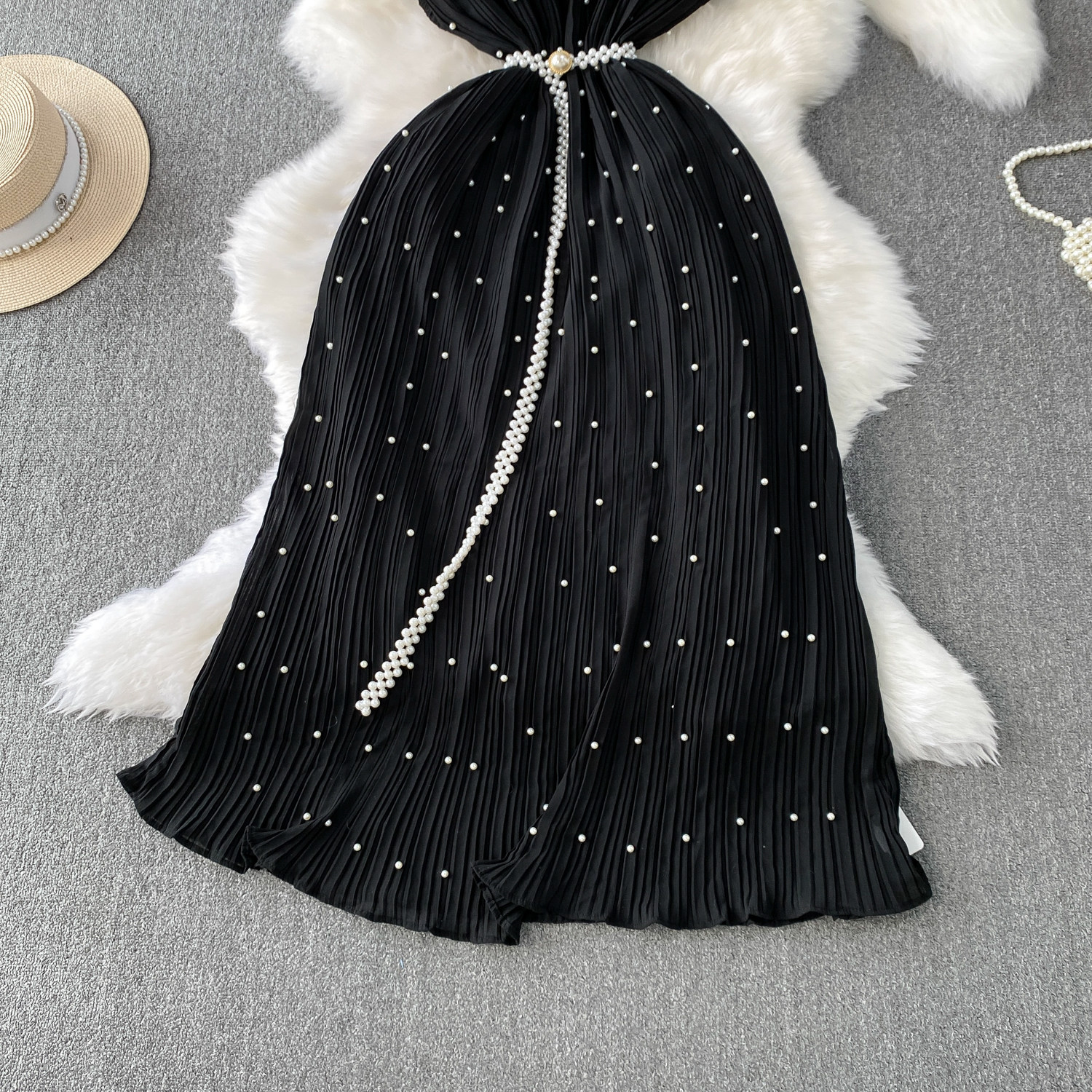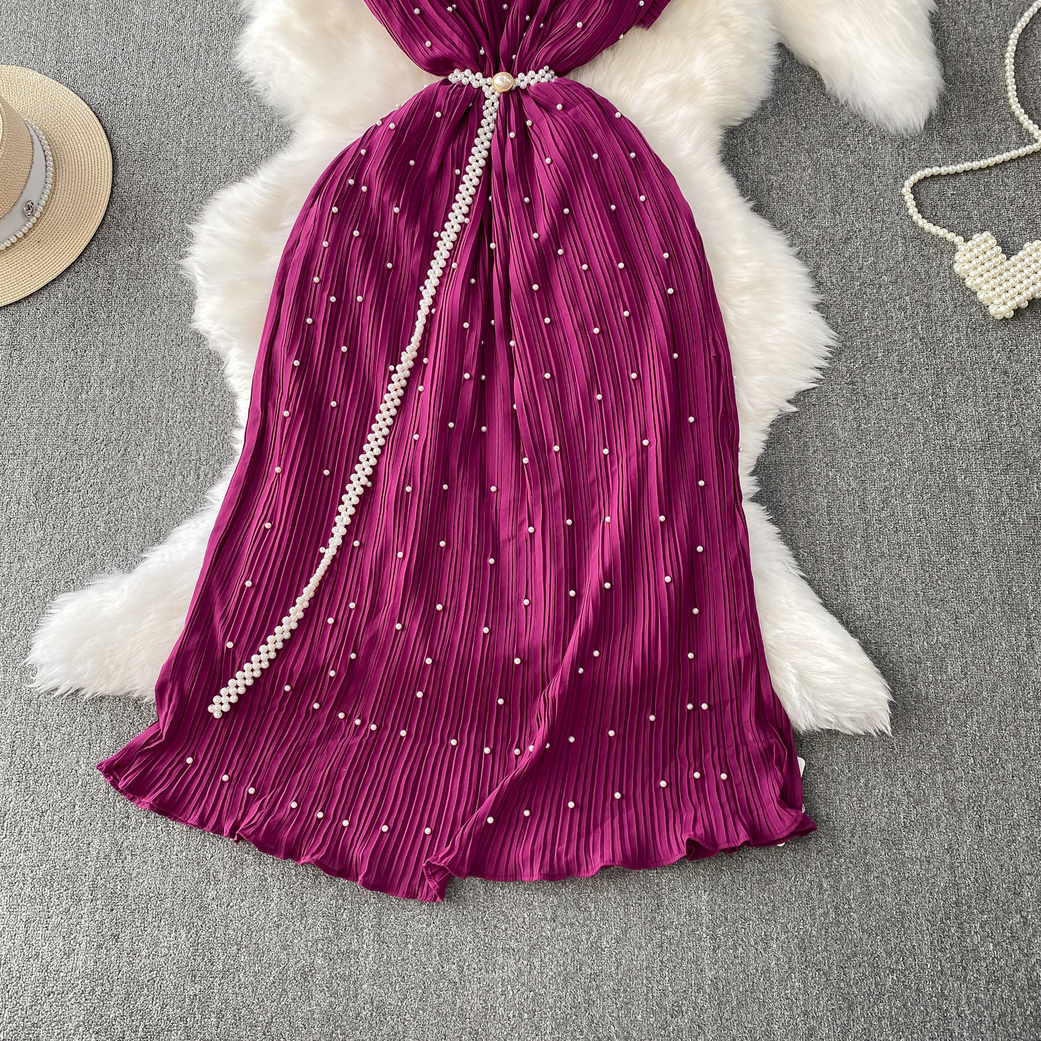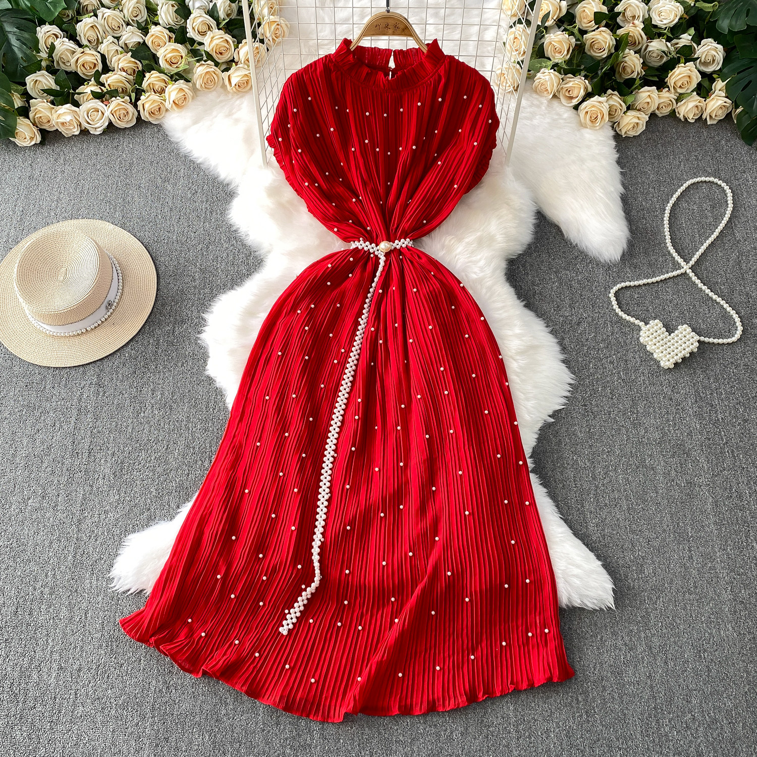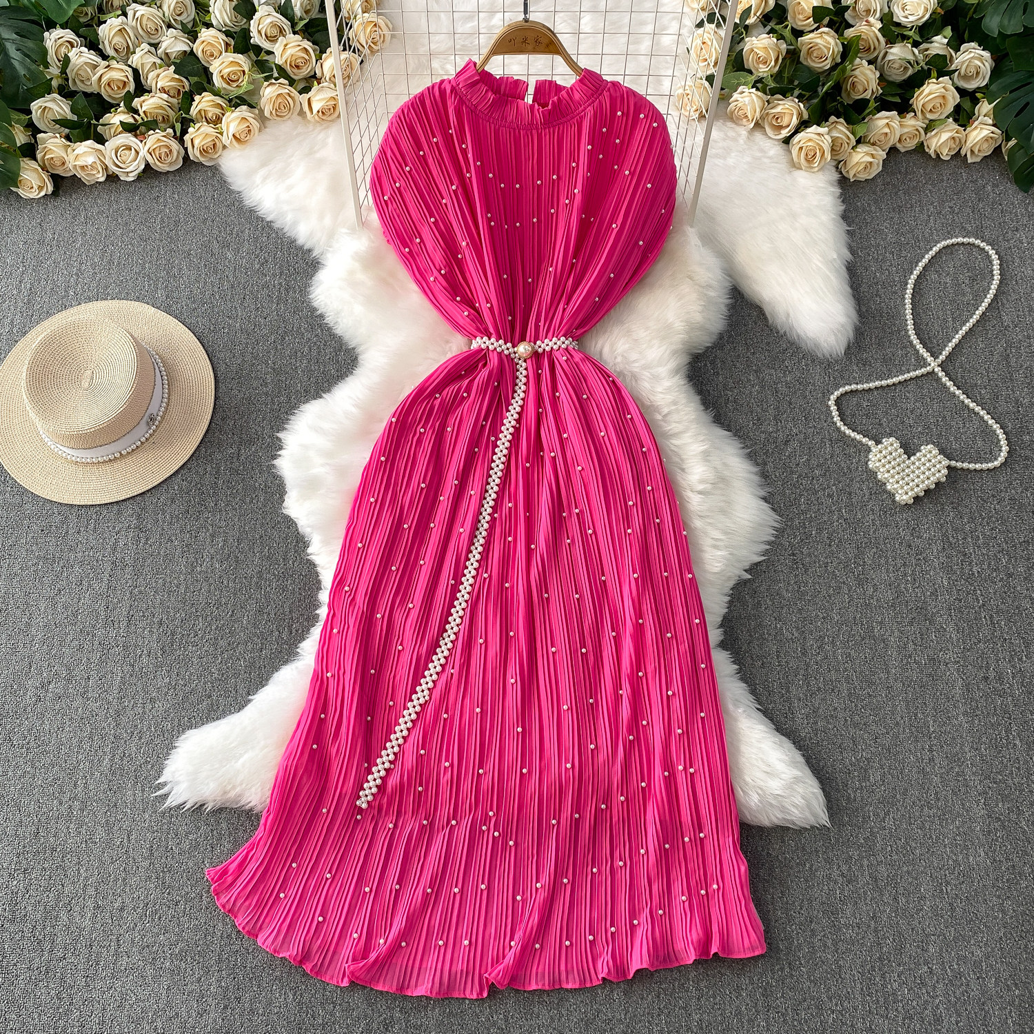 Elegant Socialite Style Heavy Pearl Trim Round Neck Dress for Women, New Summer Waist-Cinching Slimming Pleated Long Dress