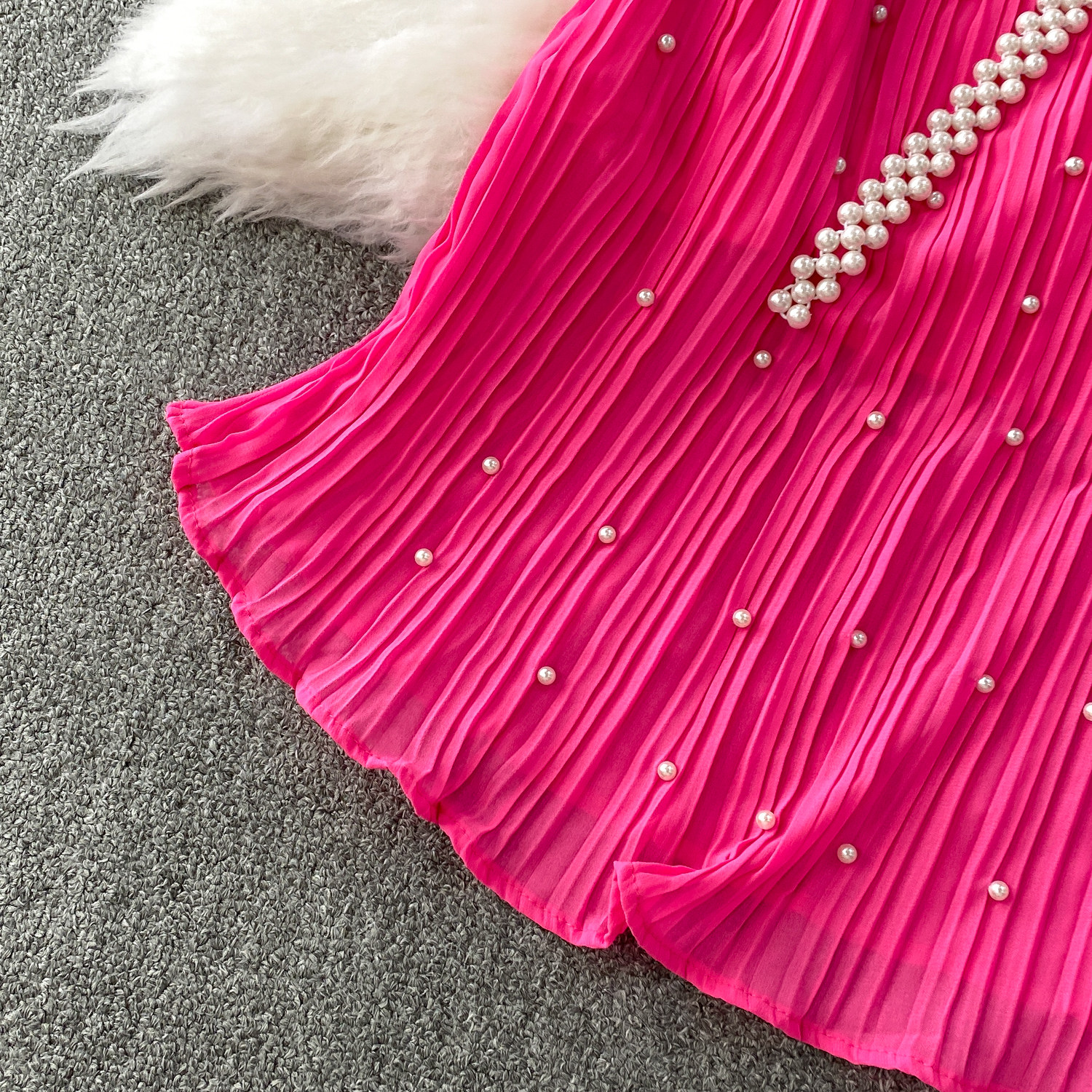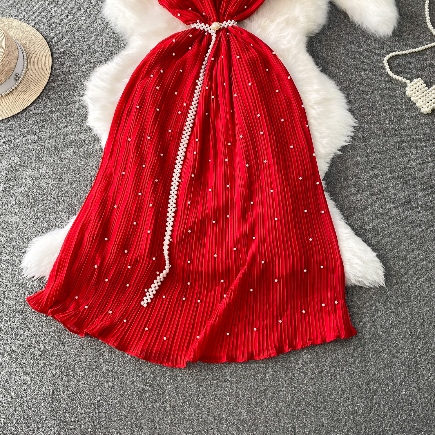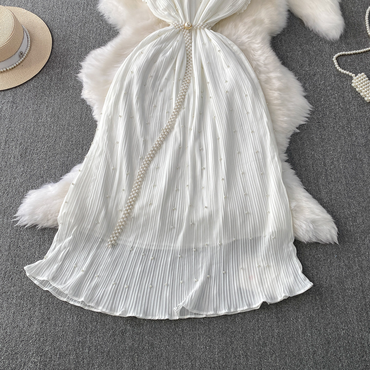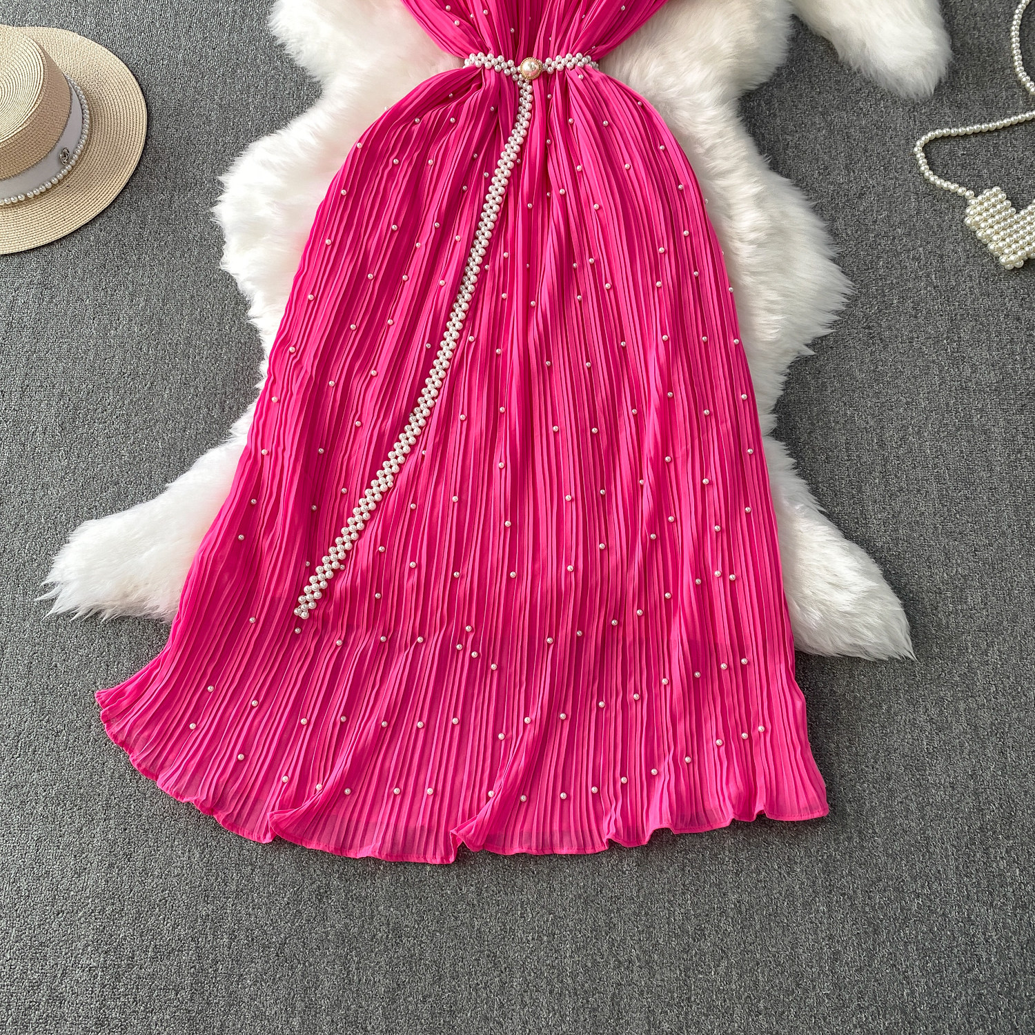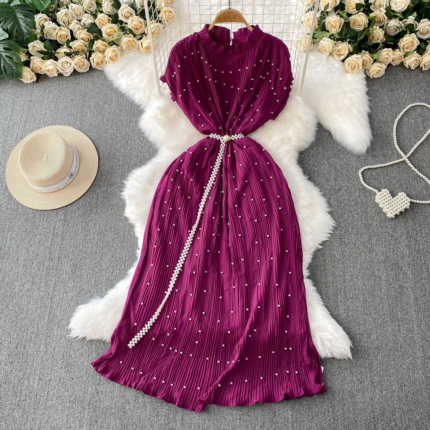 Elegant Socialite Style Heavy Pearl Trim Round Neck Dress for Women, New Summer Waist-Cinching Slimming Pleated Long Dress