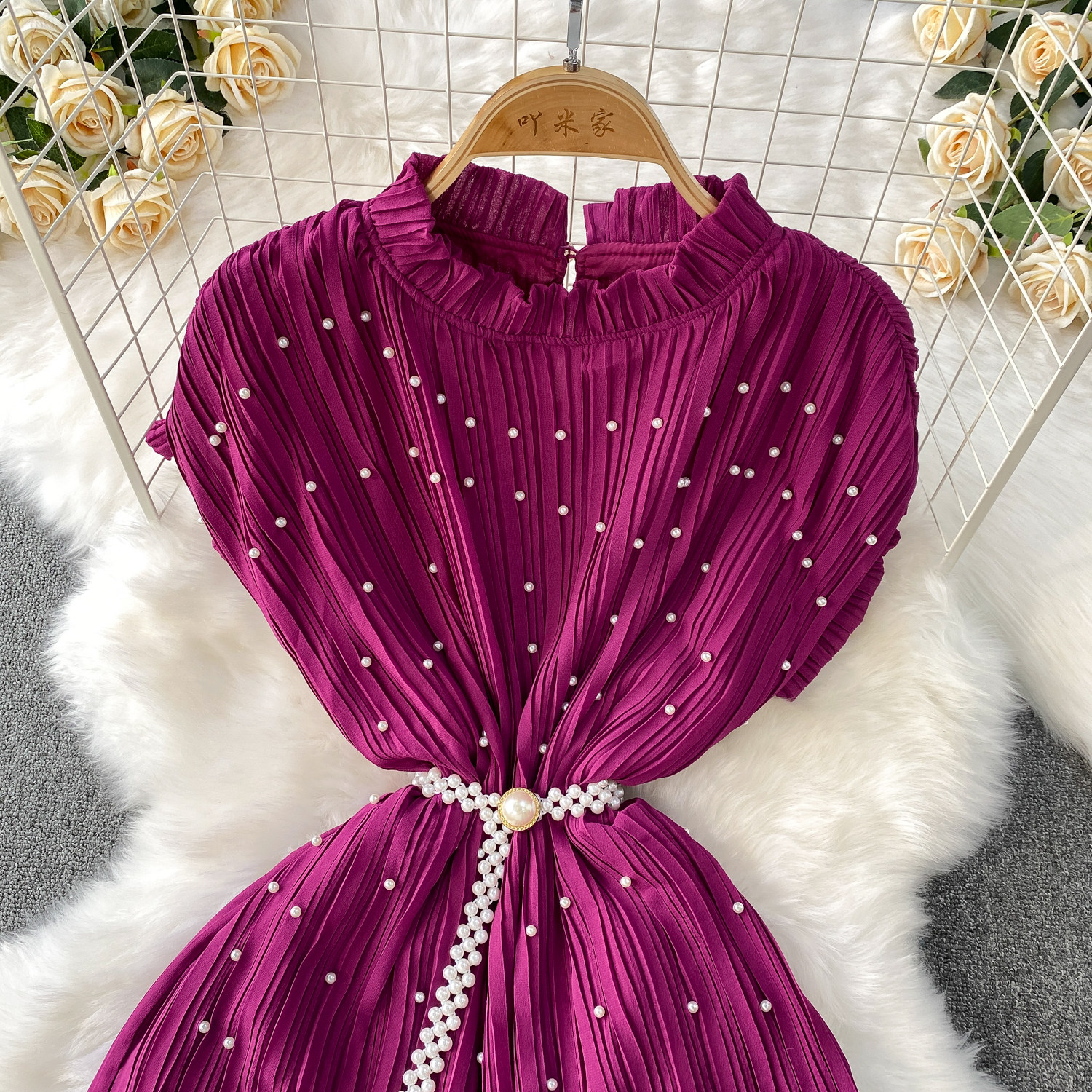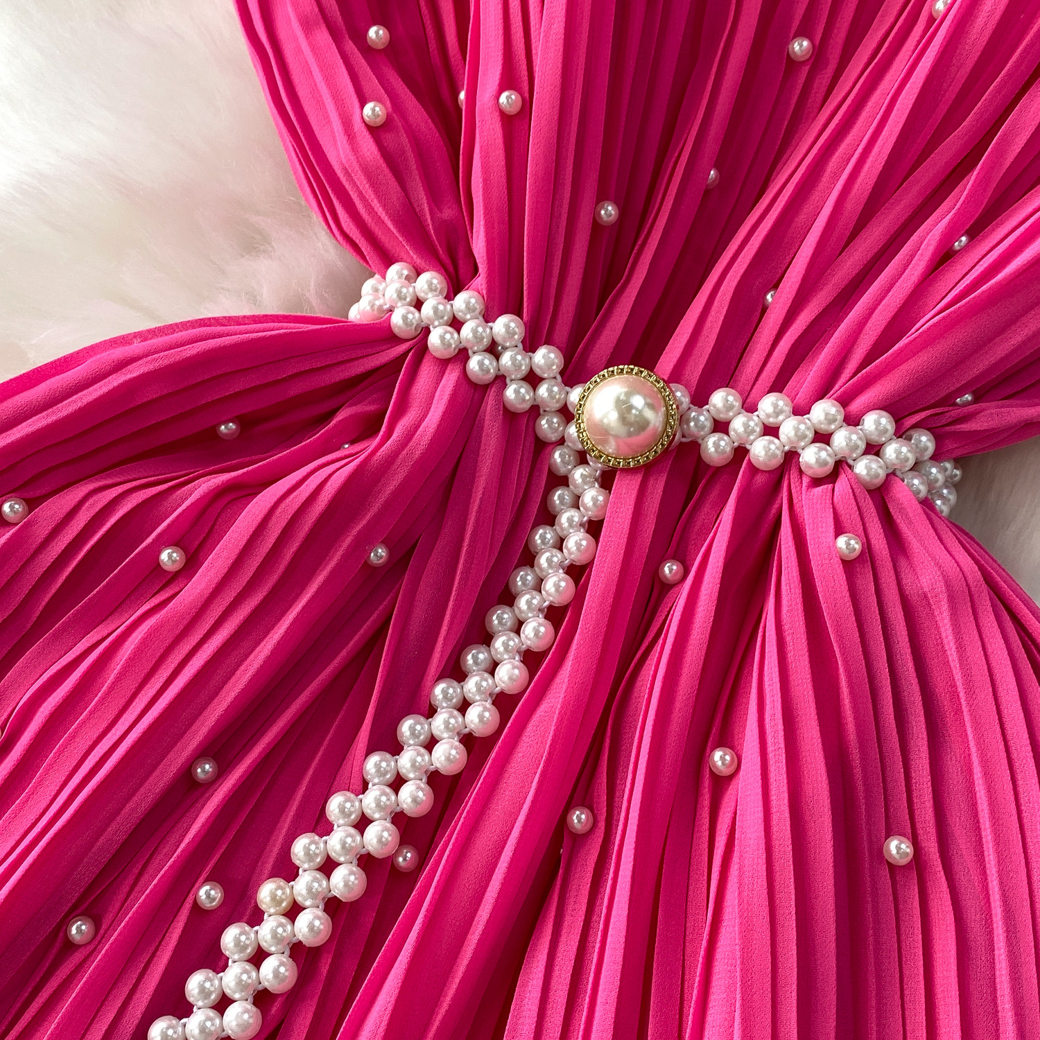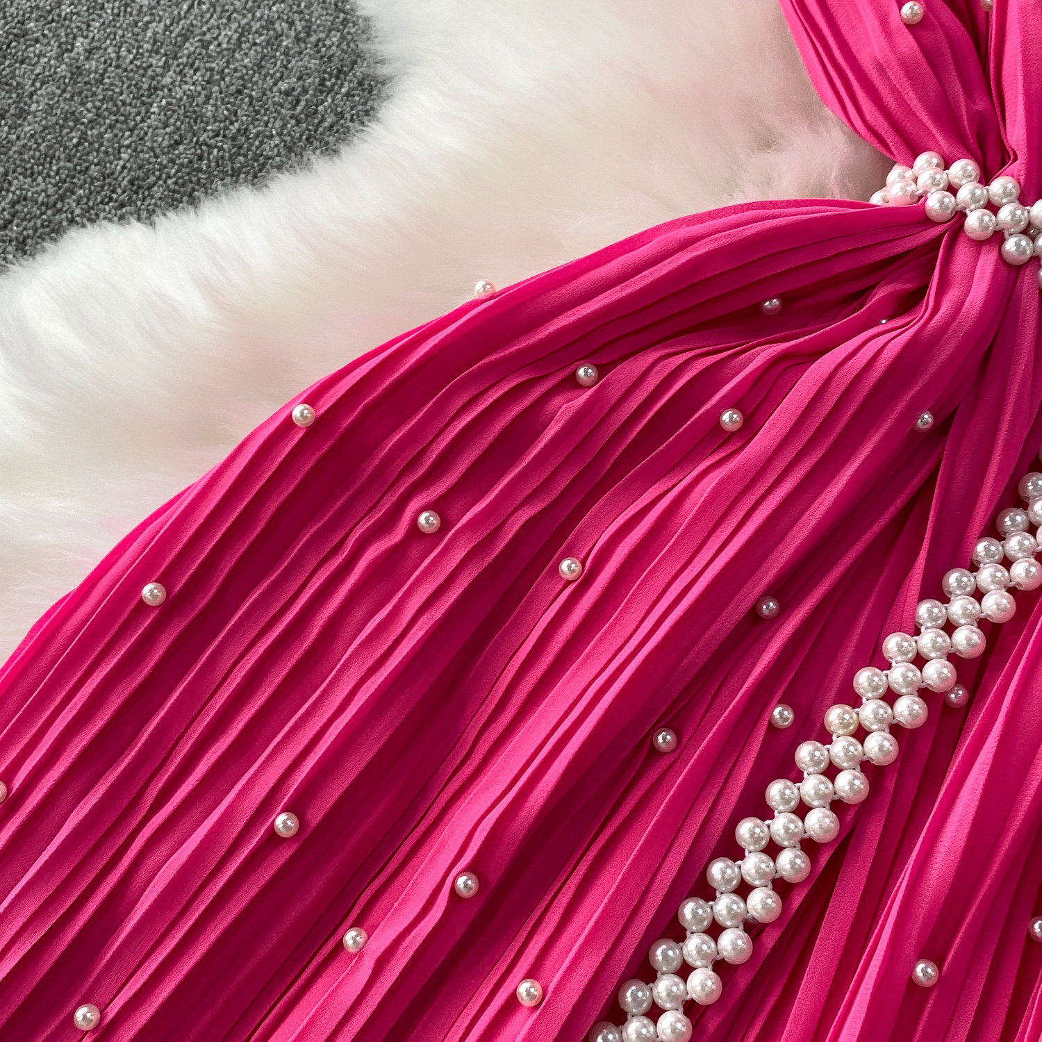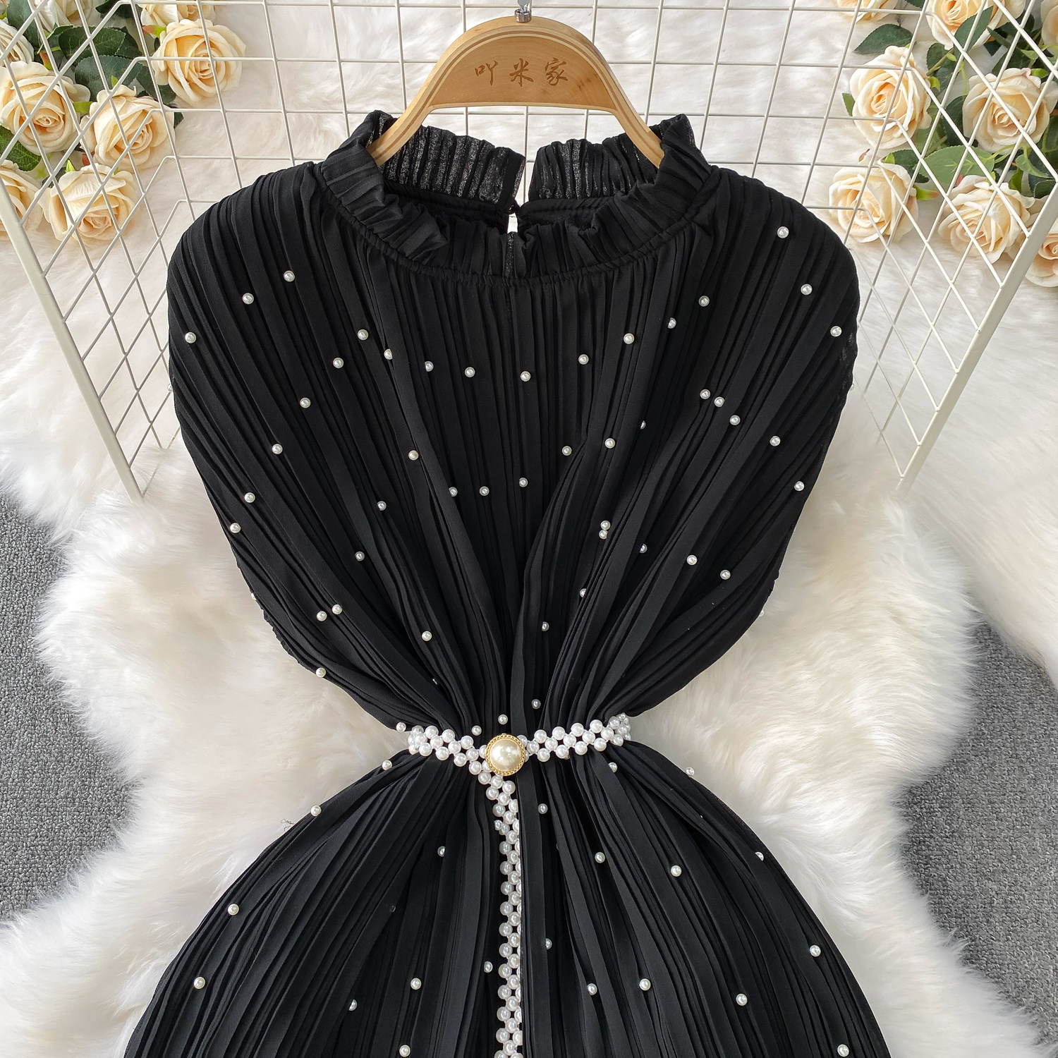 Elegant Socialite Style Heavy Pearl Trim Round Neck Dress for Women, New Summer Waist-Cinching Slimming Pleated Long Dress