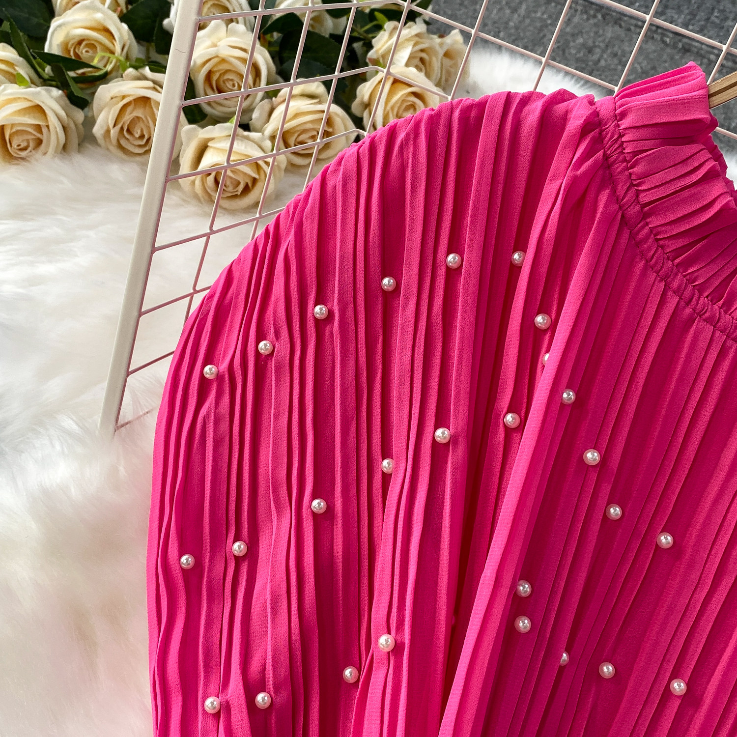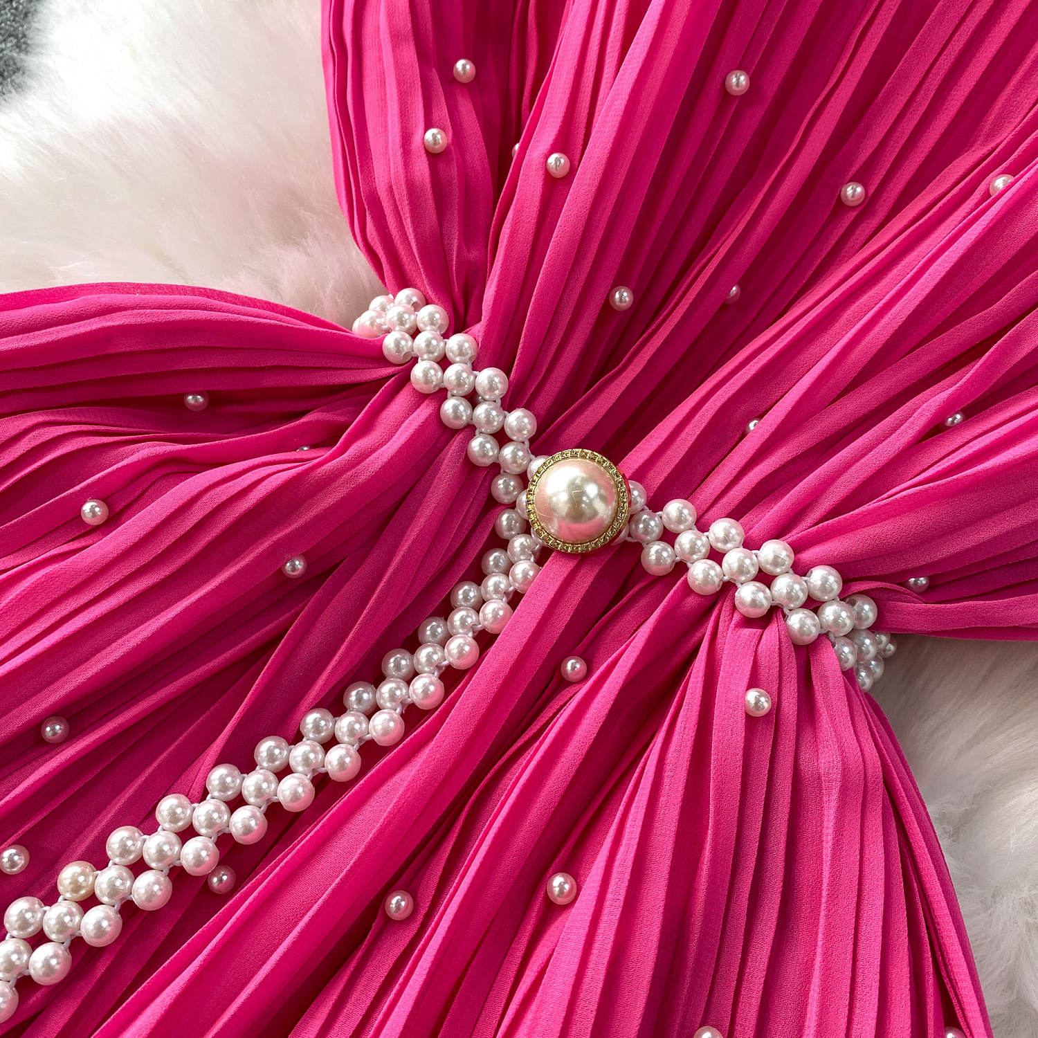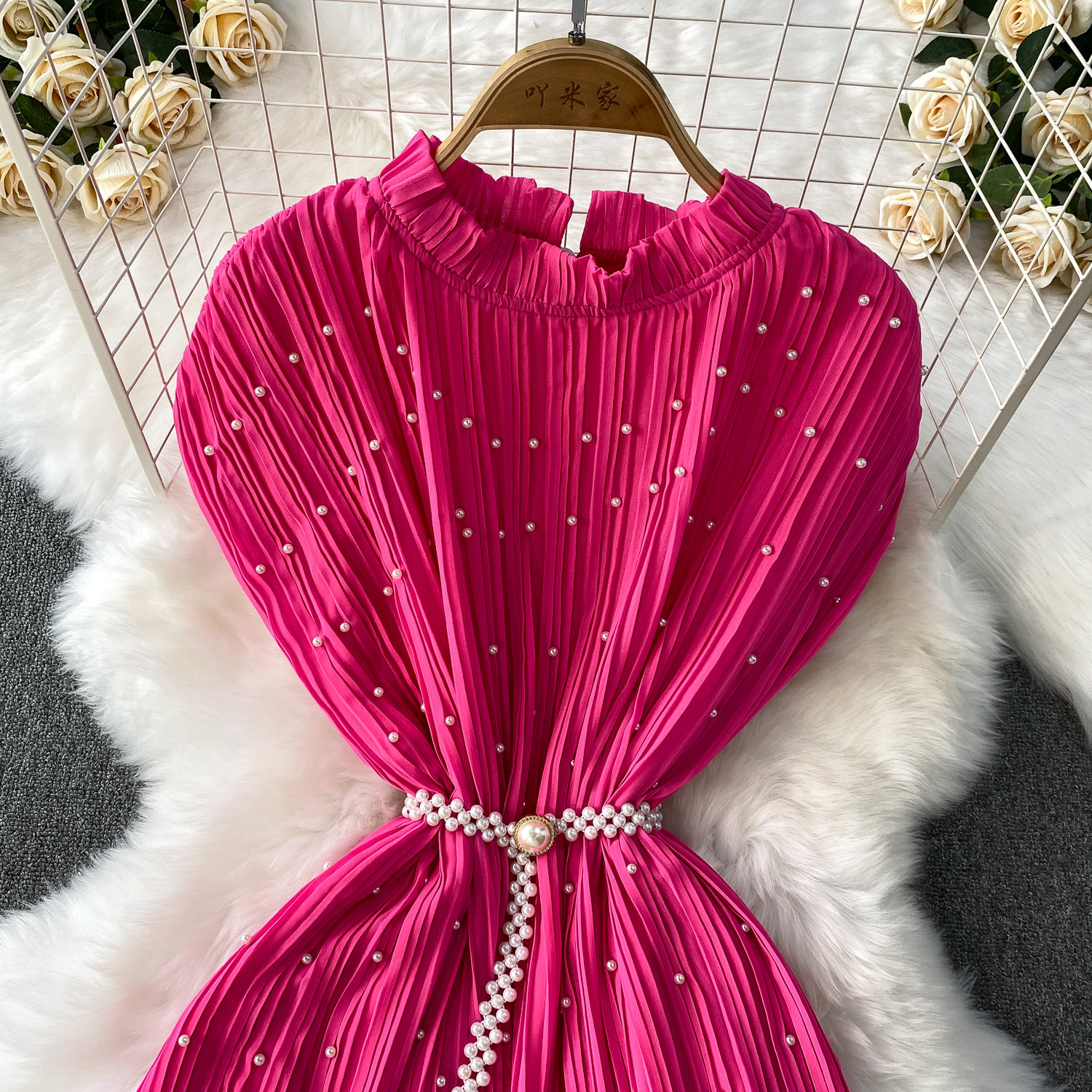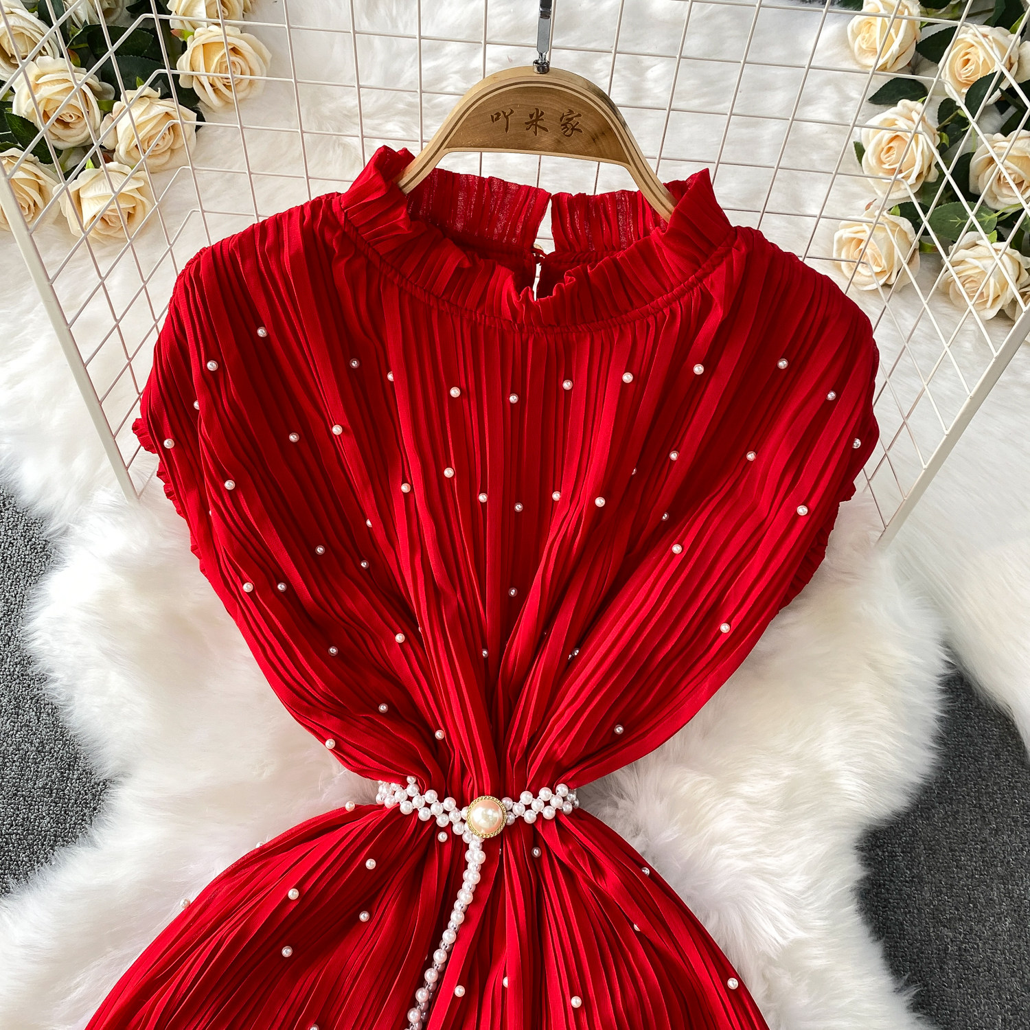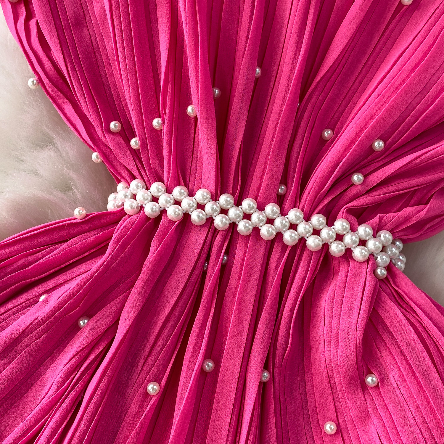 Elegant Socialite Style Heavy Pearl Trim Round Neck Dress for Women, New Summer Waist-Cinching Slimming Pleated Long Dress