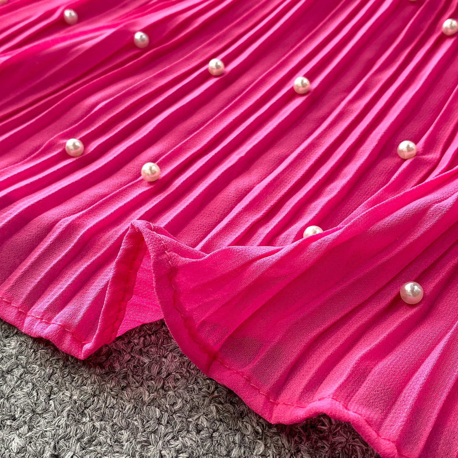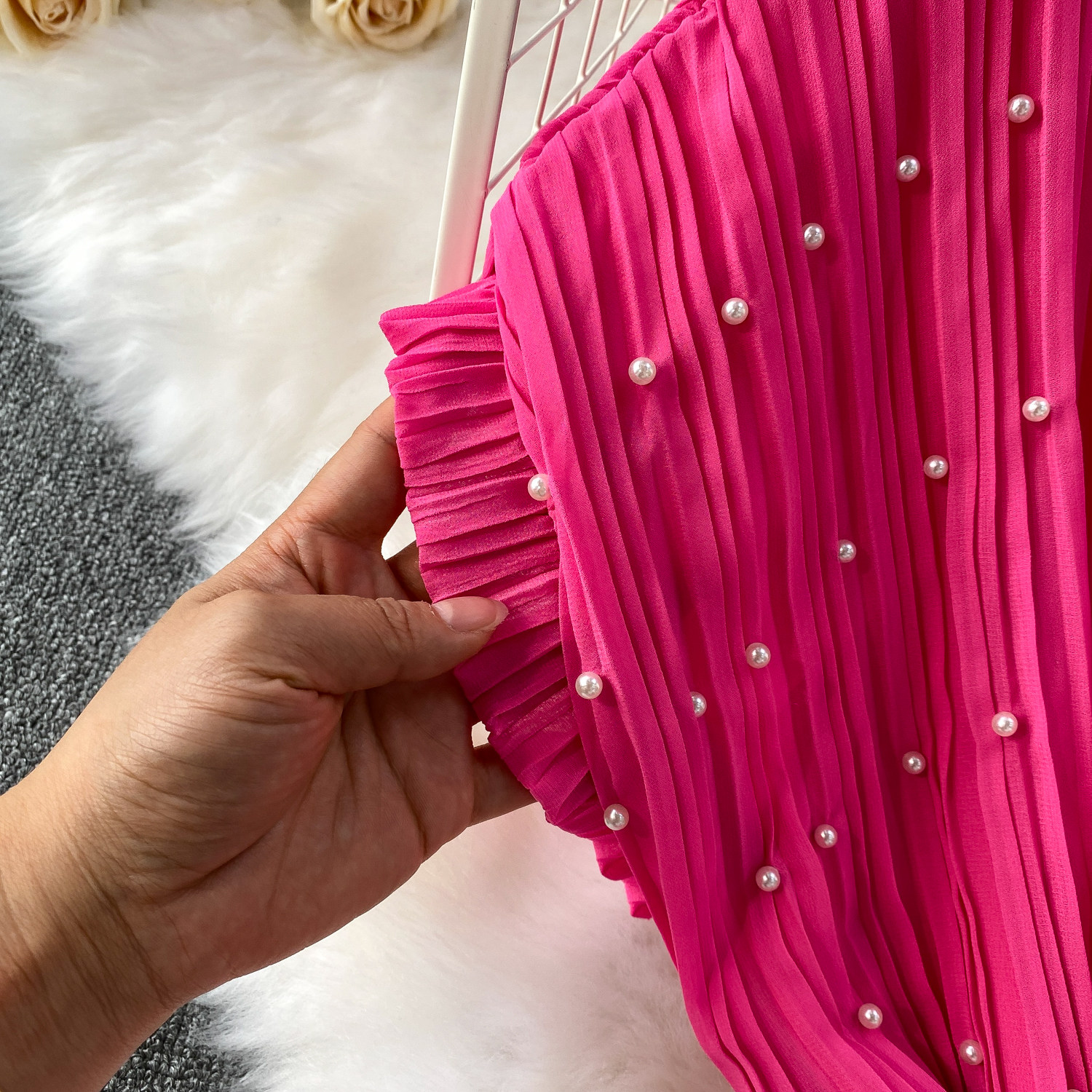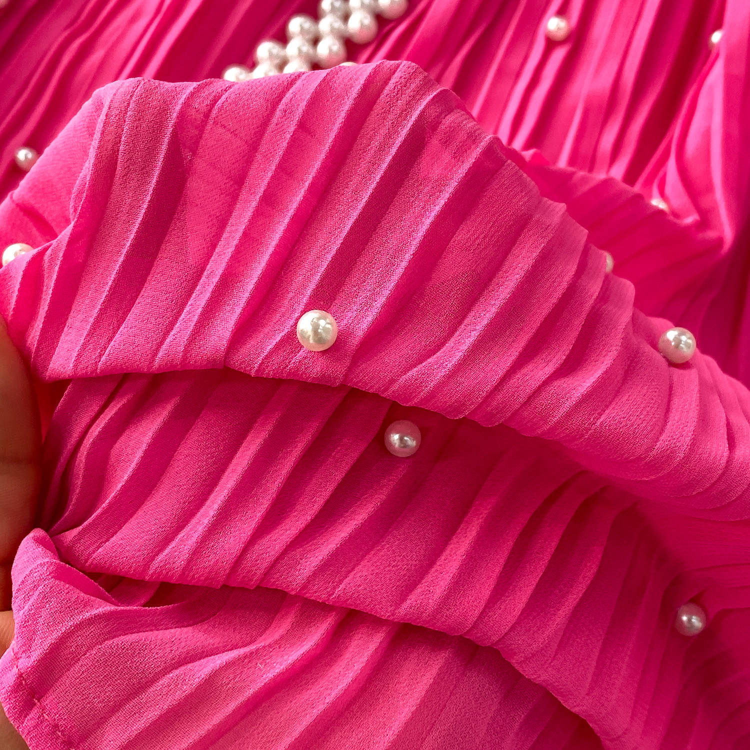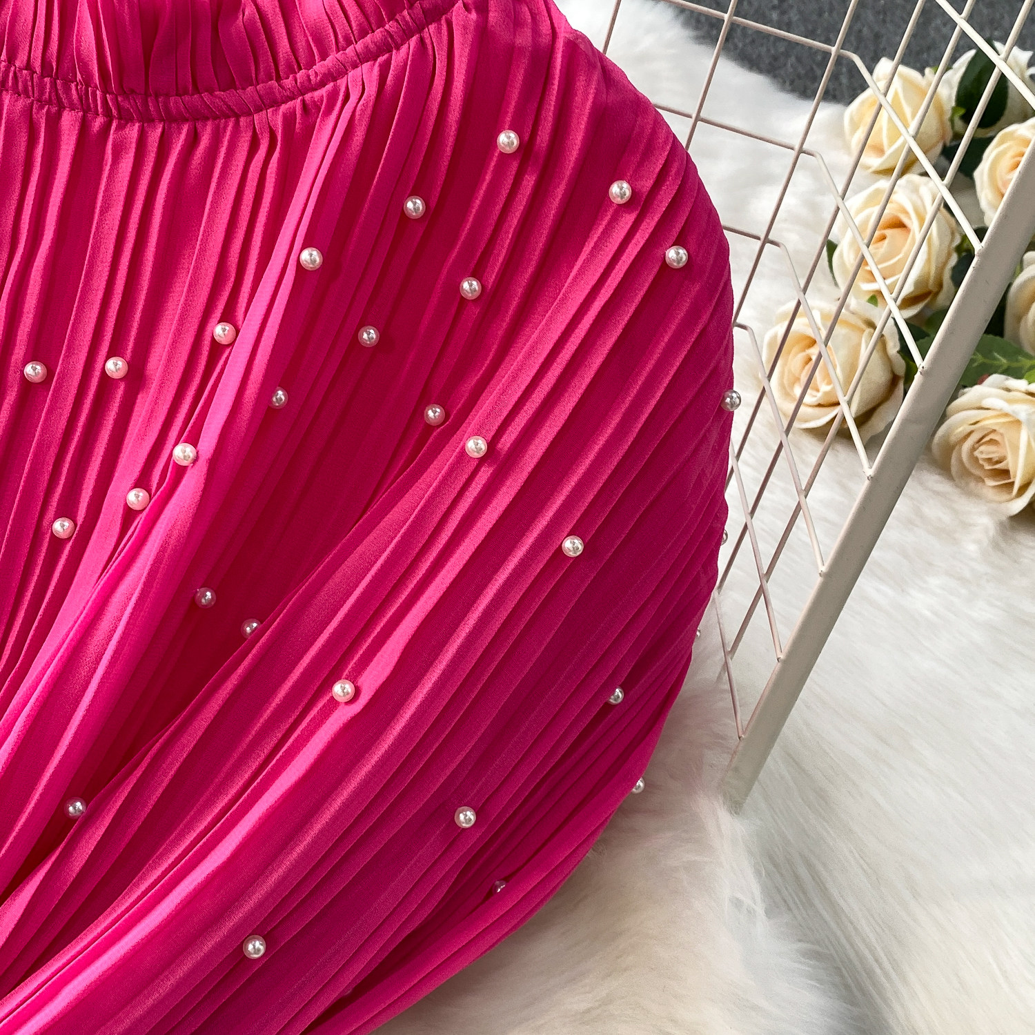 Elegant Socialite Style Heavy Pearl Trim Round Neck Dress for Women, New Summer Waist-Cinching Slimming Pleated Long Dress
