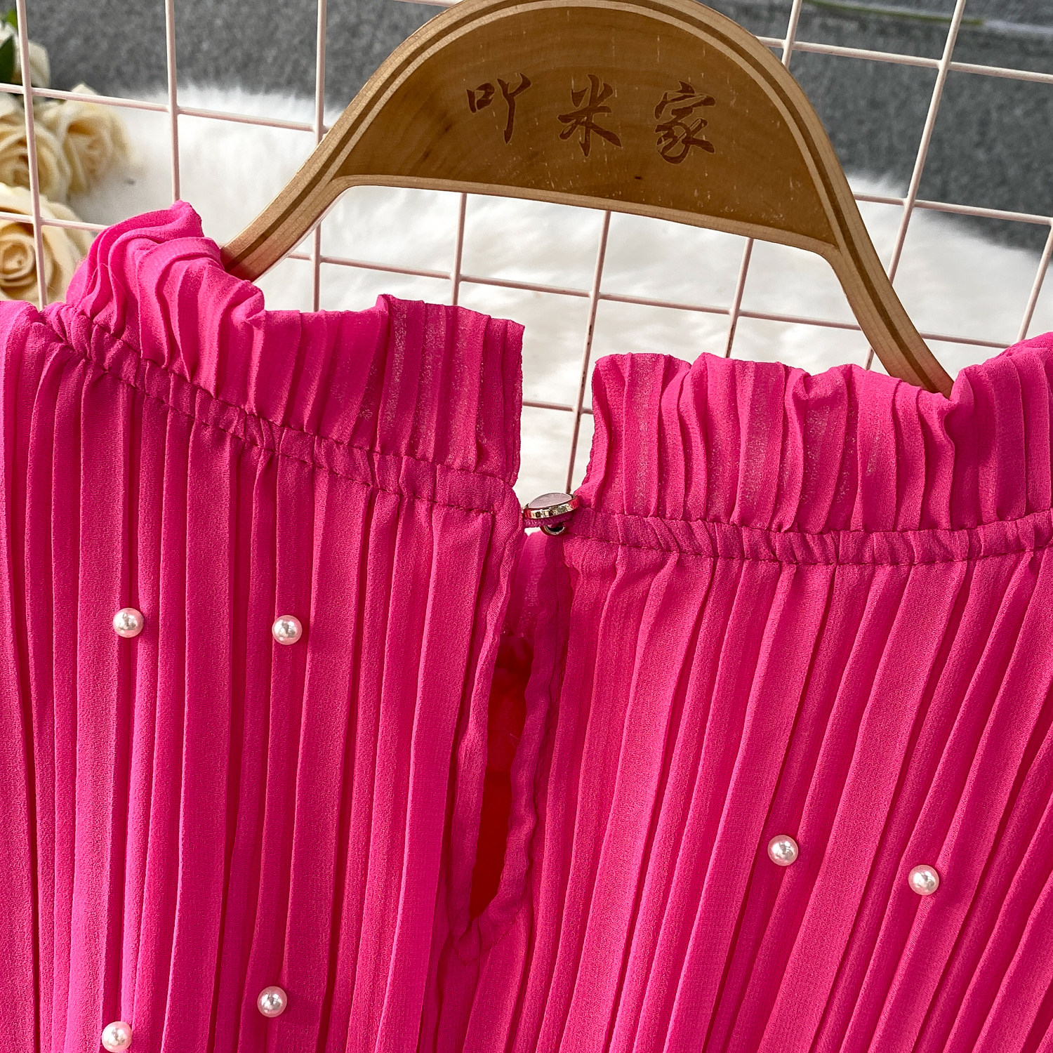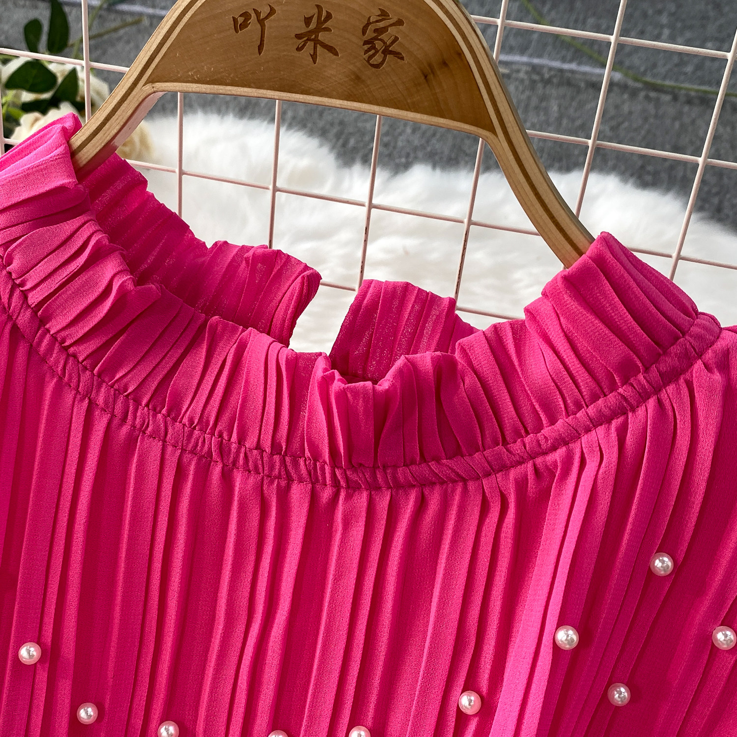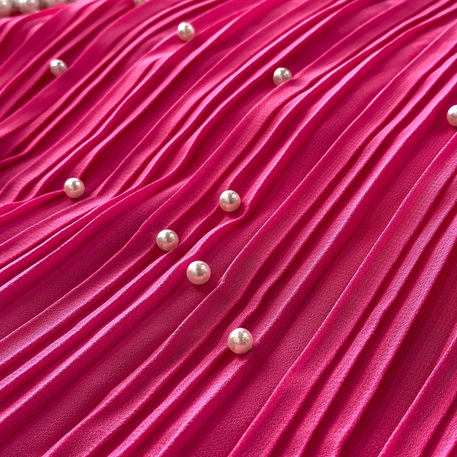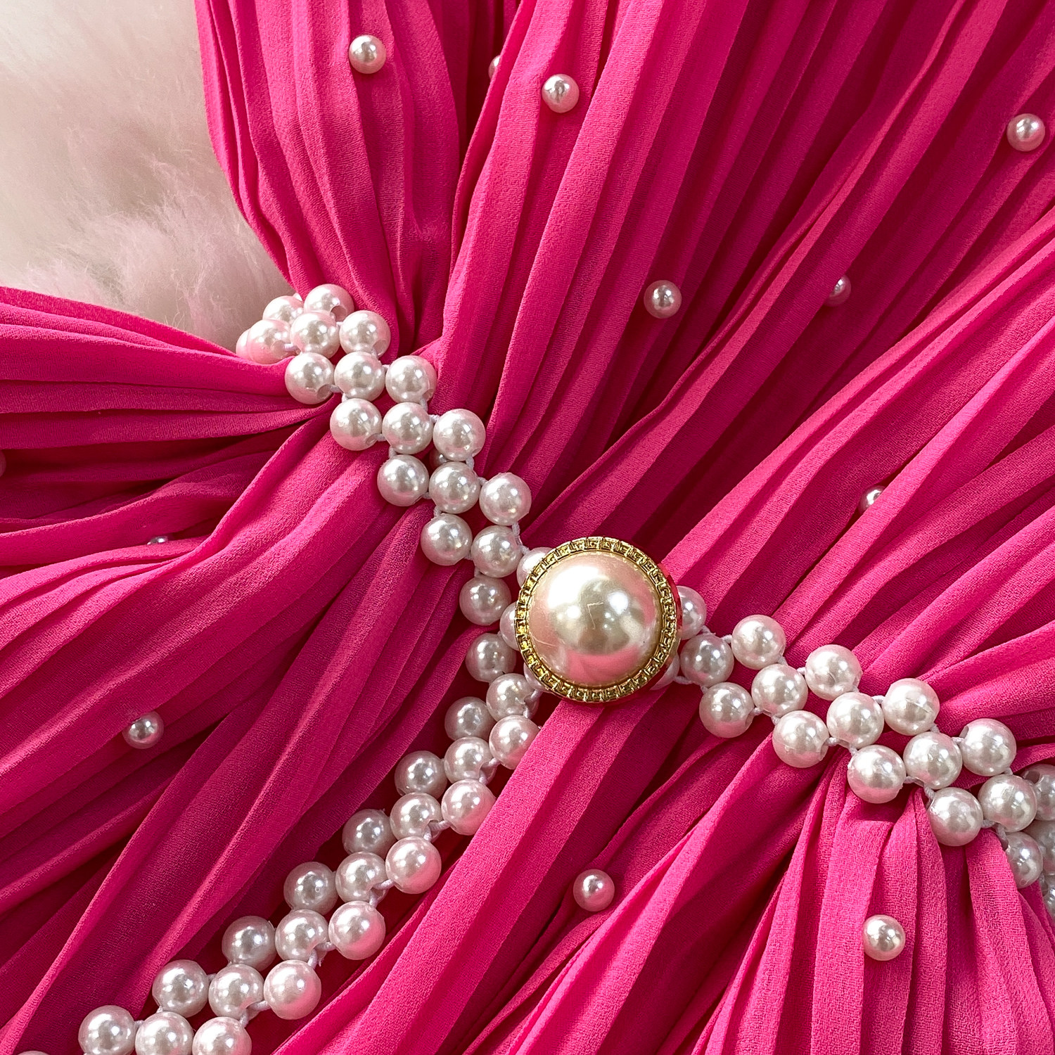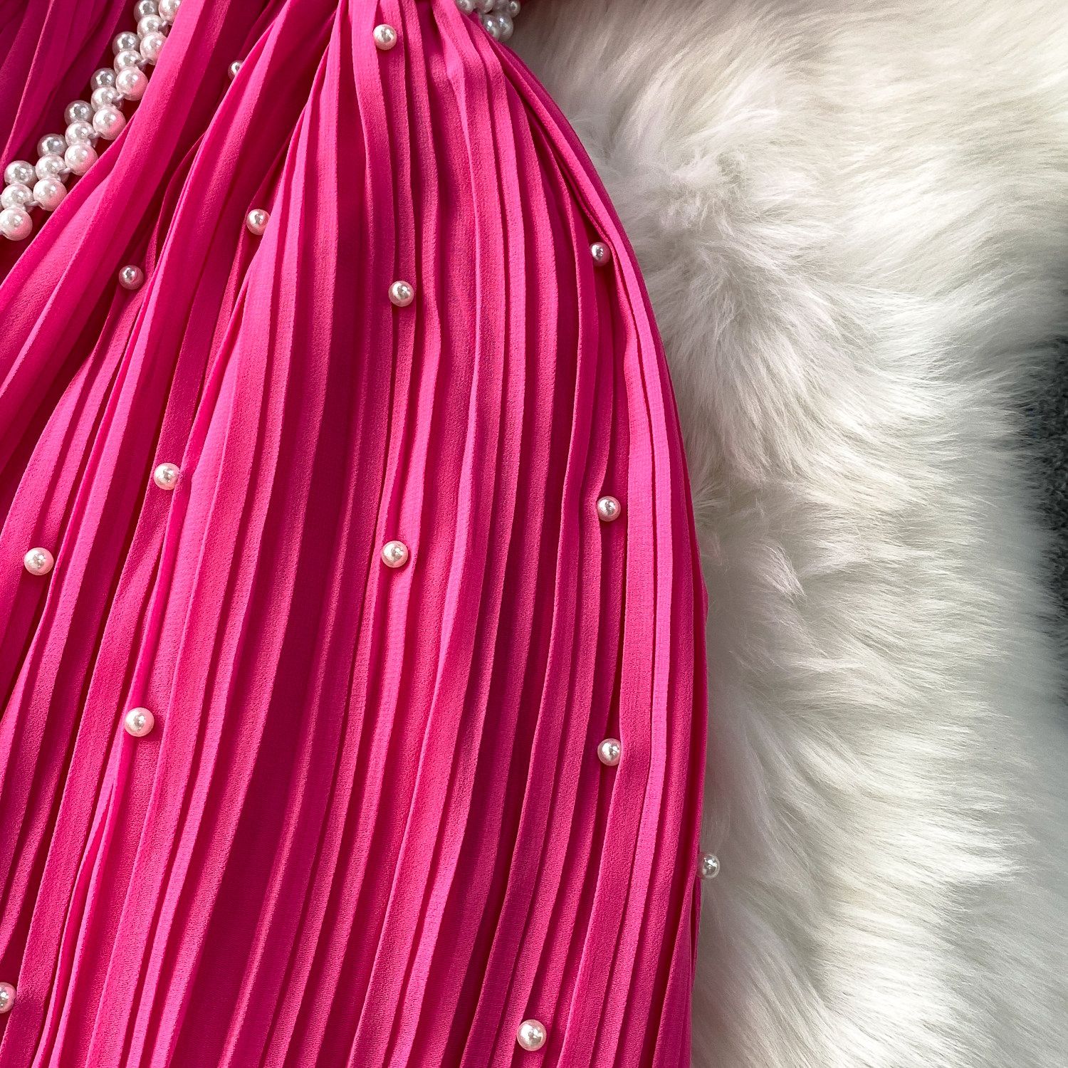Elegant Socialite Style Heavy Pearl Trim Round Neck Dress for Women, New Summer Waist-Cinching Slimming Pleated Long Dress
