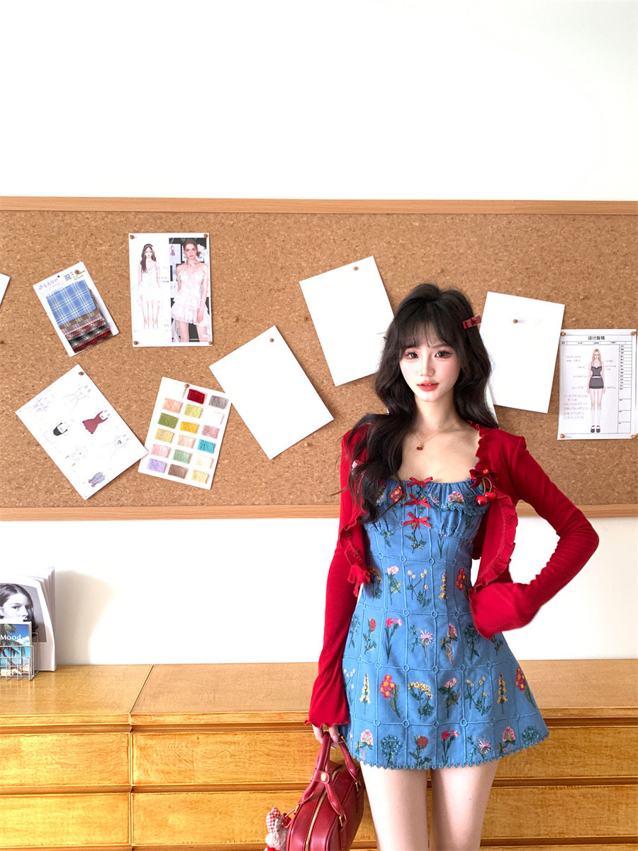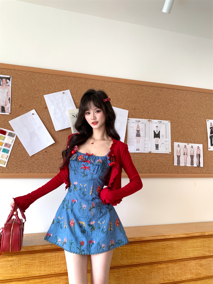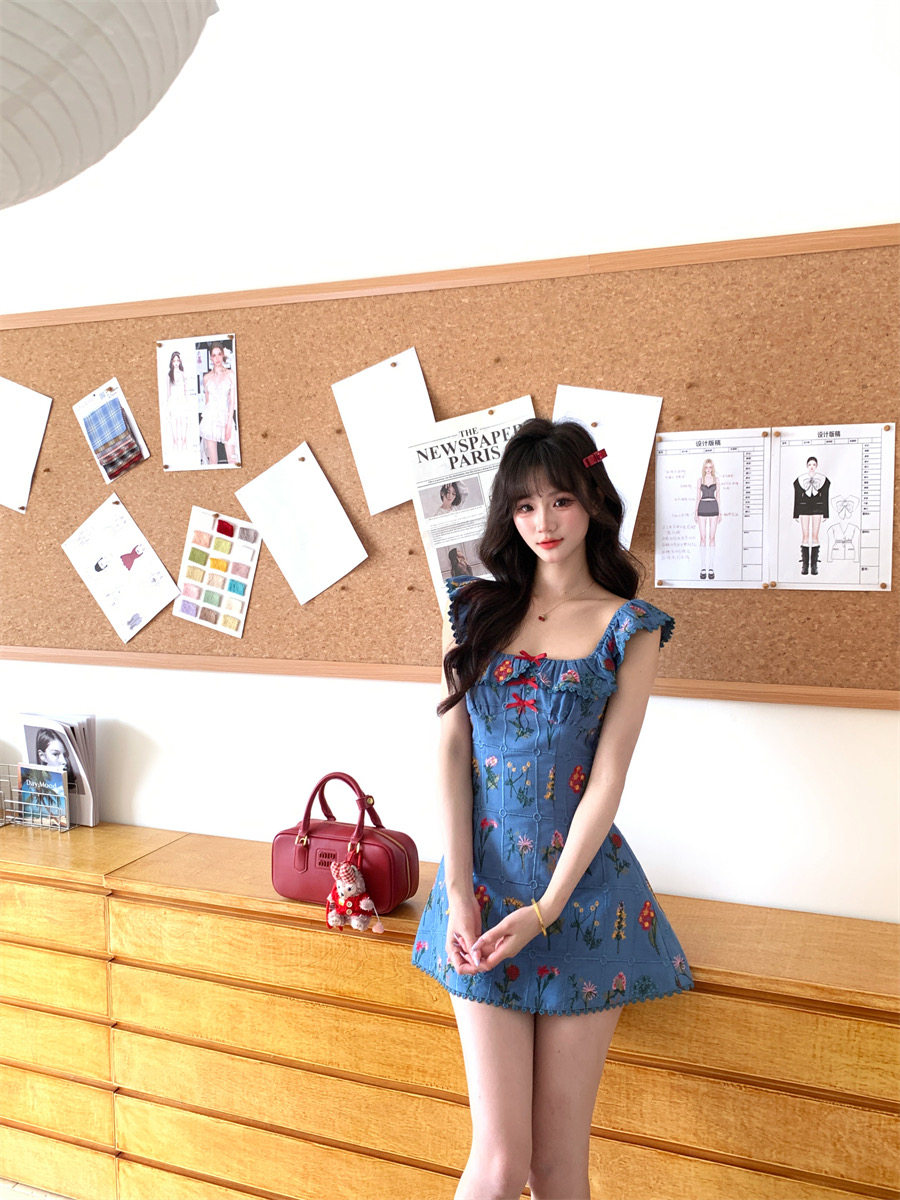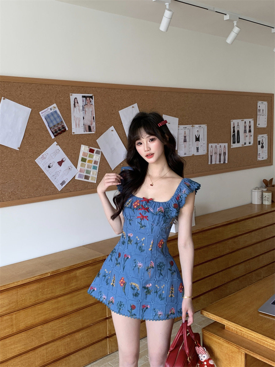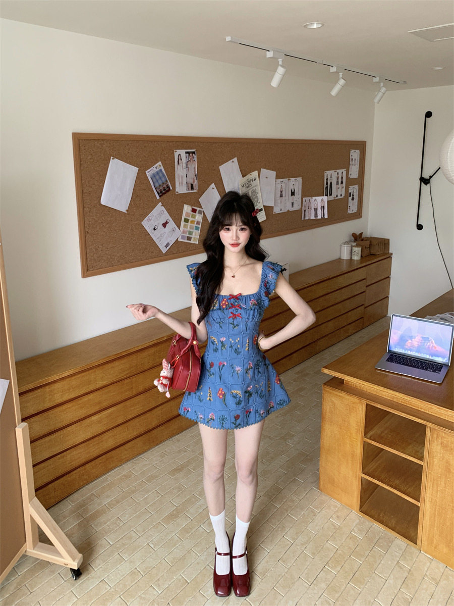 Night Blue Vine Flower Style French Heavy Embroidery Small Flutter Sleeve Dress, Fashionable Retro Unique A-Line Dress for Women in Summer