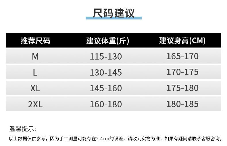 Size M 115-130 Jin Jin equals 0.5 kg,L 130-145 Jin Jin equals 0.5 kg,XL 145-160Jin Jin equals 0.5 kg,2XL 160-180Jin Jin equals 0.5 kg