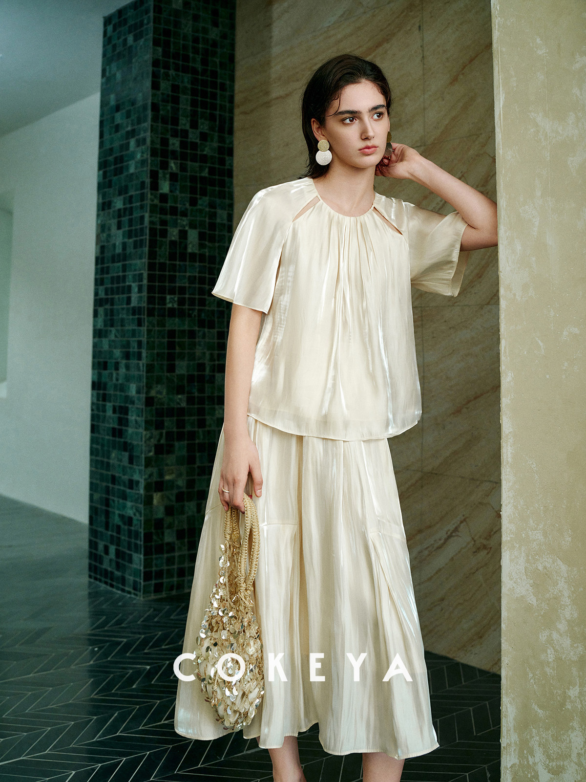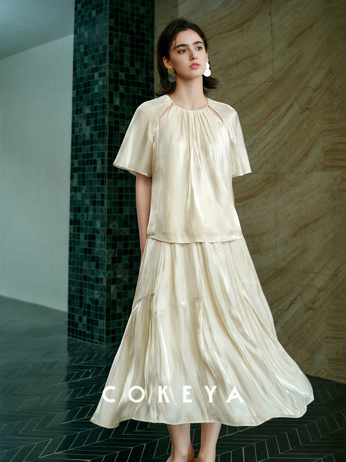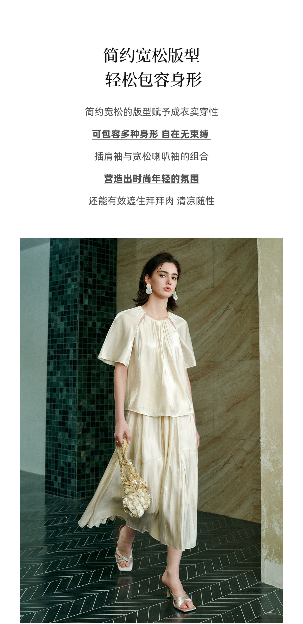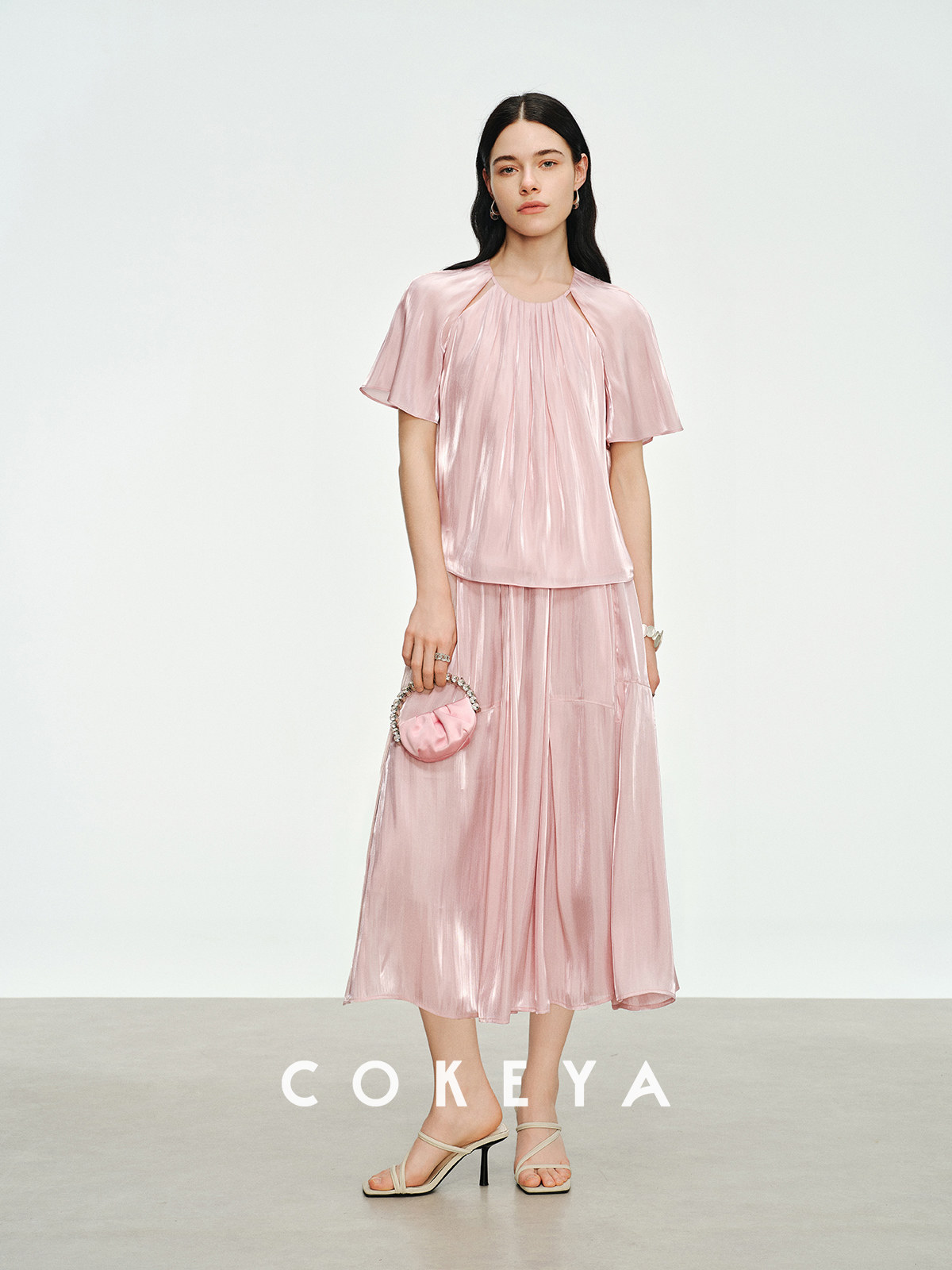 Soft light brings summer~ Pearlescent yarn thin round neck short-sleeved shirt for women summer high waist pleated skirt suit