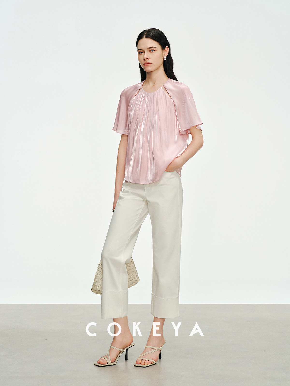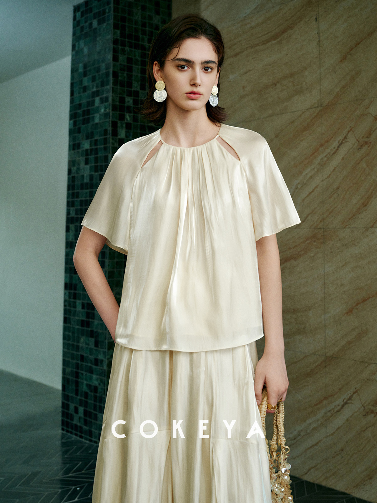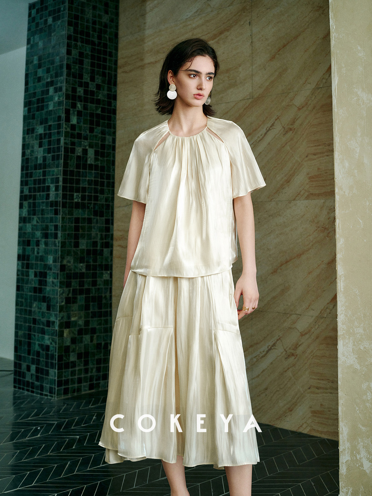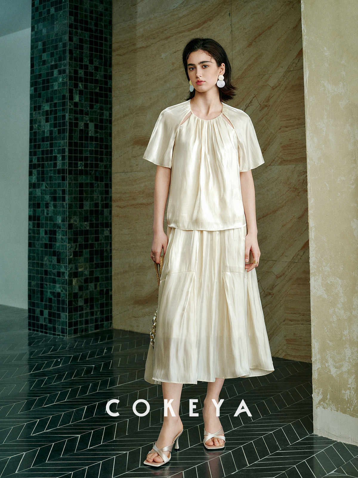 Soft light brings summer~ Pearlescent yarn thin round neck short-sleeved shirt for women summer high waist pleated skirt suit