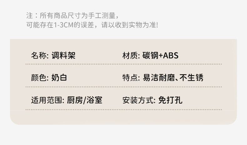 Color Classification [Milk White]Three-Layer Spice Rack with 3 Compartments, Removable [Free Sticker + Free Spoon],[Milk White]Three-Layer Spice Rack with 4 Compartments, Removable [Free Sticker + Free Spoon],[Milk White]Three-Layer Spice Rack with 5 Compartments, Removable [Free Sticker + Free Spoon],[Milk White]Combo Pack [30cm + Double-Layer 3-Compartment] [Includes Stickers + Free Spoon],[Milk White]Combo Pack [40cm + Double-Layer 4-Compartment] [Includes Stickers + Free Spoon],[Milk White]Combo Pack [50cm + Double-Layer 5-Compartment] [Includes Stickers + Free Spoons],[Milk White]Double-Layer Spice Rack with 3 Compartments, Removable [Free Sticker + Free Spoon],[Milk White]Double-Layer Spice Rack with 4 Compartments, Removable [Free Sticker + Free Spoon],[Milk White]Double-Layer Spice Rack with 5 Compartments, Removable [Free Sticker + Free Spoon],[Milk White]Single Layer Spice Rack 30cm Removable,[Milk White]Single Layer Spice Rack 40cm Removable,[Milk White]Single Layer Spice Rack 50cm Removable,[Milk White]Single Layer Spice Rack 60cm Removable