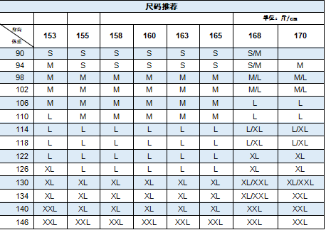 China (cm) 160-165/84-86 165-170 / 88-90 167-172 / 92-96 168-173 / 98-102 170-176 / 106-110