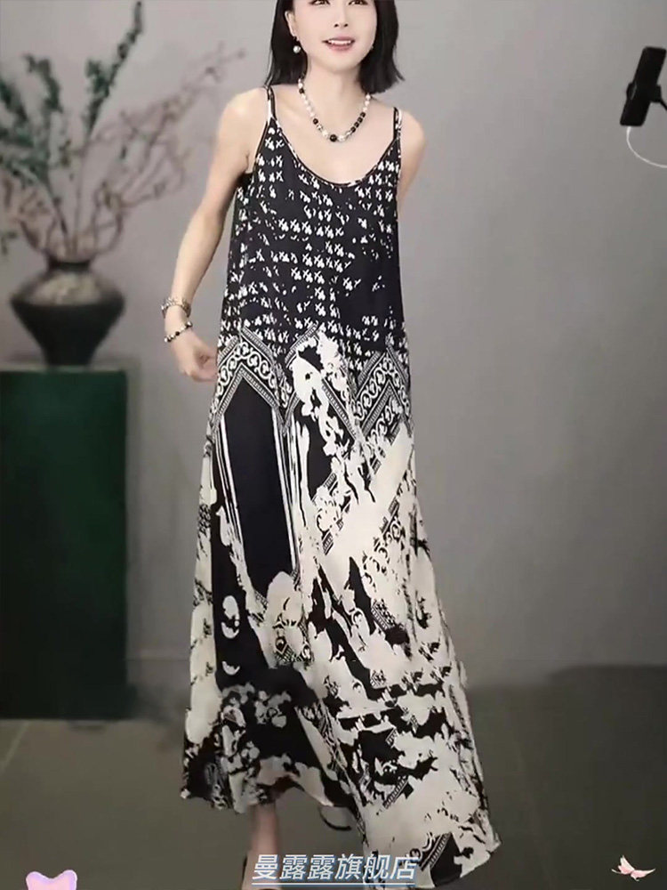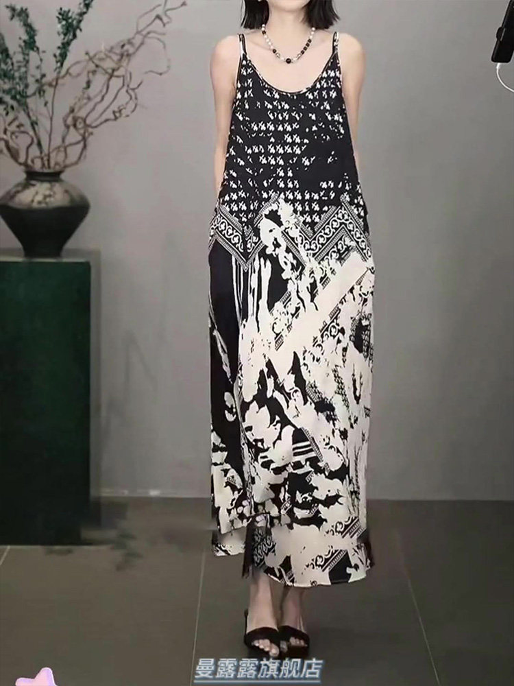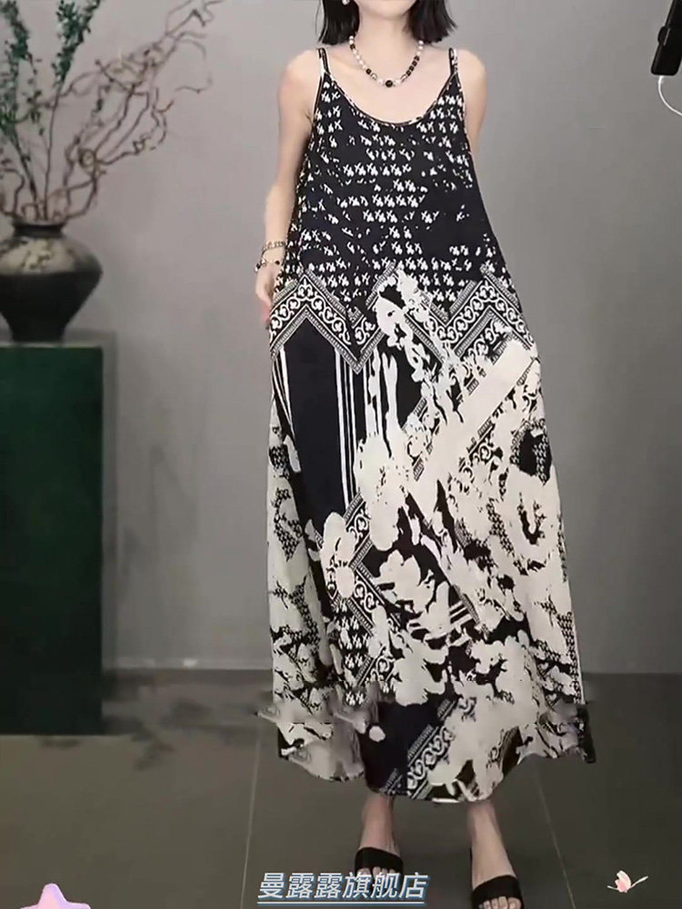 French-Style Light Luxury Dress for Women, New Summer Model, High-End, Casual, Black and White Print, Sophisticated Spaghetti Strap Long Dress