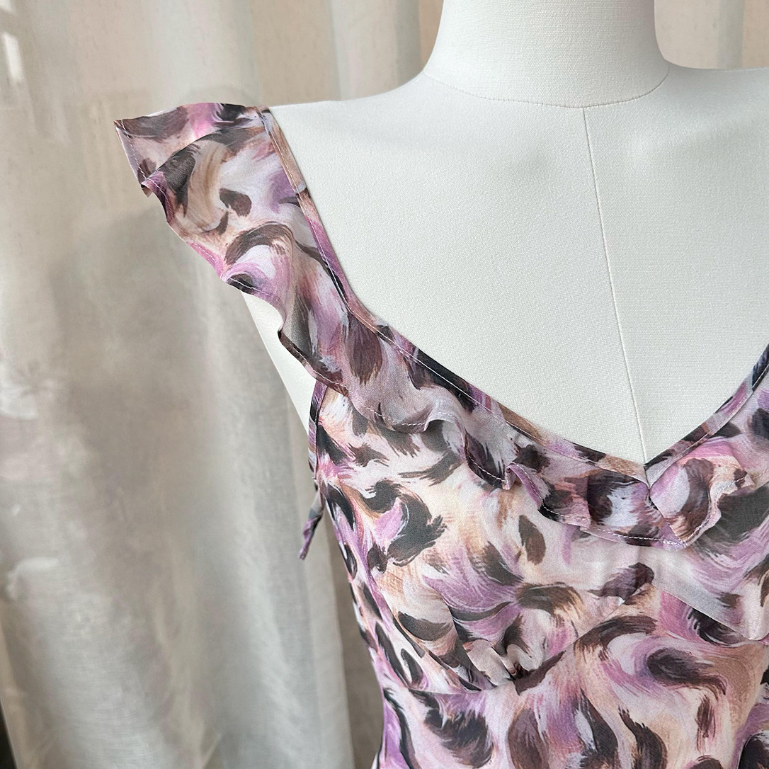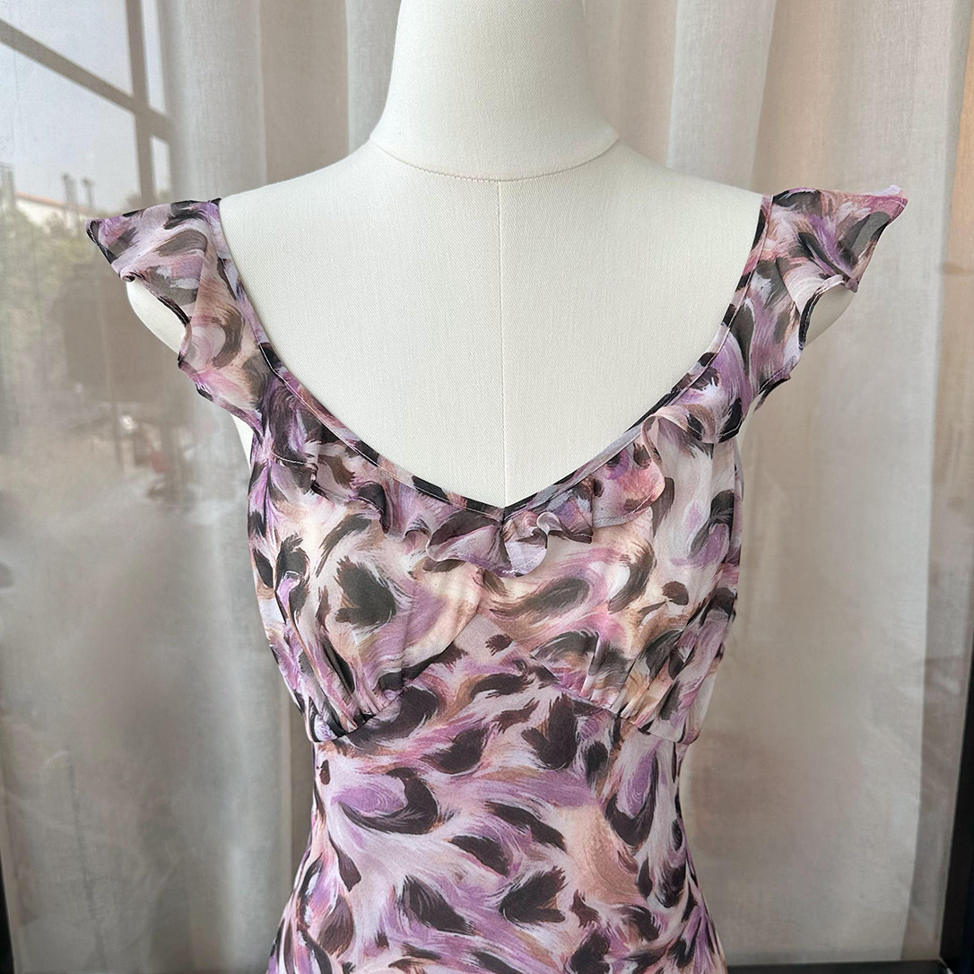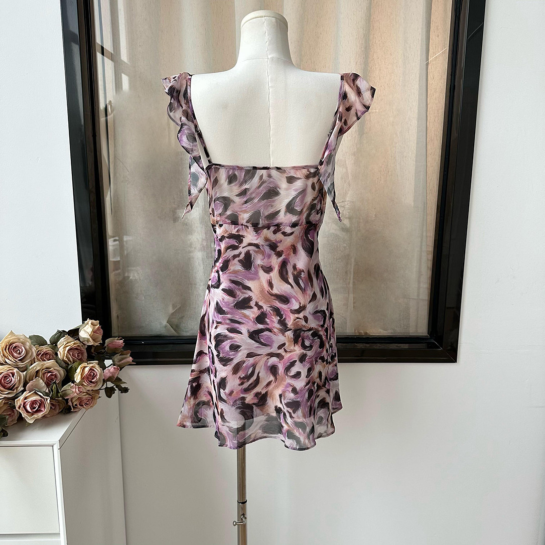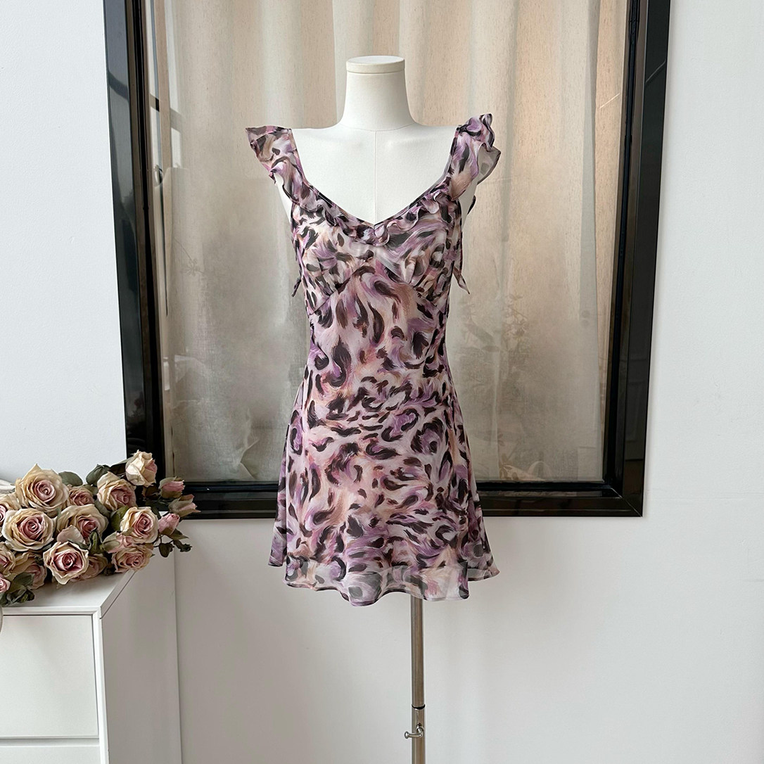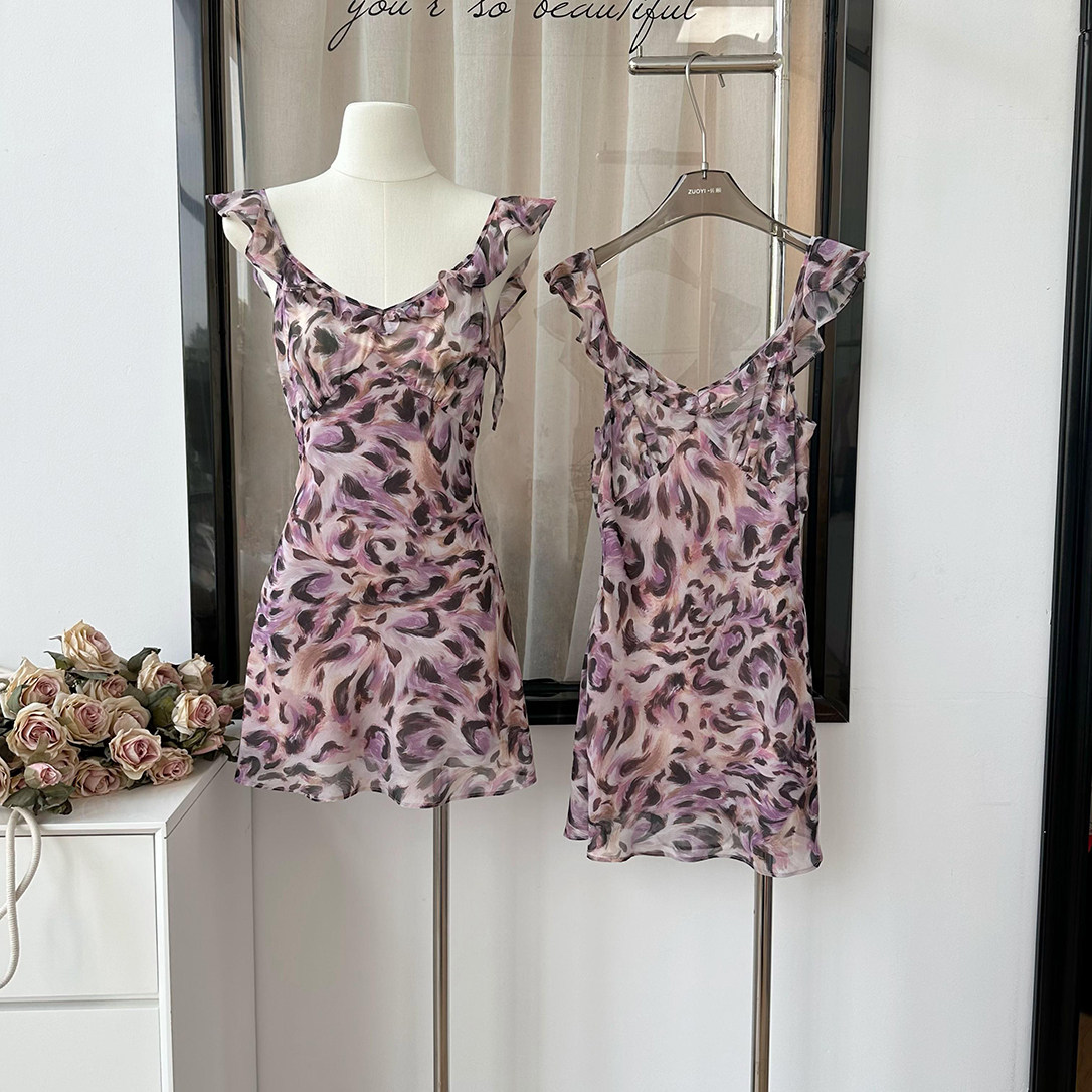 Lin Xi Xi French-Style V-Neck Romantic Purple Leopard Print Oil Painting Bias-Cut Summer Vacation Style Slim-Fit Spaghetti Strap Dress