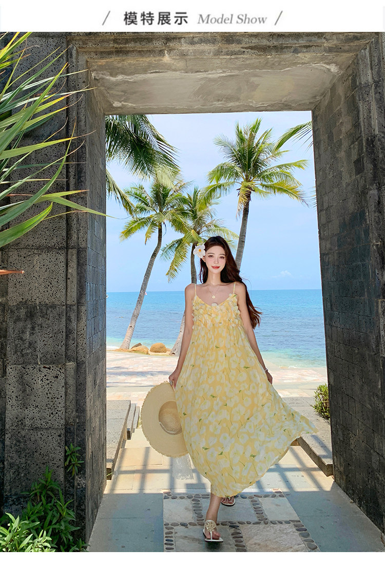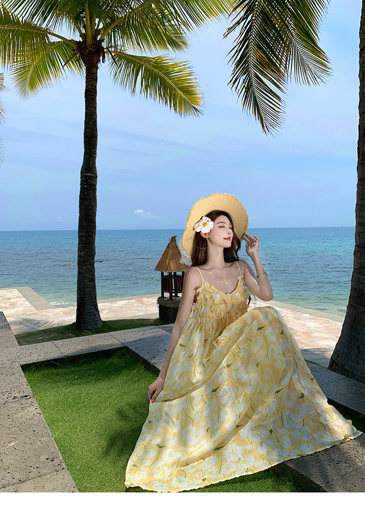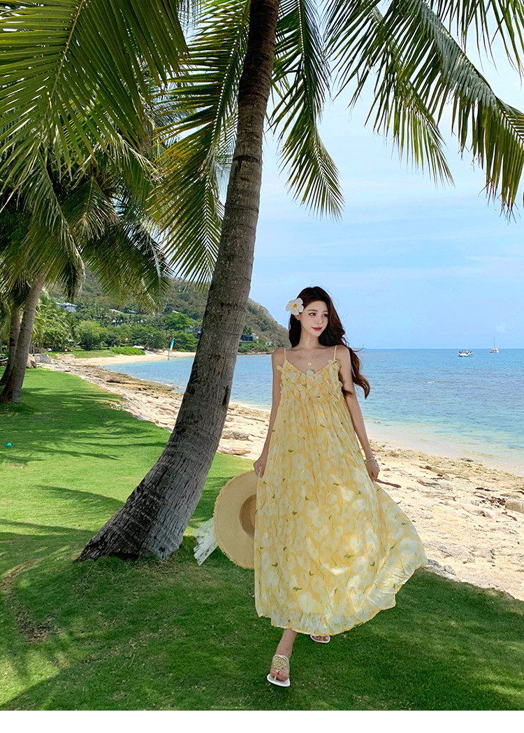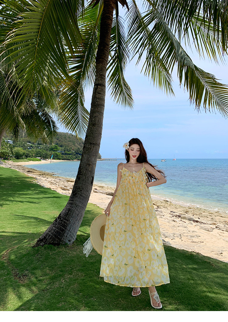 Beach Vacation Yellow Slimming and Whitening Printed Spaghetti Strap Dress for Women 2025 New Sexy Summer Stunning Dress