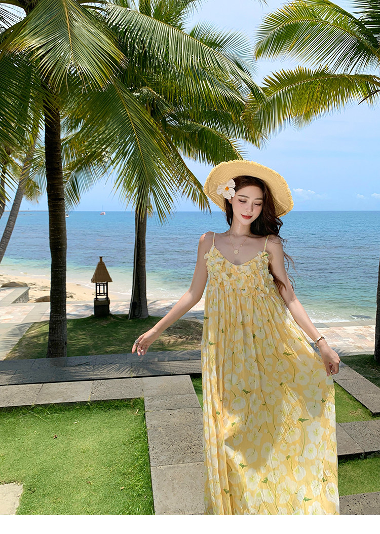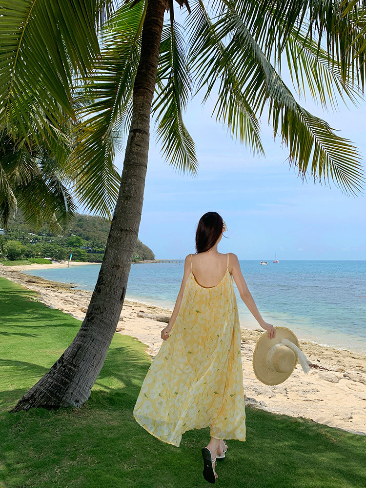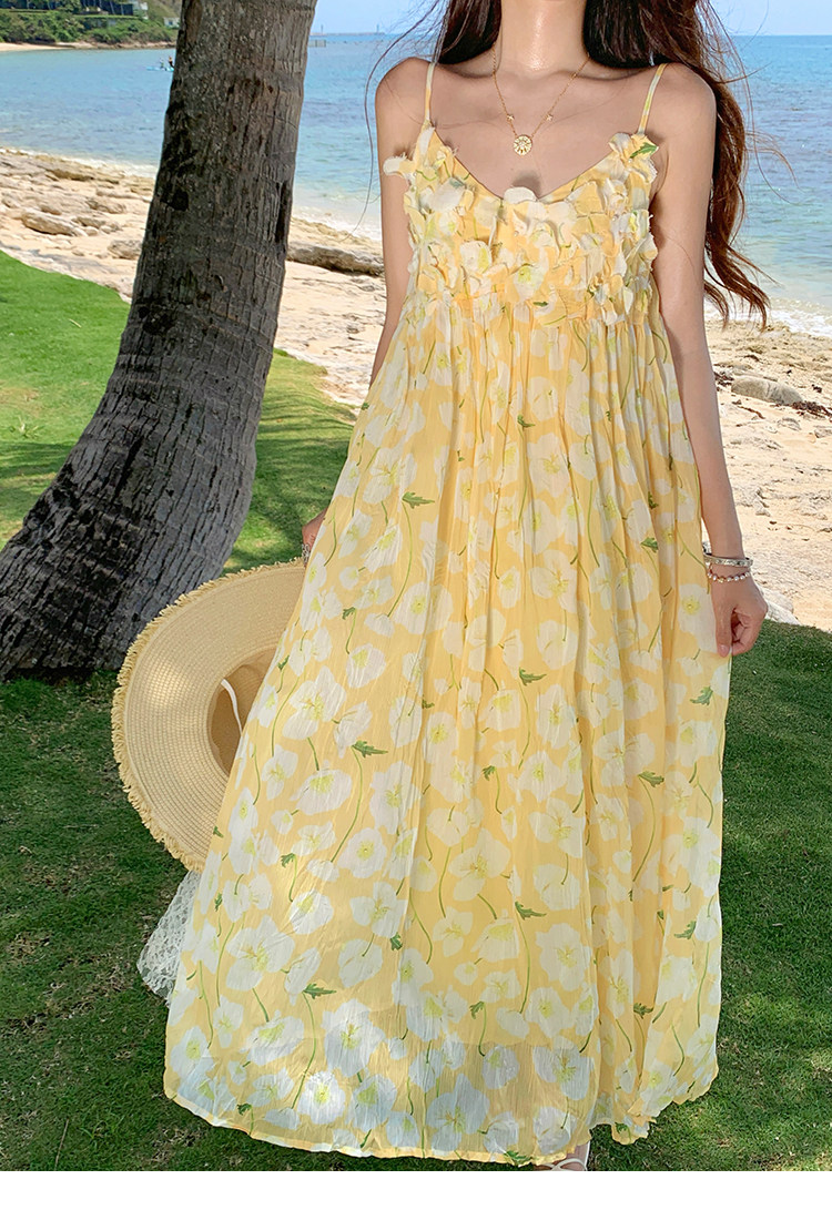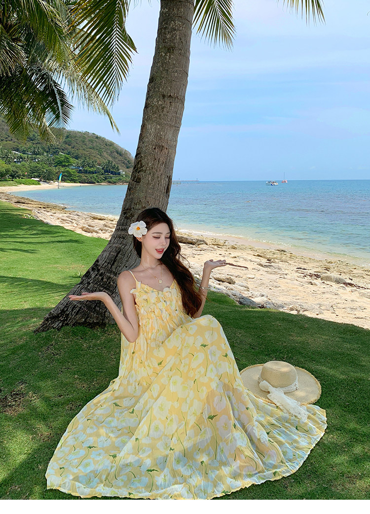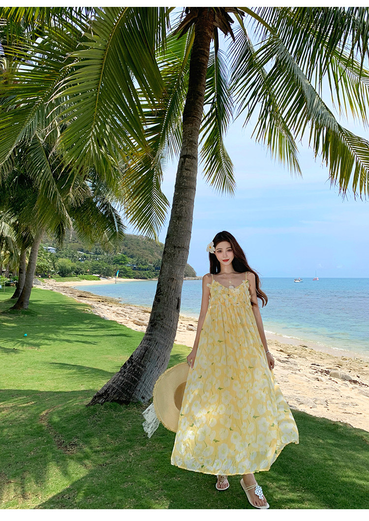 Beach Vacation Yellow Slimming and Whitening Printed Spaghetti Strap Dress for Women 2025 New Sexy Summer Stunning Dress