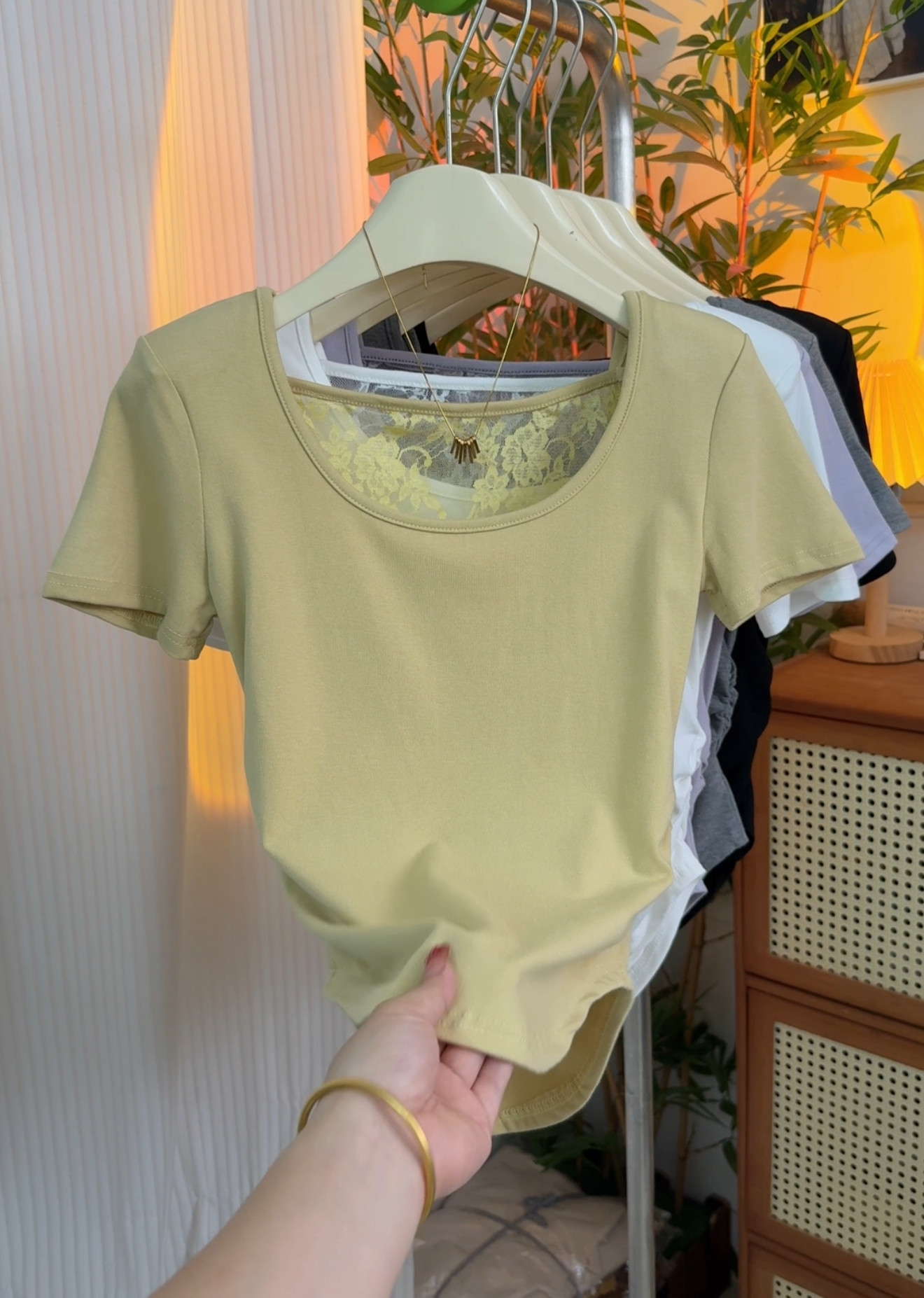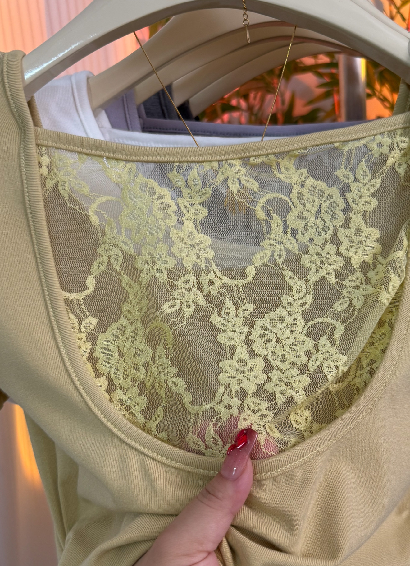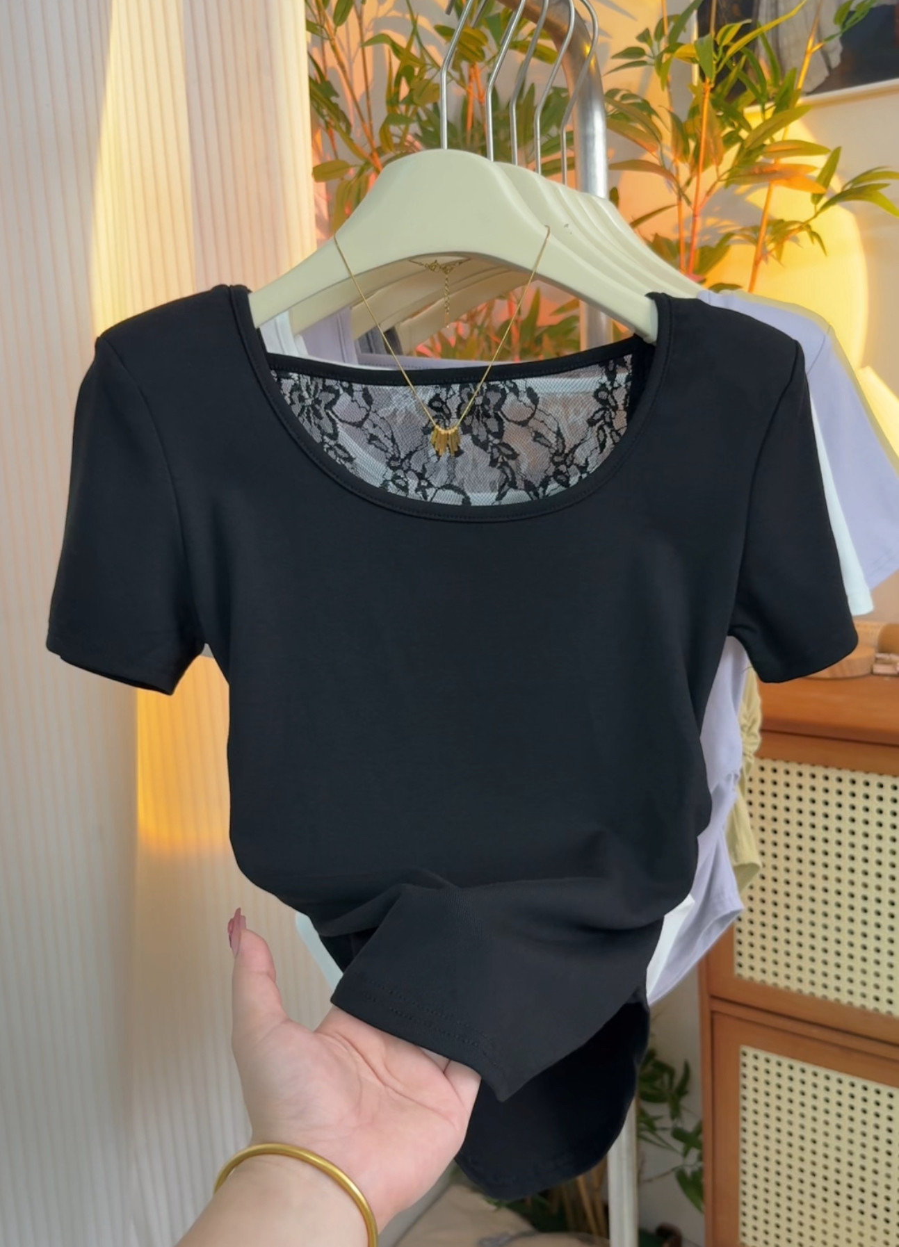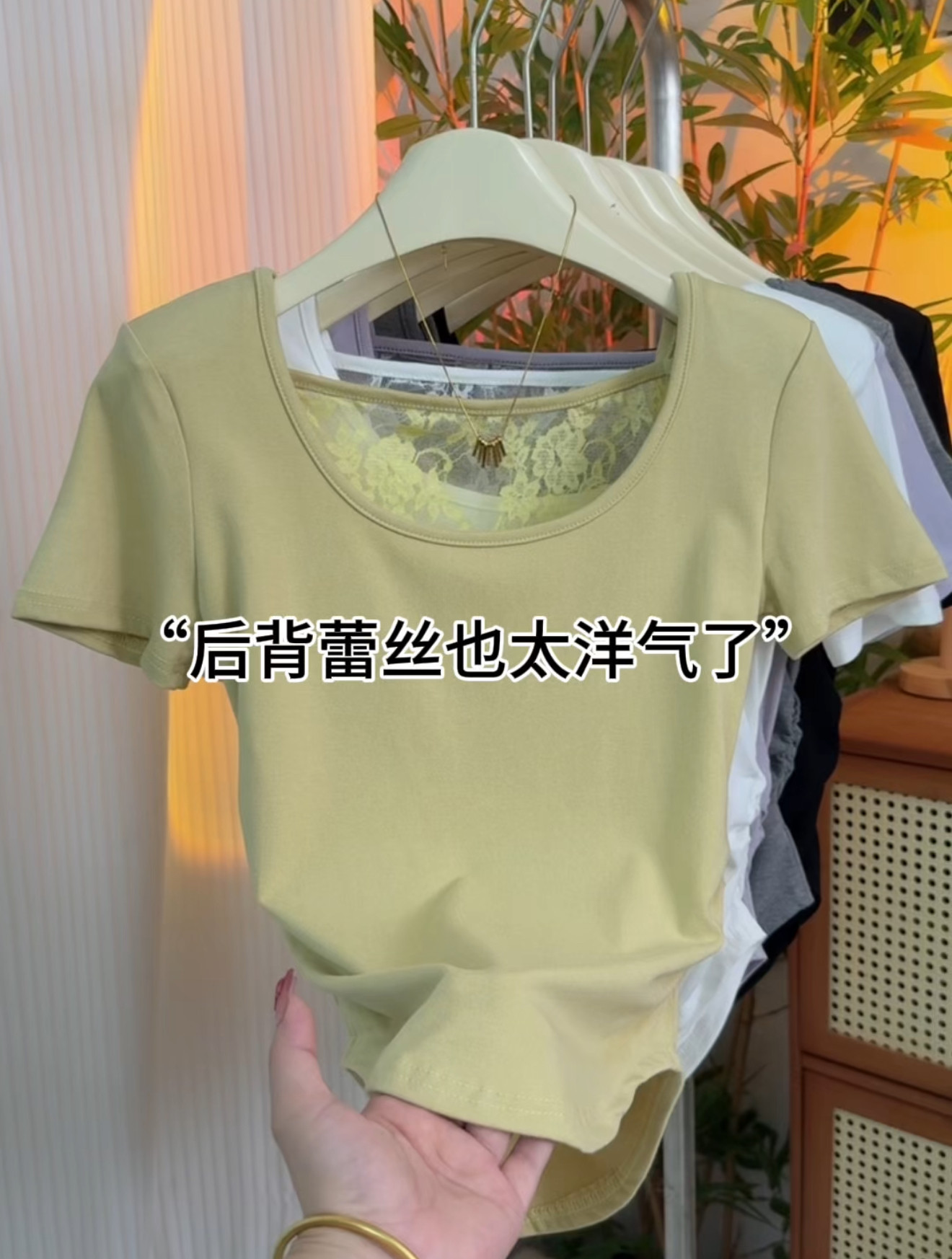 Pure lust hottie lace back hollow shoulder pad T-shirt women's new summer design slimming pleated short-sleeved top