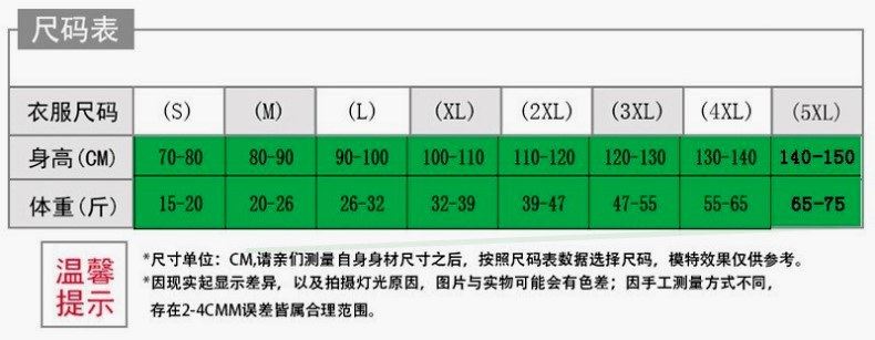Size 2XL 110-120cm, 19.5-23.5kg,XL 100-110cm, 16-19.5kg,3XL 120-130cm, 23.5-27.5kg,4XL 130-140cm, 27.5-32.5kg,5XL 140-150cm, 32.5-37.5kg