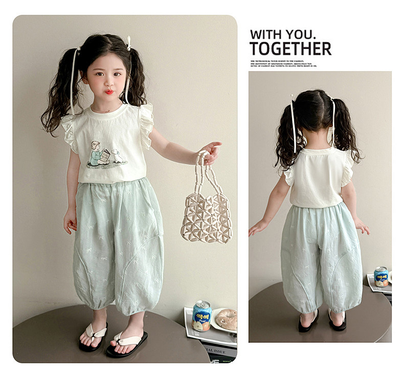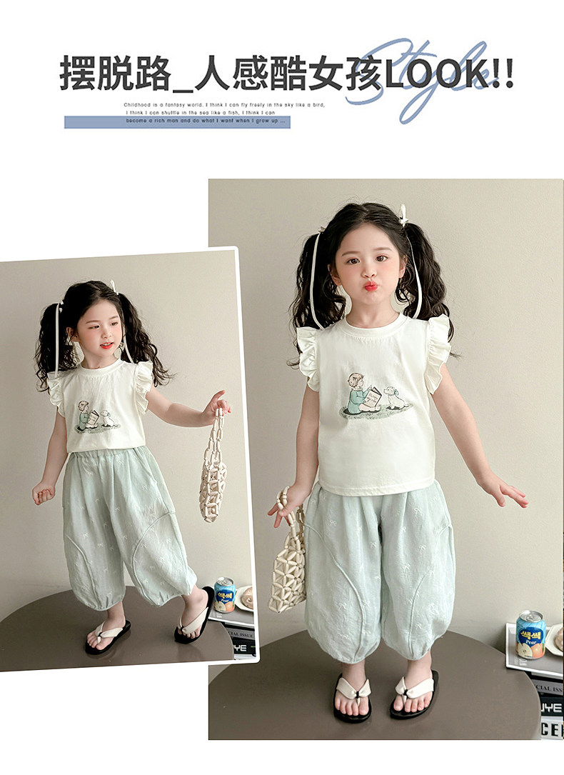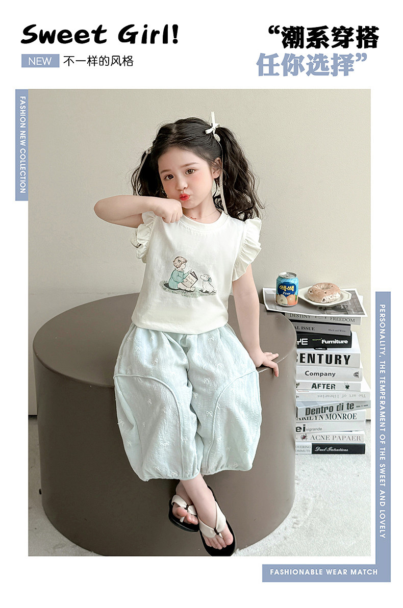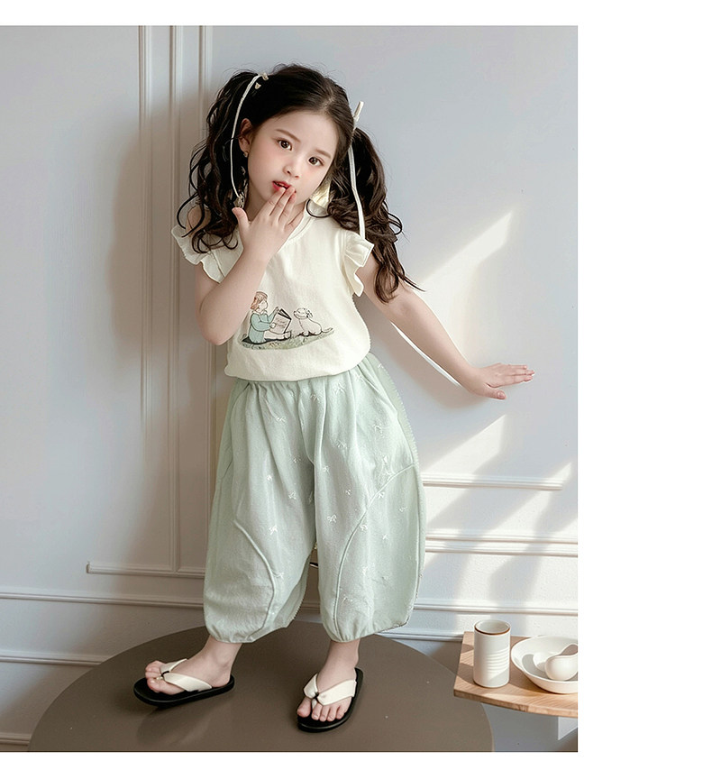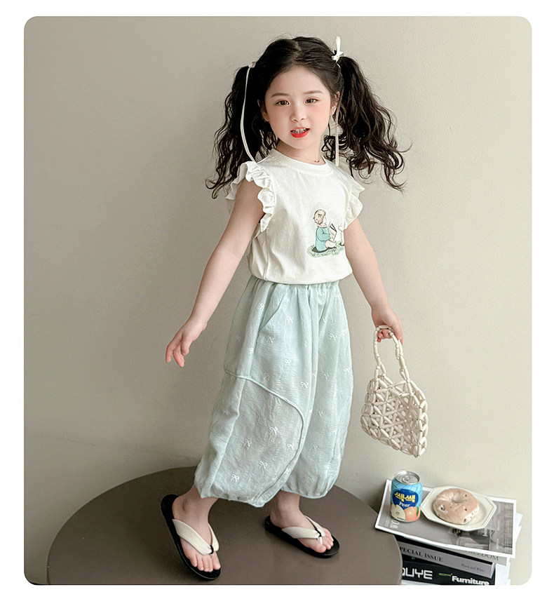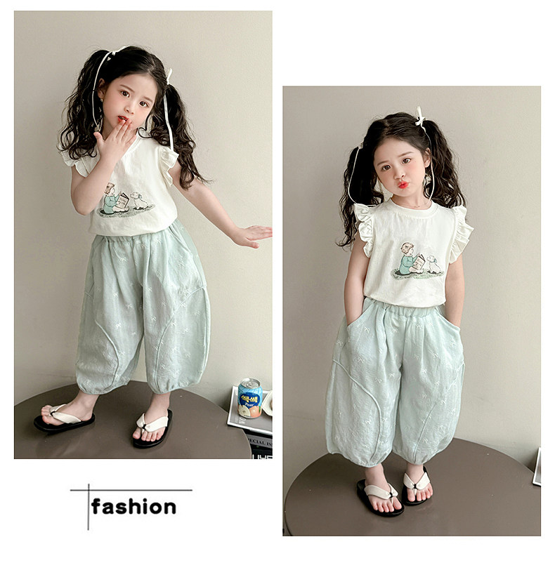 Girls Flying Sleeve Suit Summer 2025 New Children's Style Cartoon Vest Summer Clothes Baby Girl Anti-Mosquito Pants Two-Piece Set