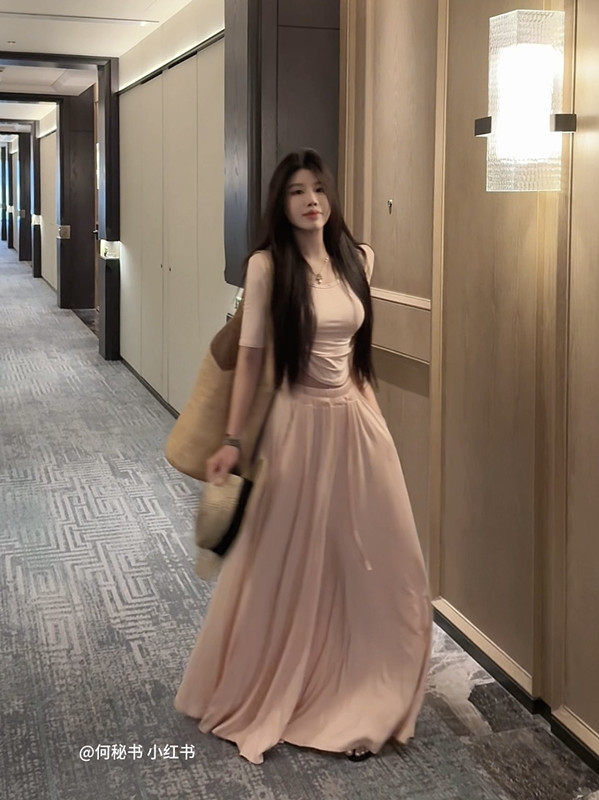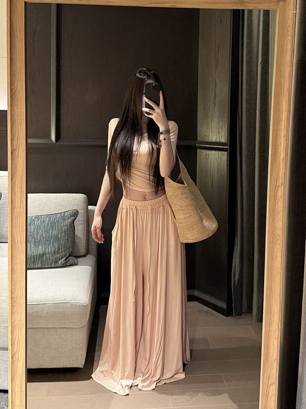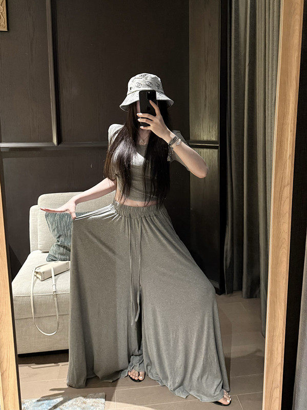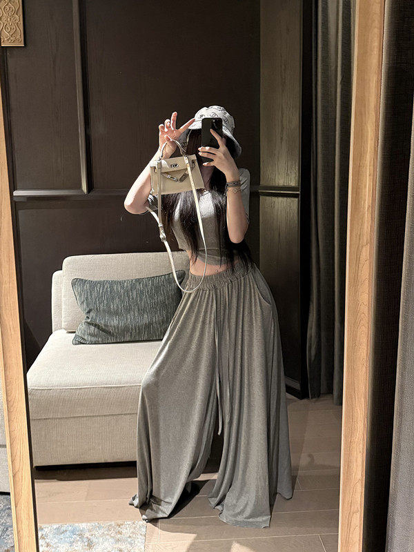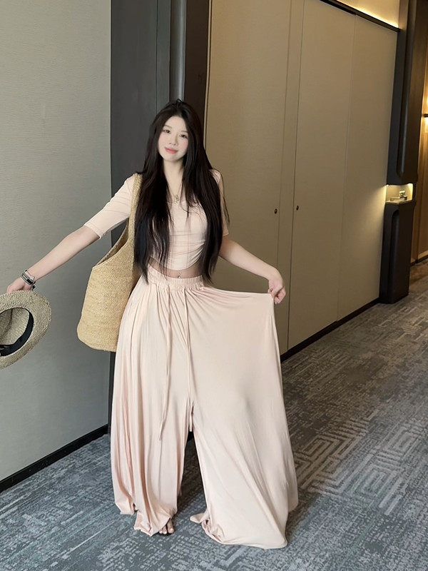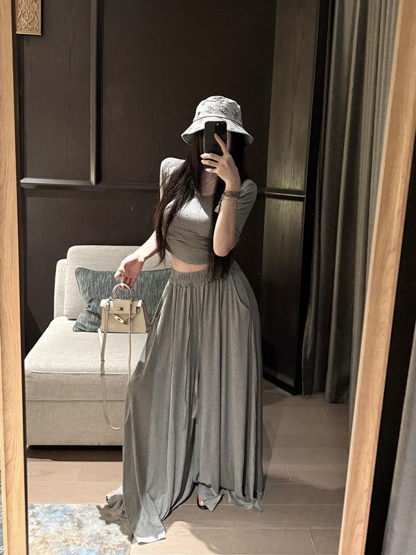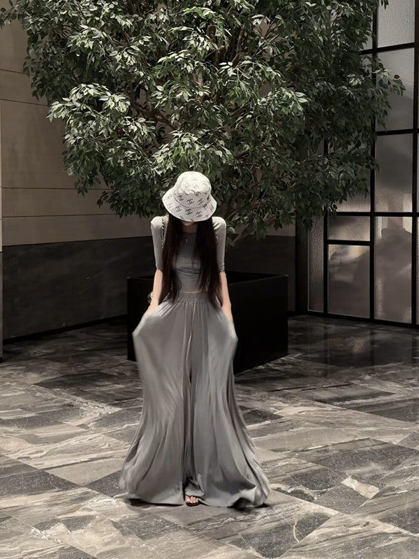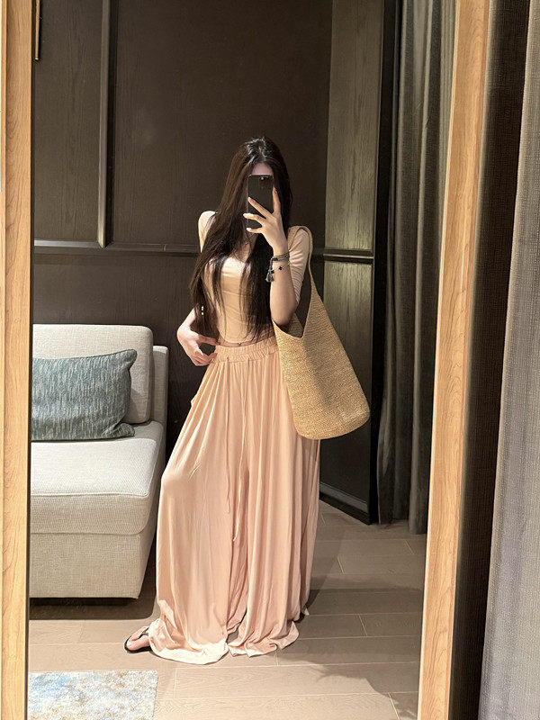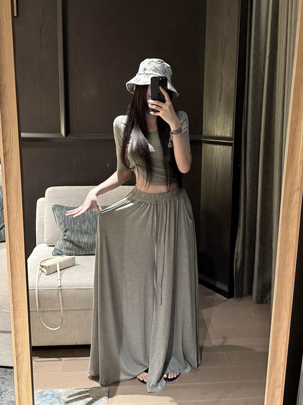Popw Gentle and Elegant Ballet-Style Mid-Sleeve Round-Neck Slim-Fit Top + Elastic Skirt Pants Two-Piece Set for Women