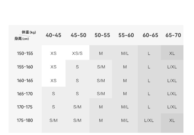 China (cm) 160-165/84-86 165-170 / 88-90 167-172 / 92-96 168-173 / 98-102 170-176 / 106-110