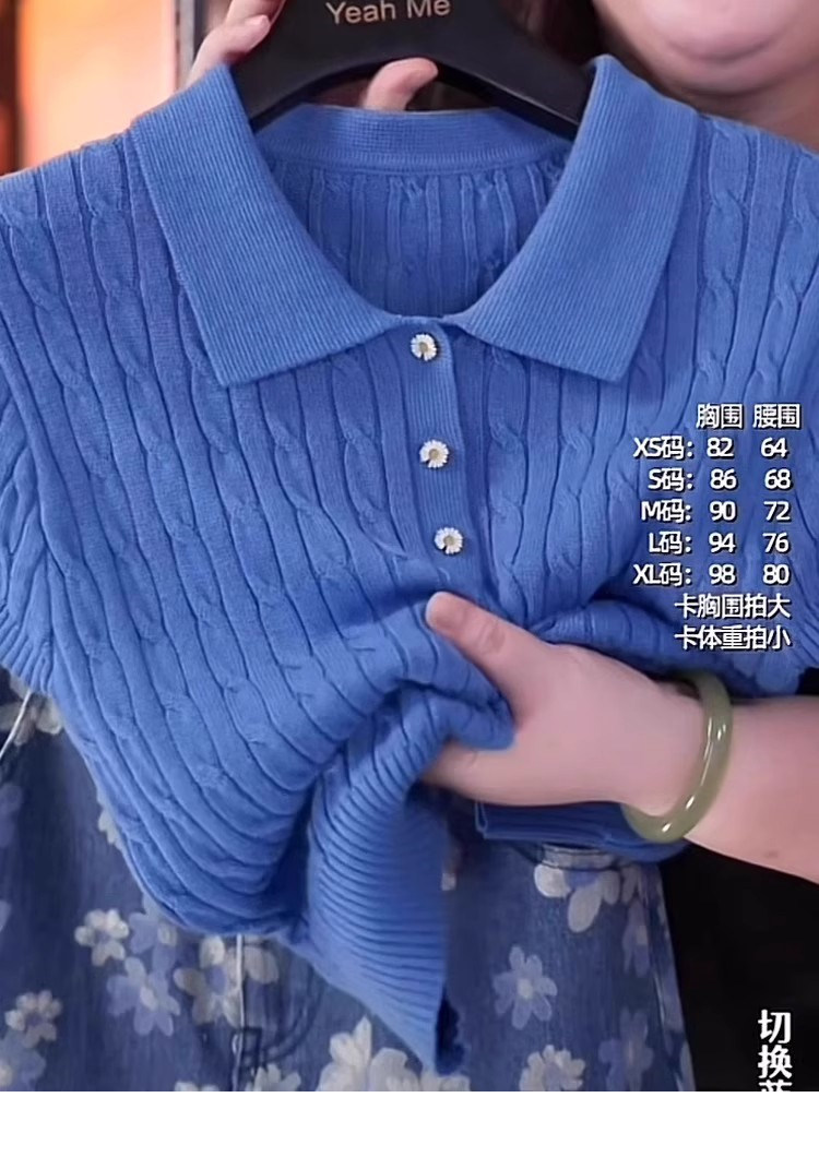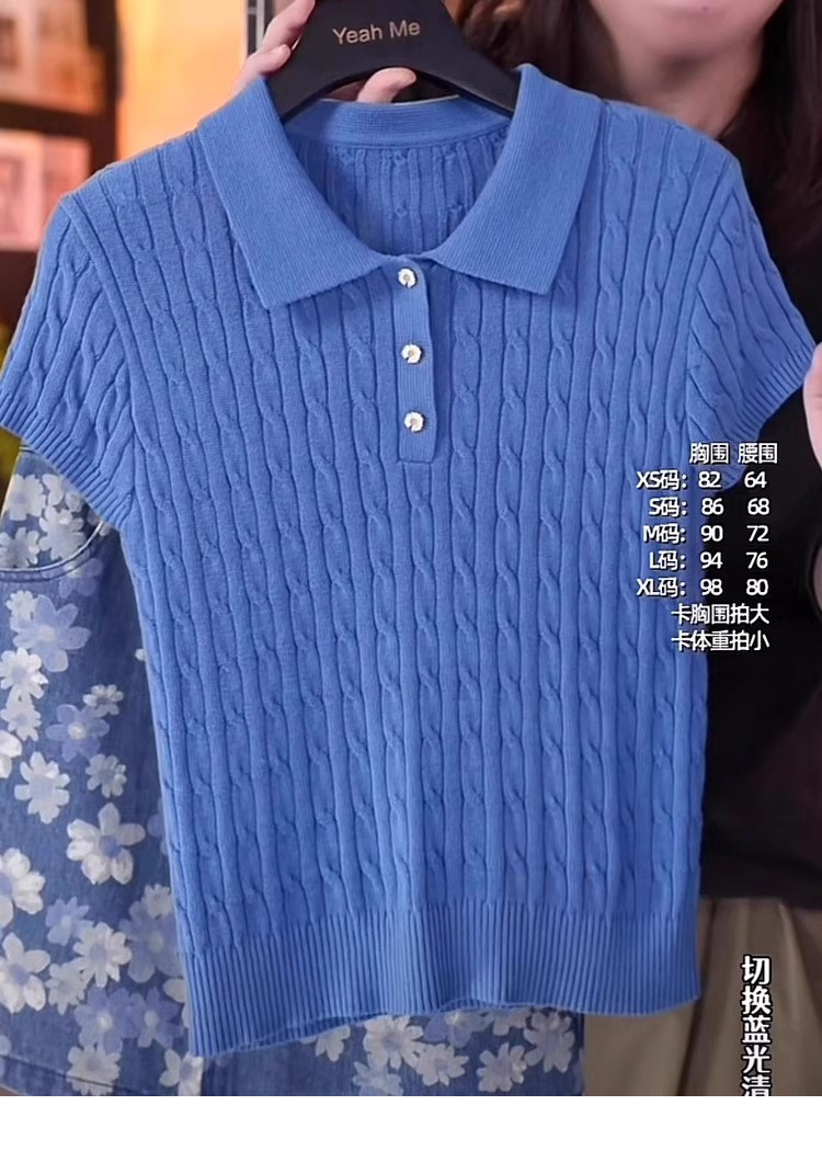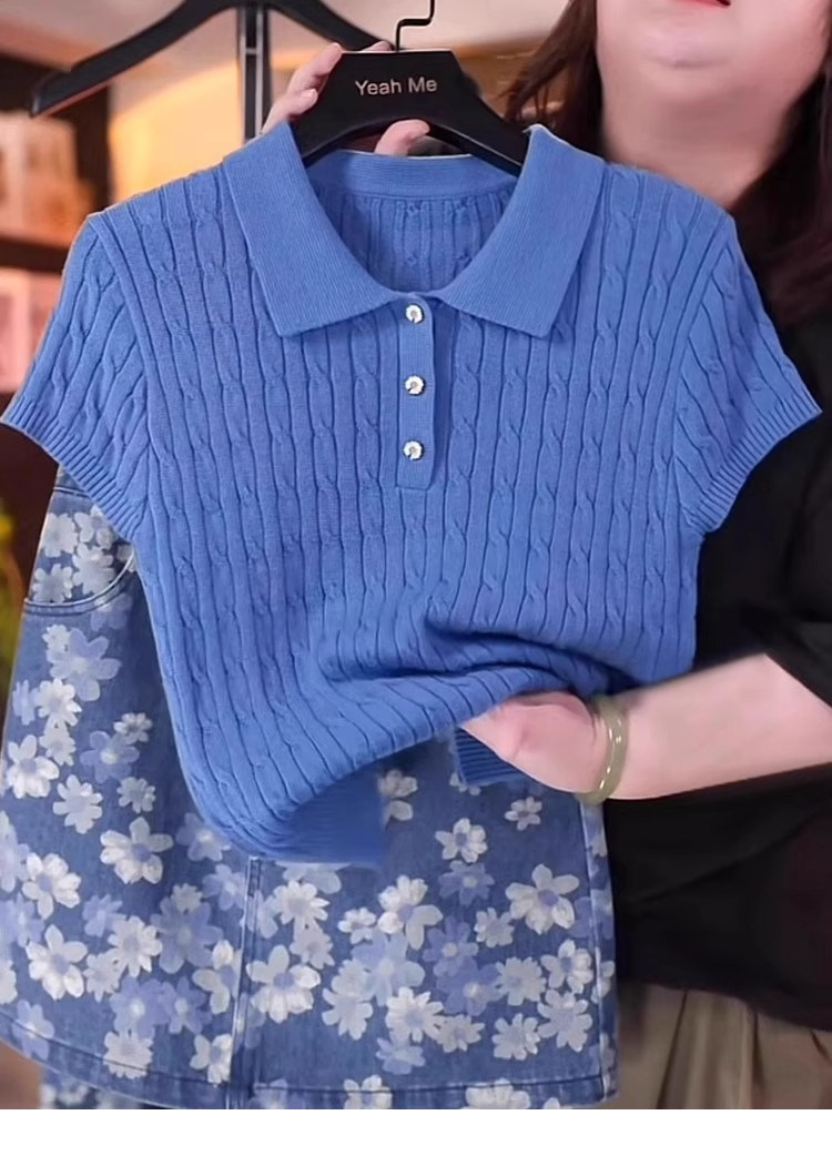 Summer Blue Twist-Knit Short-Sleeve Knit Top for Women, French-Style Polo Collar, High-End Base Shirt, Ice Silk Top