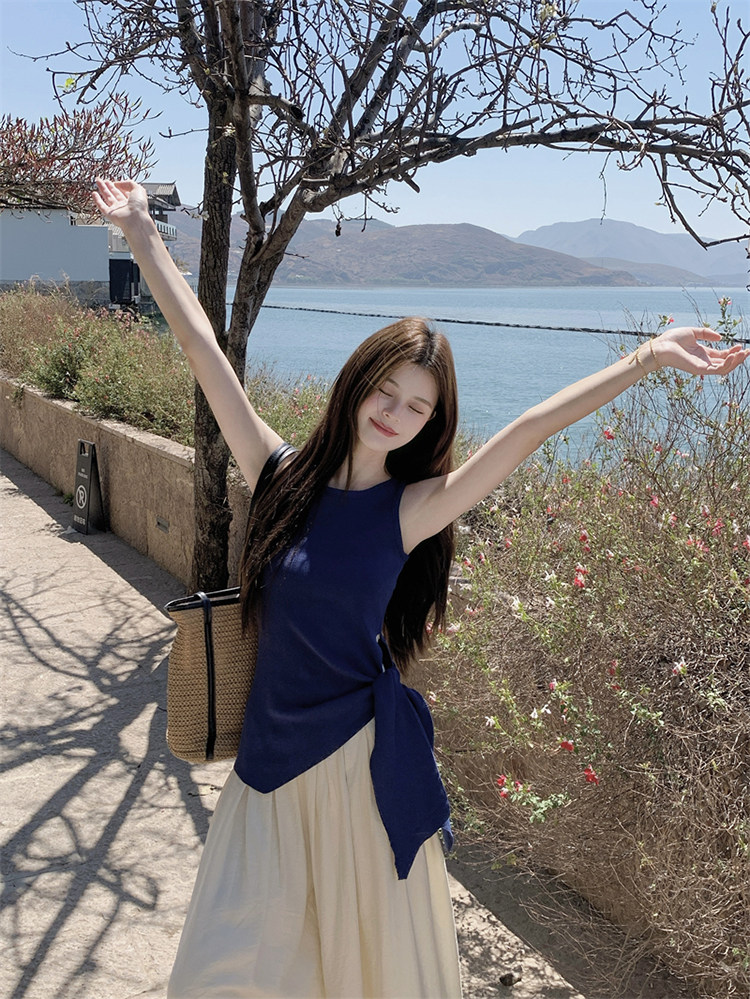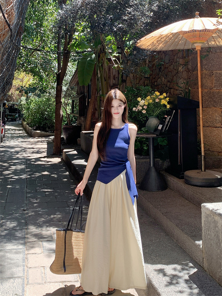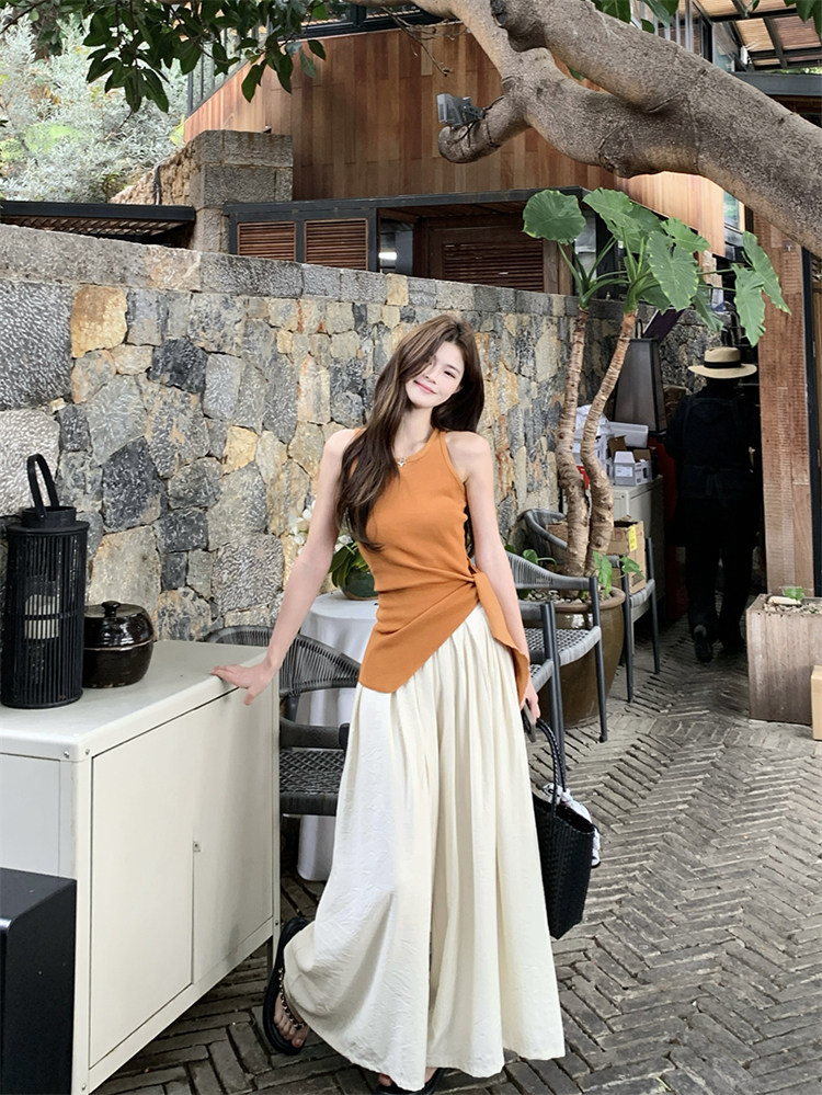 Summer Irregular Tie-Up Ice Silk Knitted Camisole Women's White Loose Skirt Pants Wide-Leg Pants Hot Girl Outfit