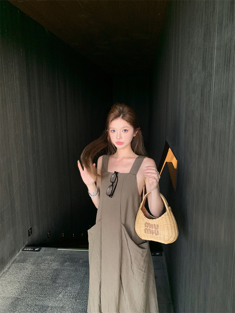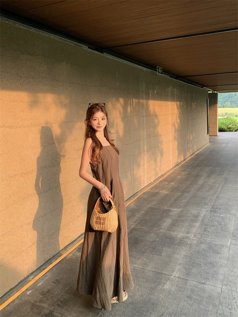 Light Mature Style, Fashionable and Versatile Square Neckline Workwear Long Dress for Women, New Summer Design with Large Pockets and Tank Top Dress
