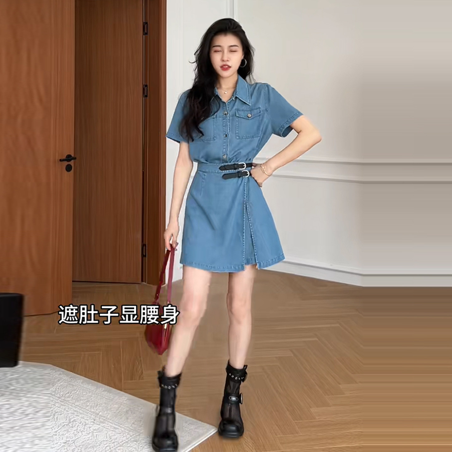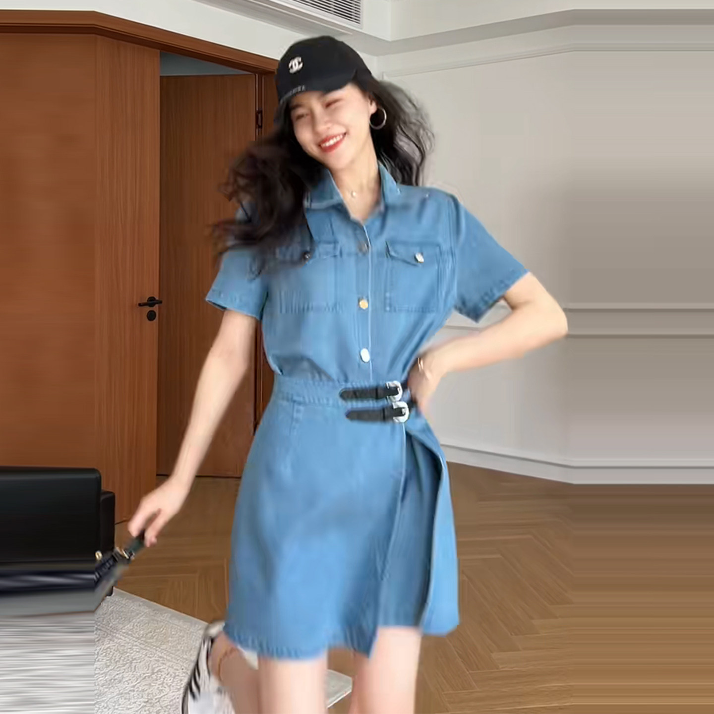 Plus-Size French Retro Denim Dress for Women, Summer Slimming Waist-Cinching Short-Sleeve Dress, Fashionable and Versatile A-Line