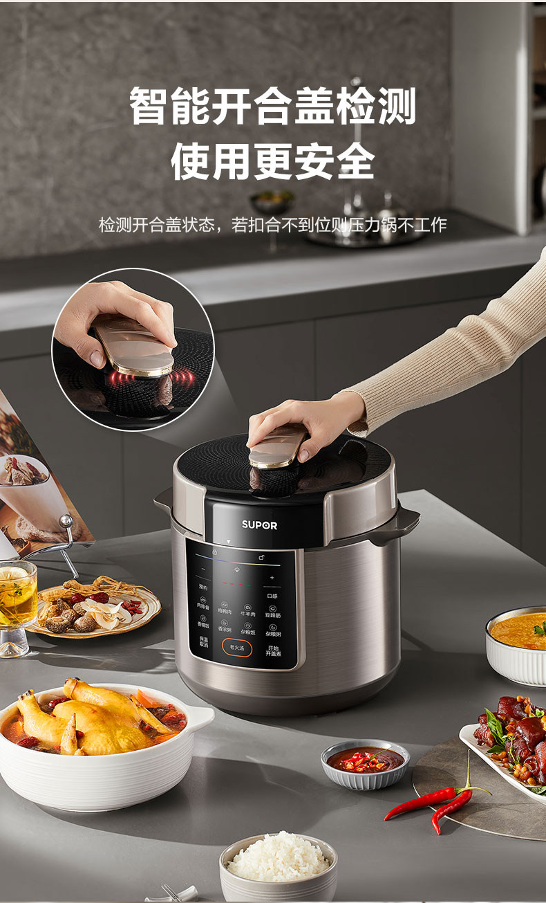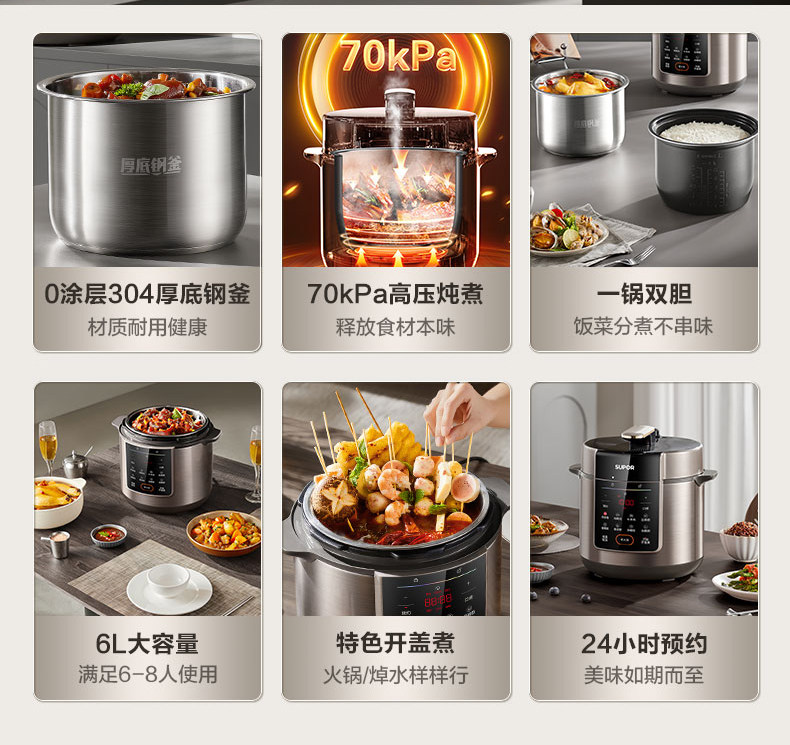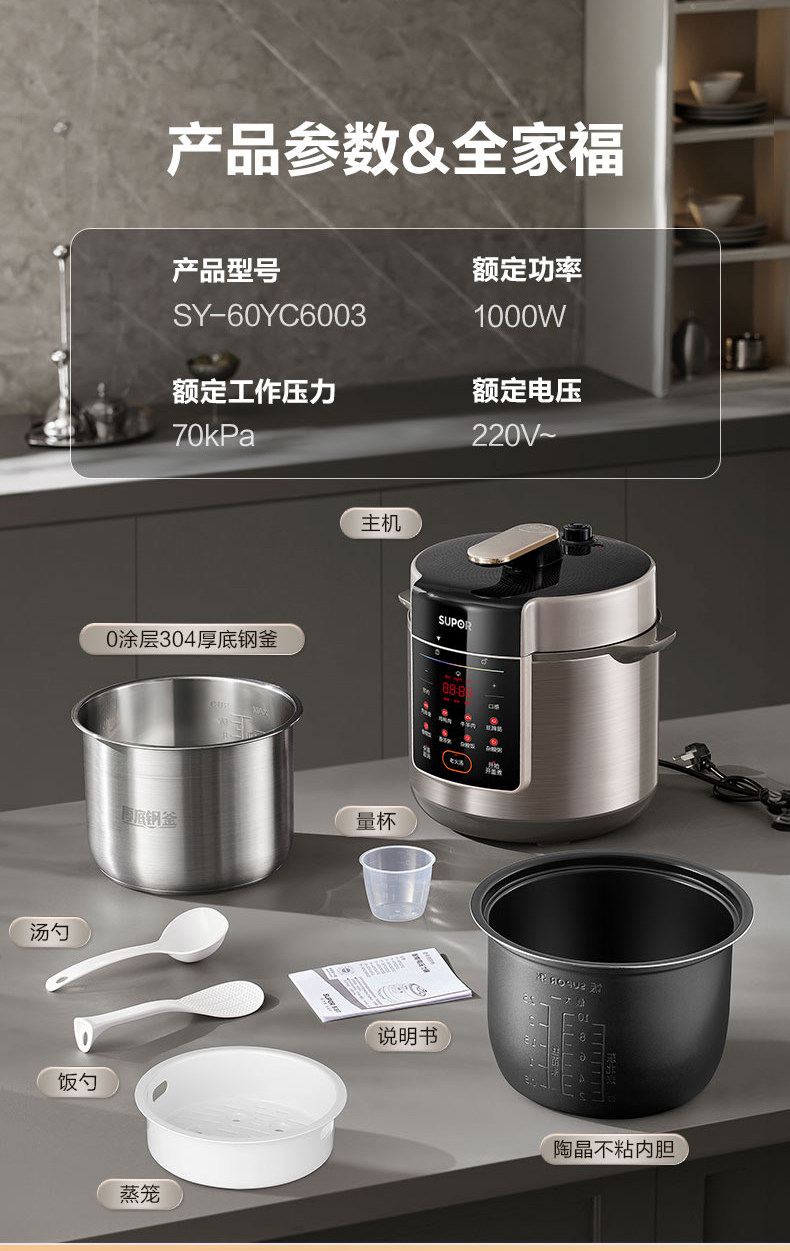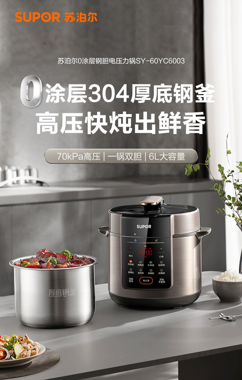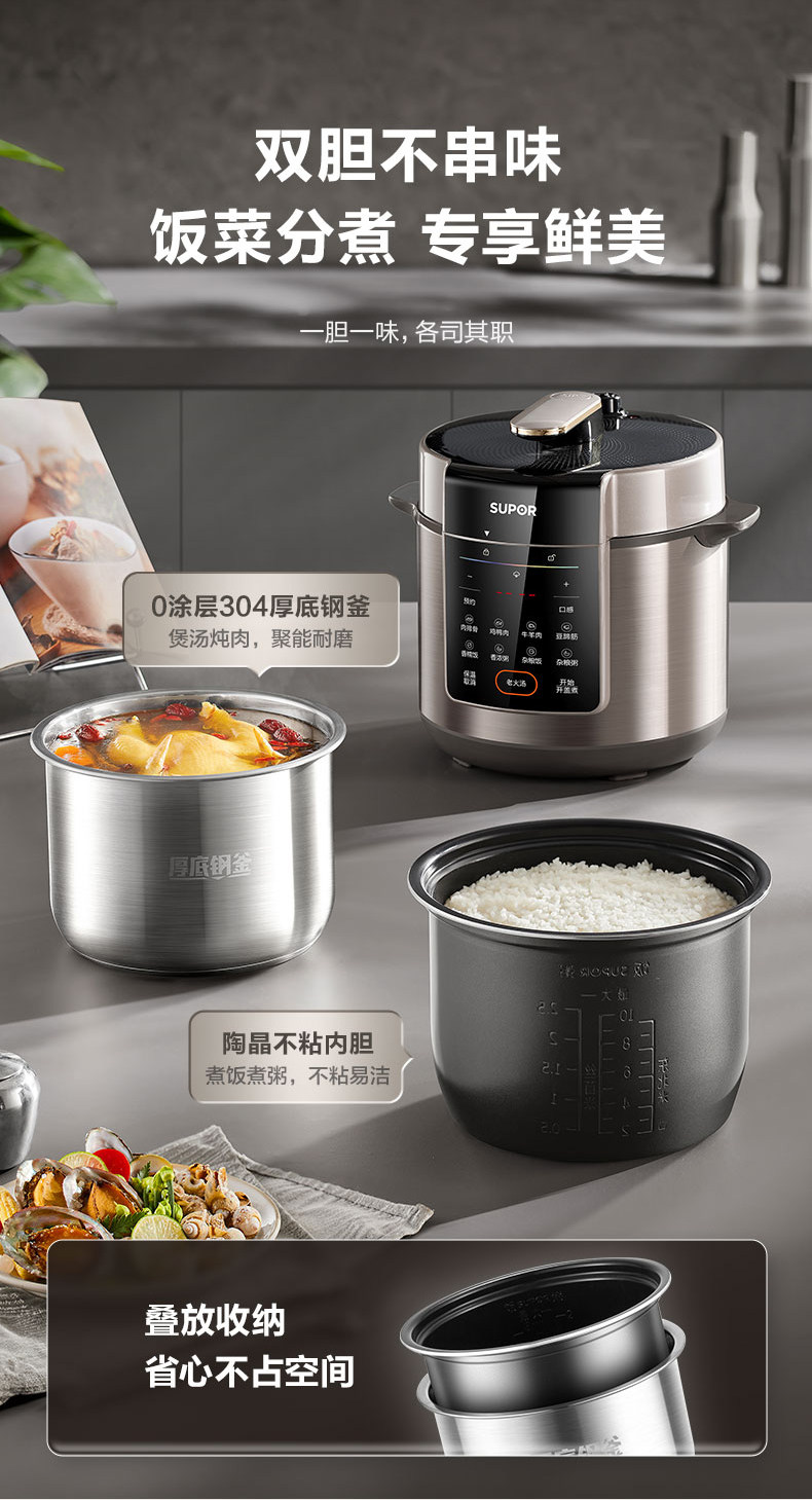 Supor Electric Pressure Cooker for Home Use, 6L Stainless Steel, Non-Coating, Smart New Model, Dual Pot Rice Cooker