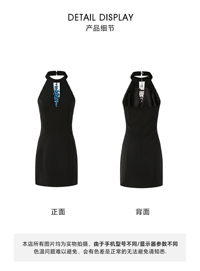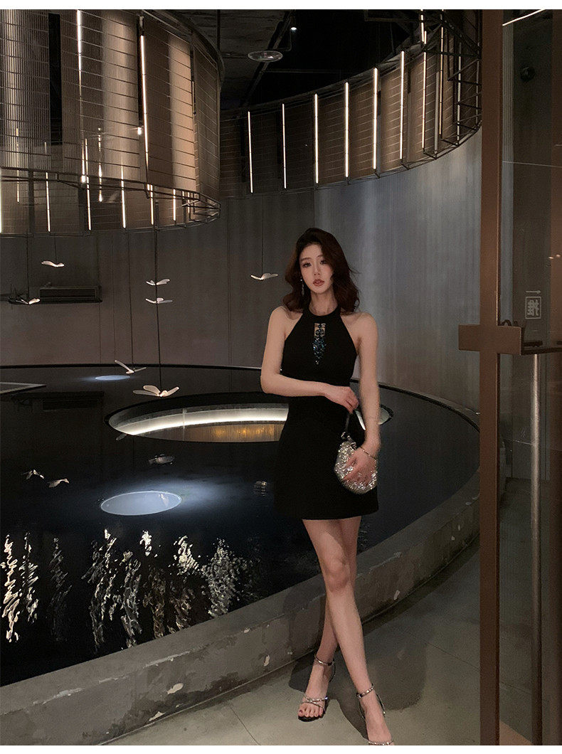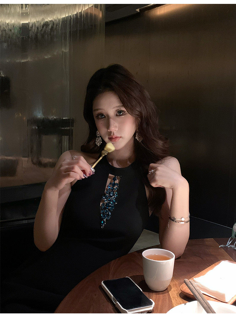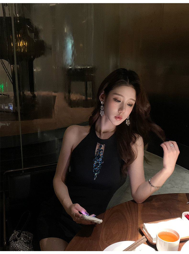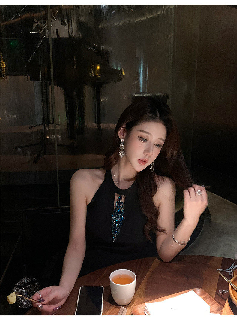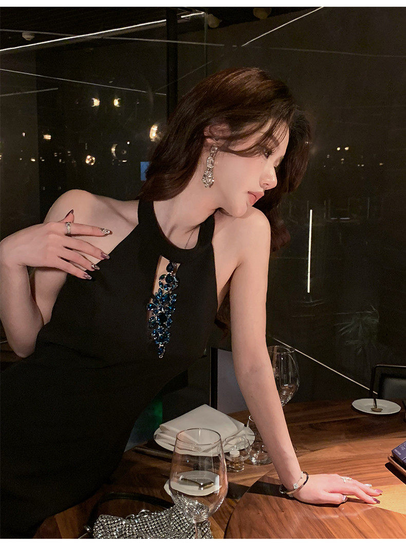 Hollin Blue Rhinestone Off-The-Shoulder Sleeveless Halter Dress for Women, High-End Spring and Summer Waist-Cinching Sexy Bodycon Dress