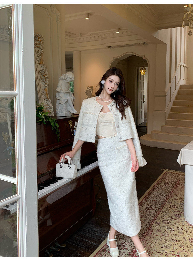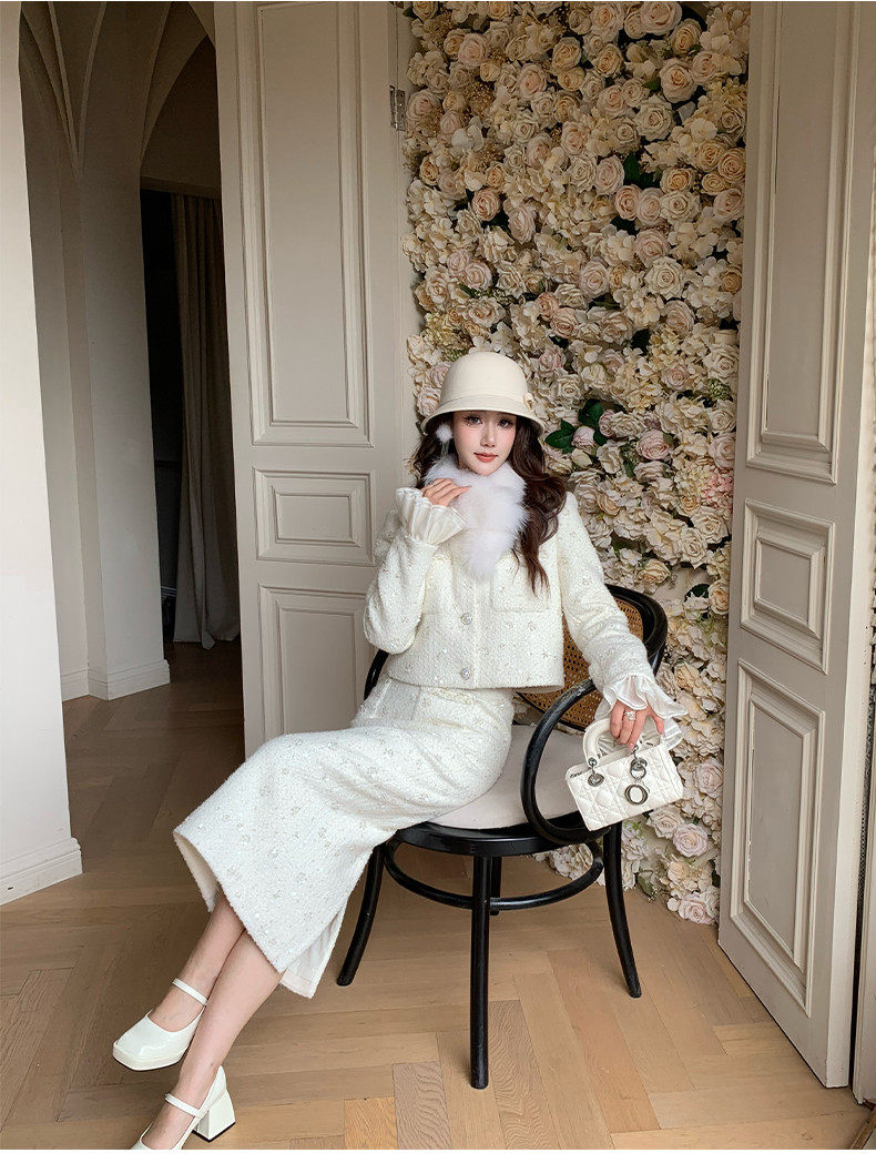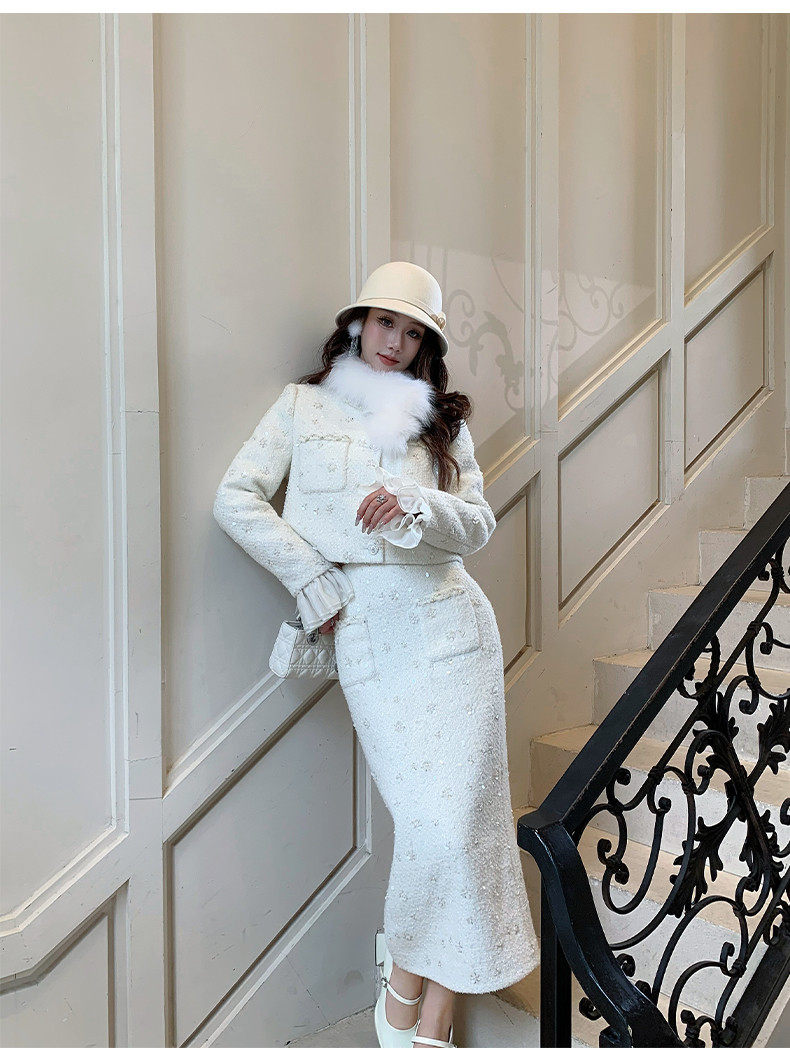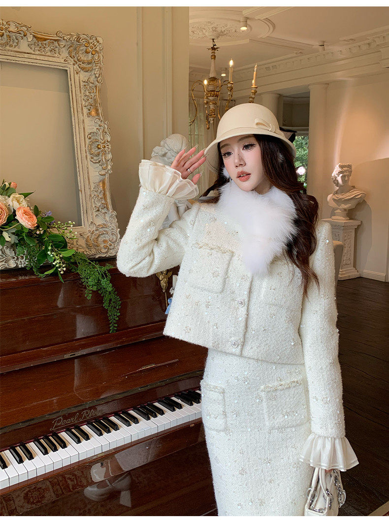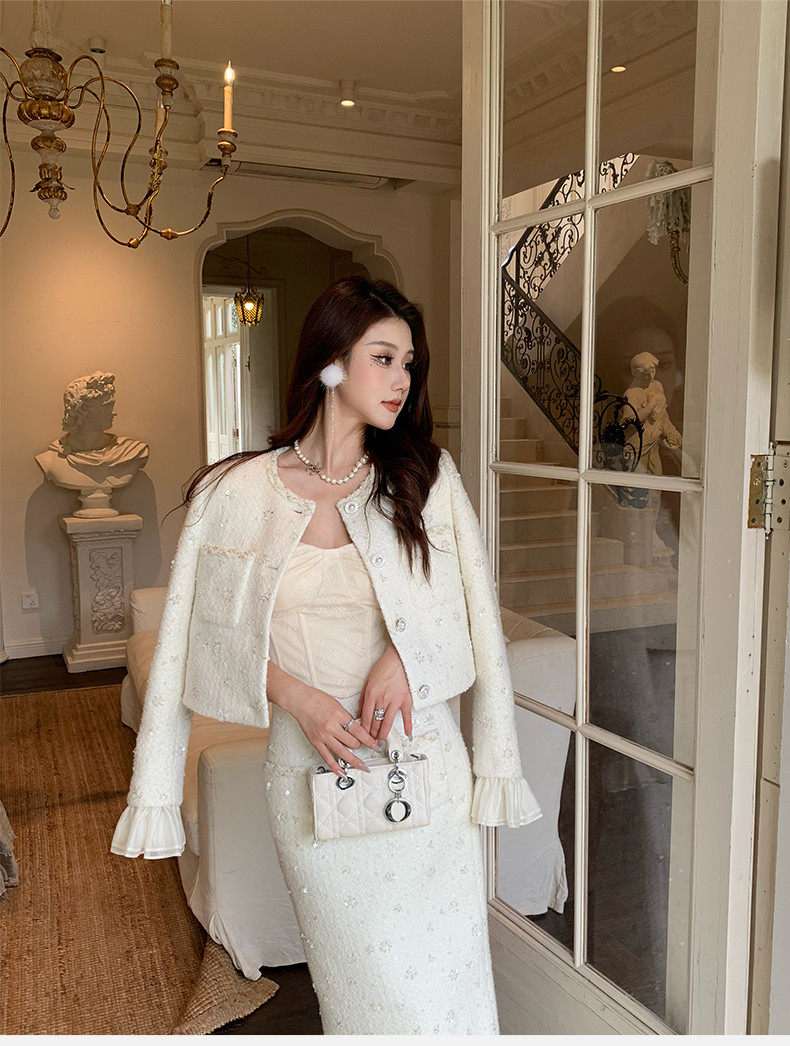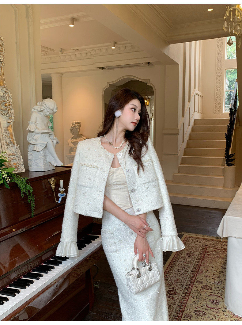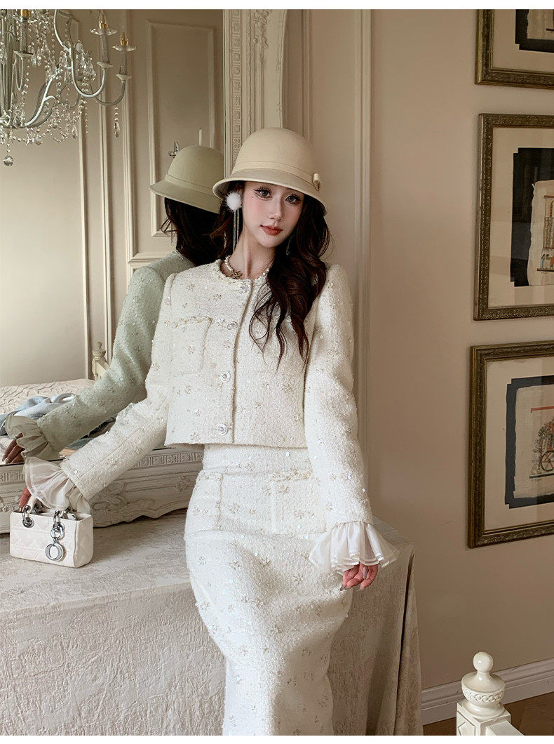 Hollinna Rich Girl Wool Tweed Style Suit Dress for Women Autumn and Winter Socialite Style Sequined Tweed Two-Piece Set