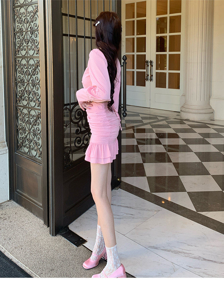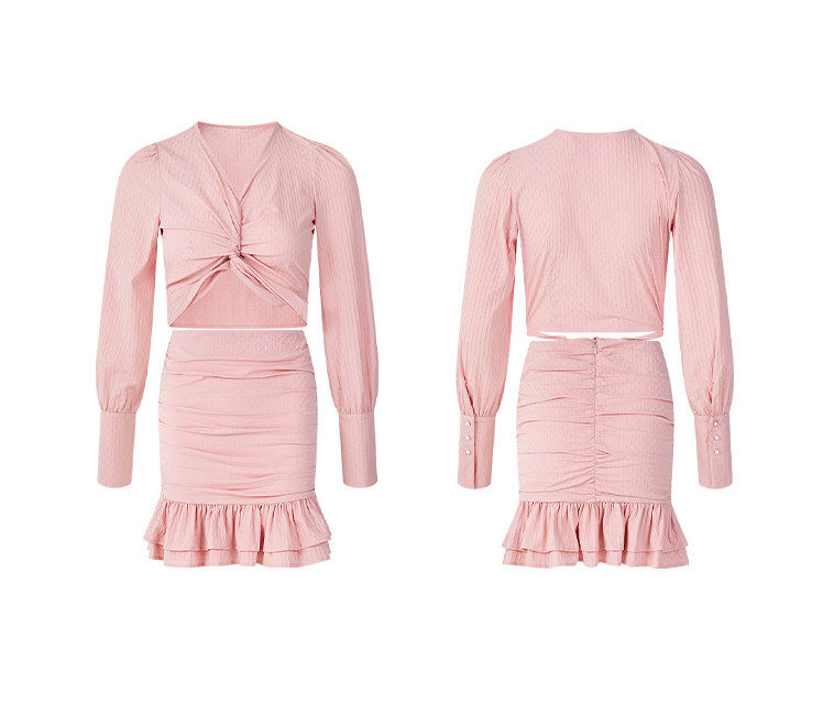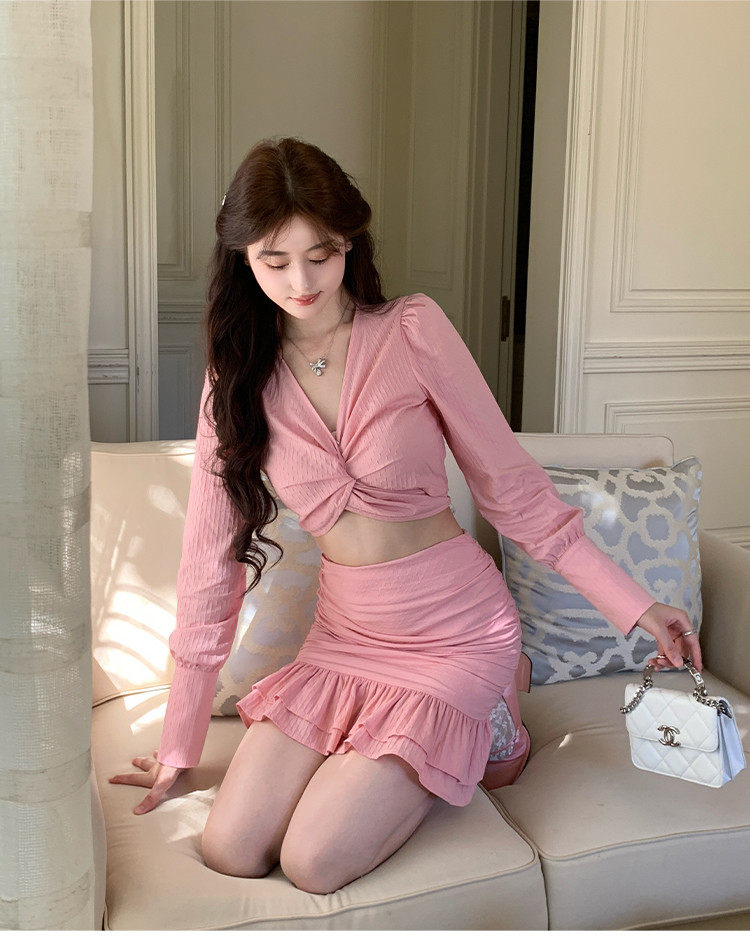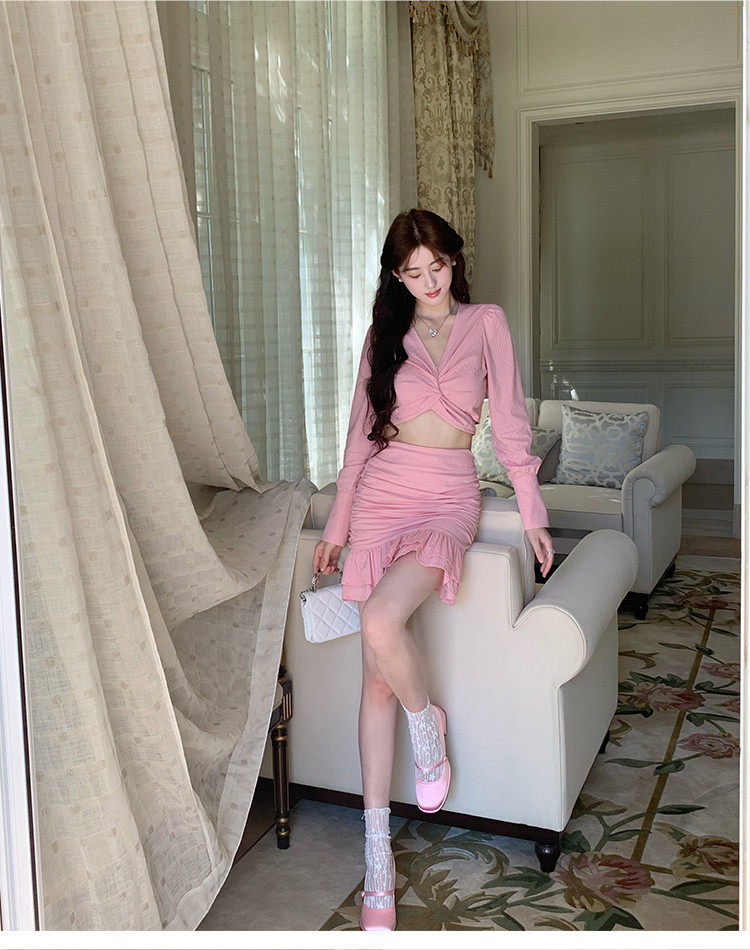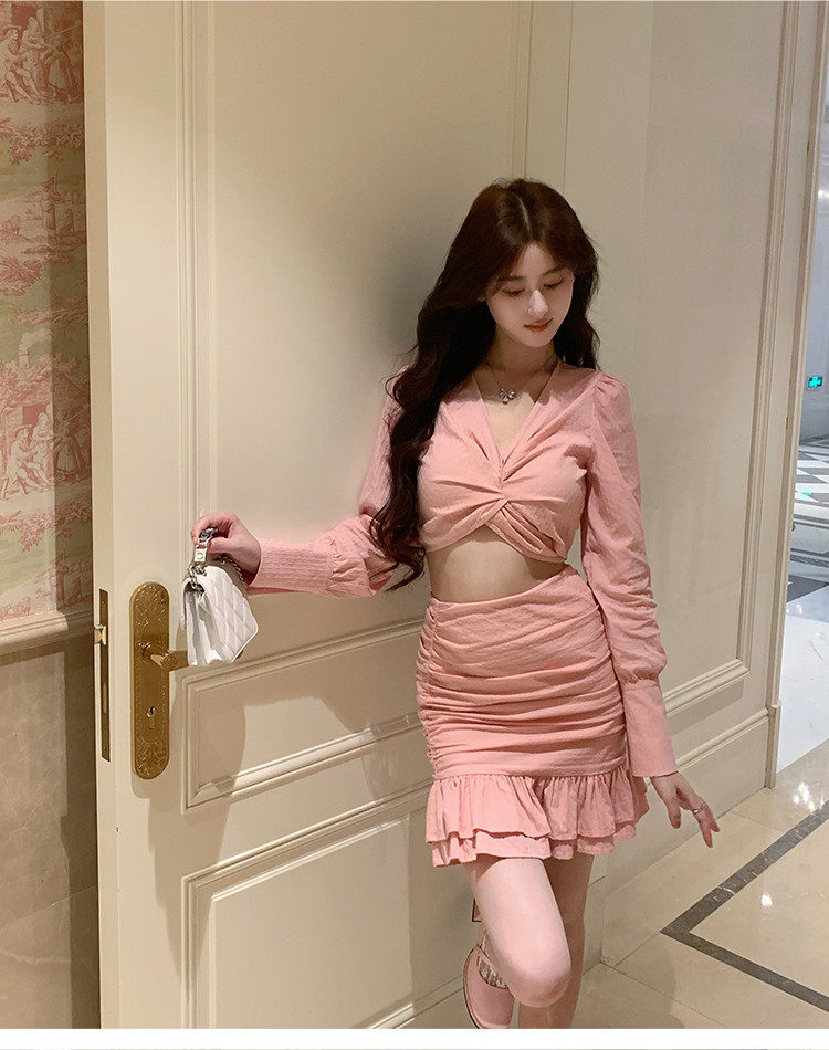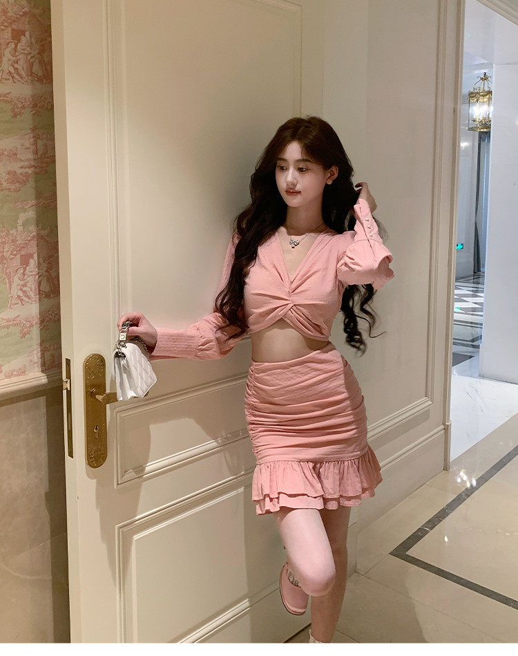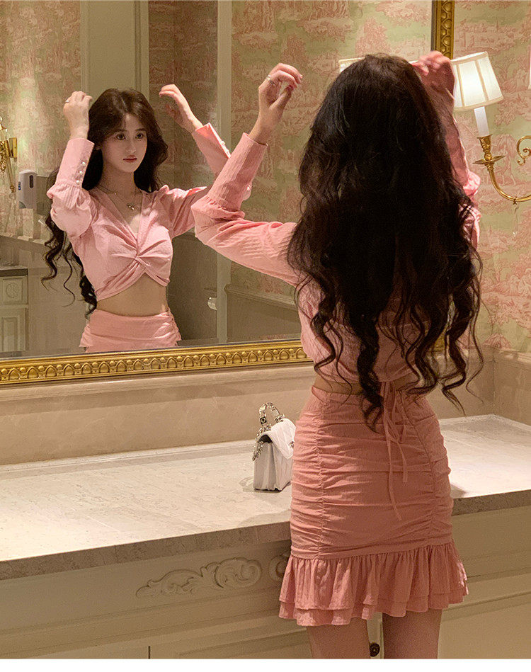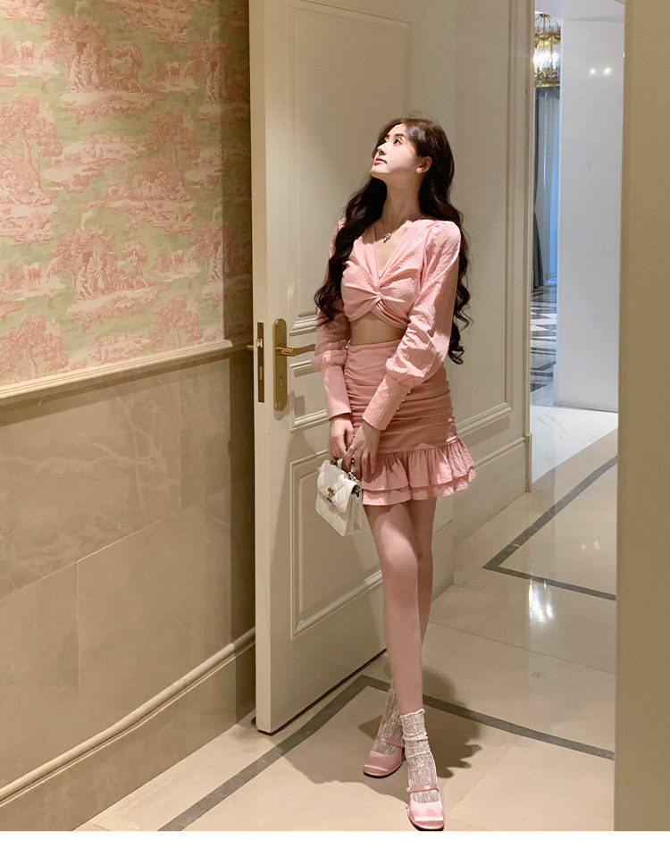 Hollin Twist Top Suit for Women Spring & Fall Tender Pink Slimming Look Sexy Sexy Short Long-Sleeved Top Hip Skirt