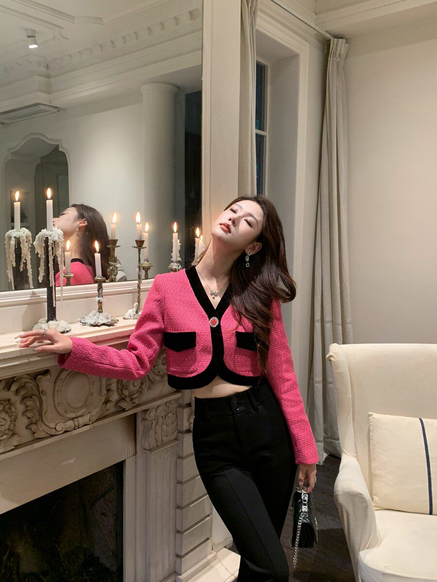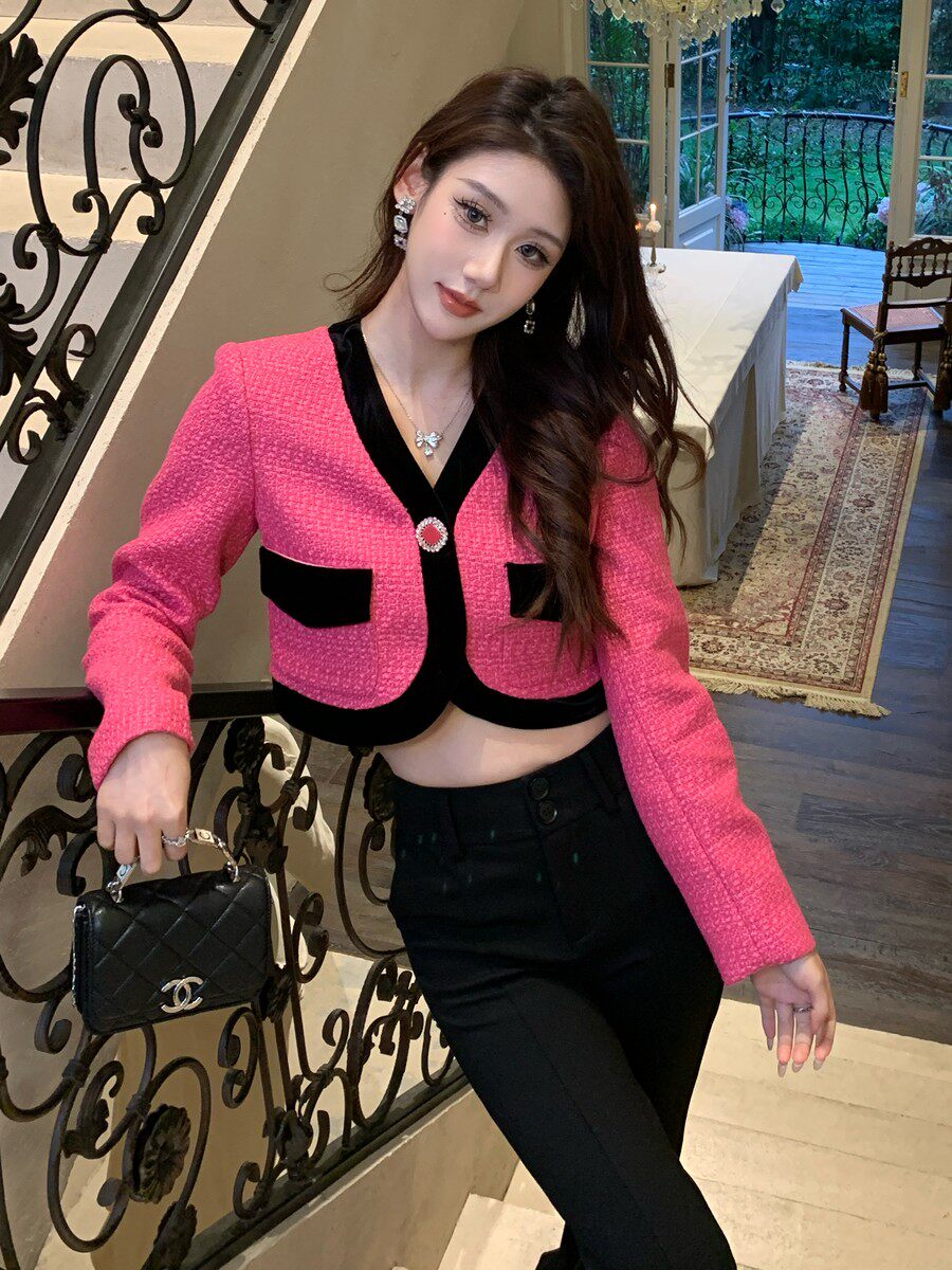 Hollinna woven pink small fragrant style short coat for women spring and autumn high-waisted versatile tops for small people