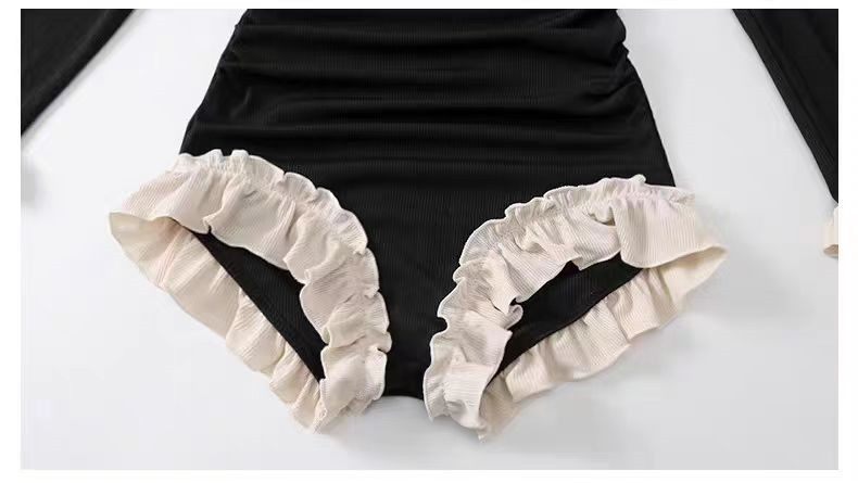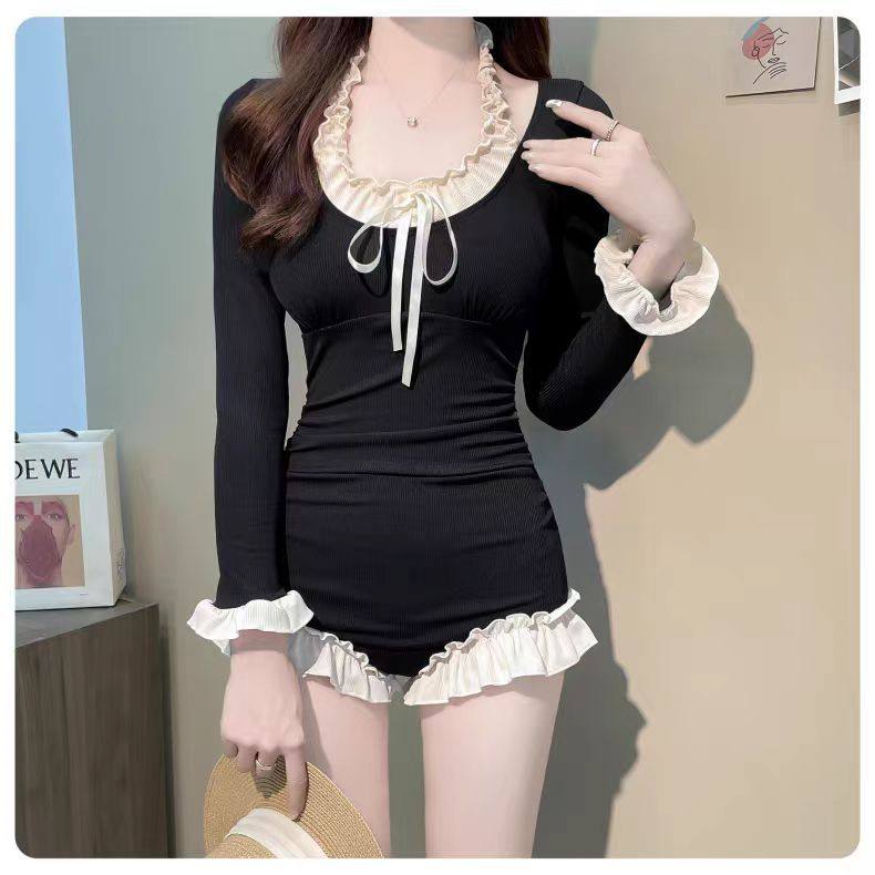 Women's Conservative Long-Sleeved Sun-Protective One-Piece Swimsuit with Boyshorts, Tummy-Covering, Slimming, Sexy Backless, Vintage Hot Spring Special