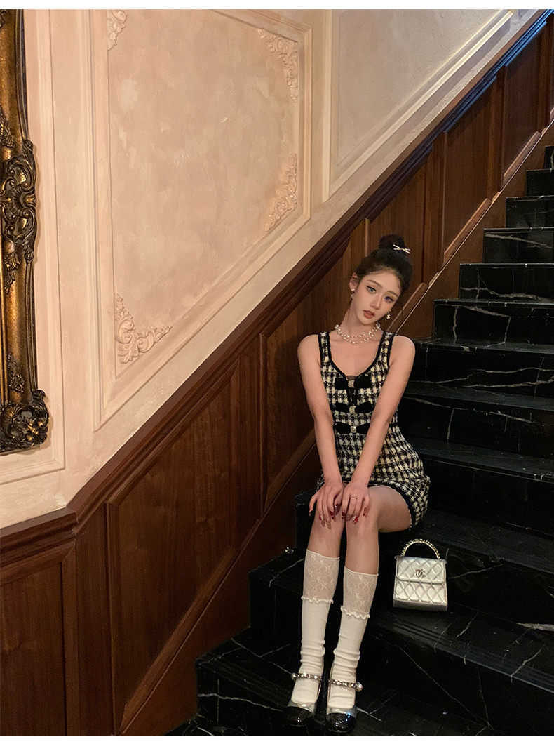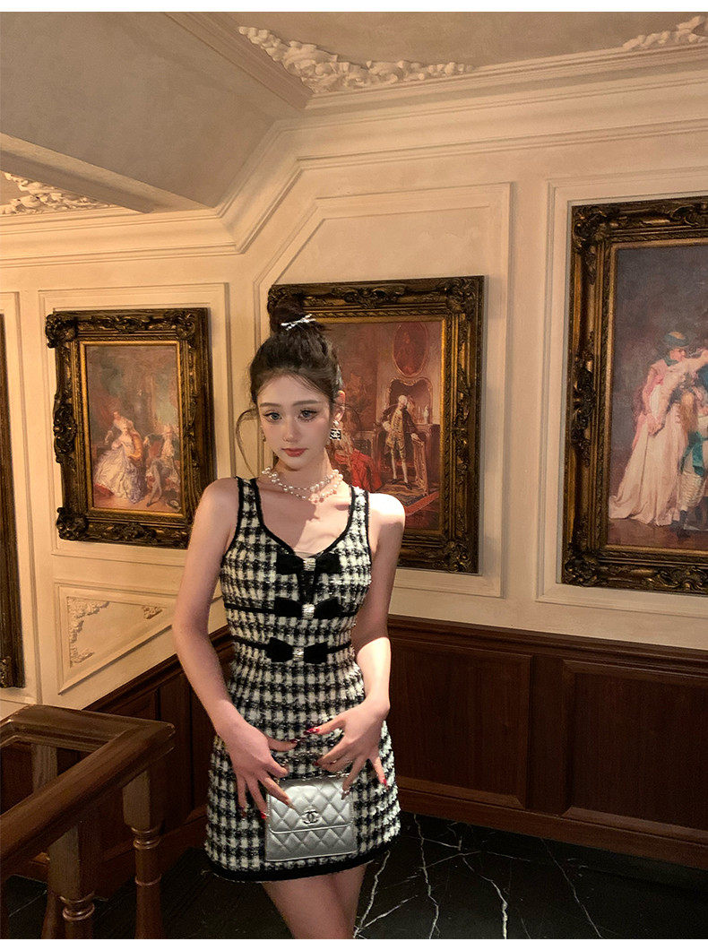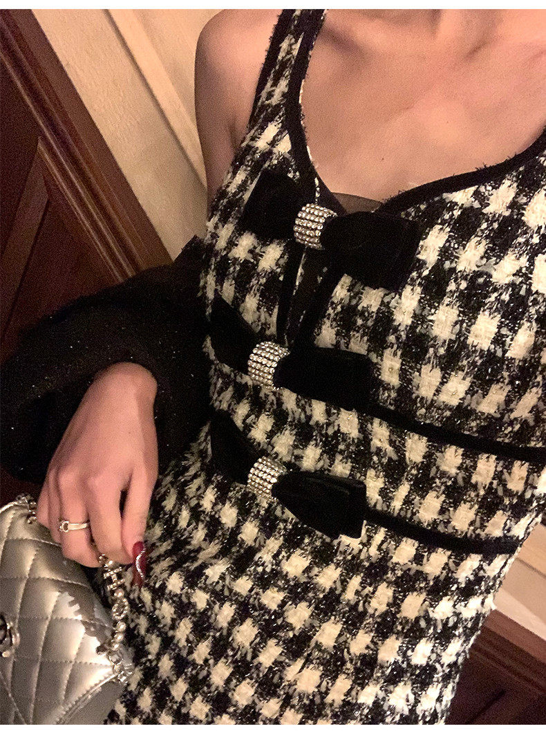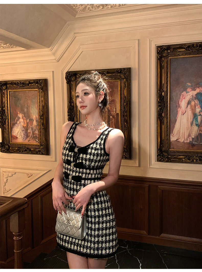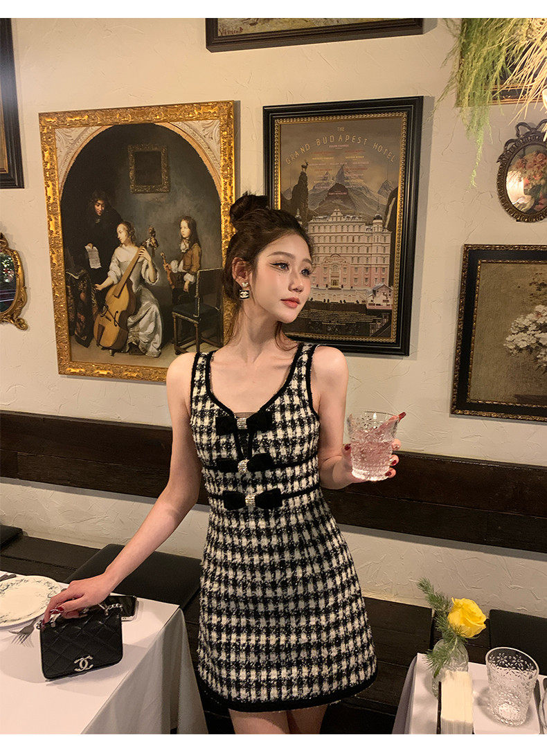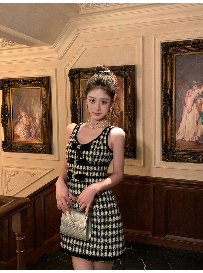 Hollin Grid U-Neck Chanel-Style Spaghetti Strap Dress for Women, Spring and Autumn, High-End Waist-Cinching Slimming Base Dress