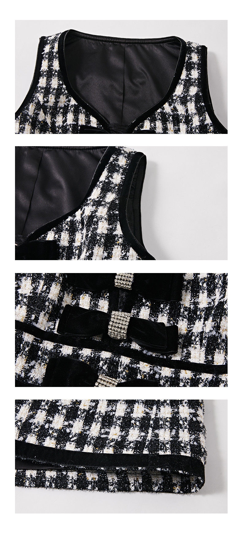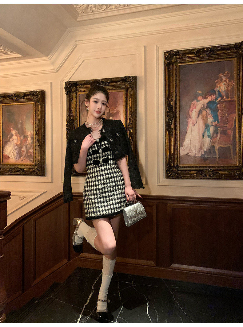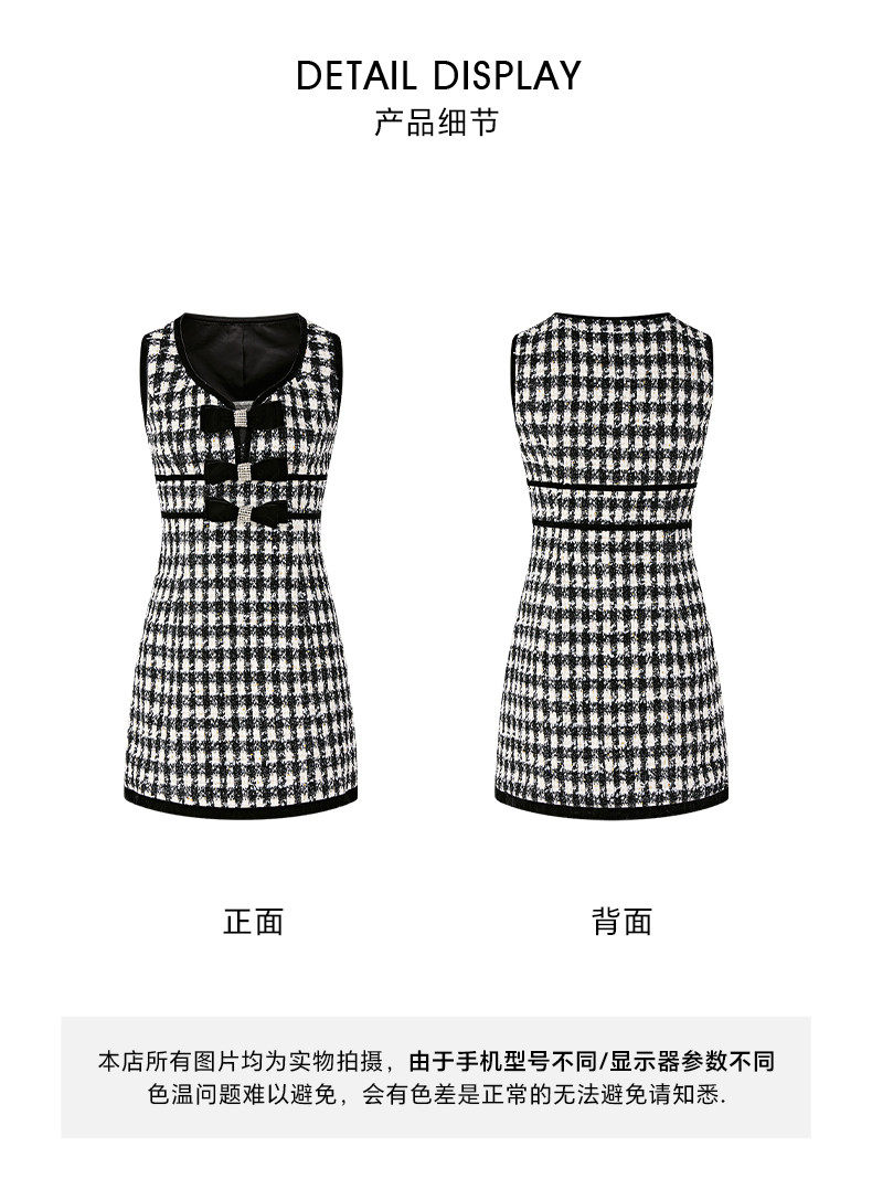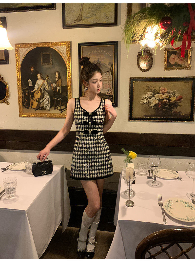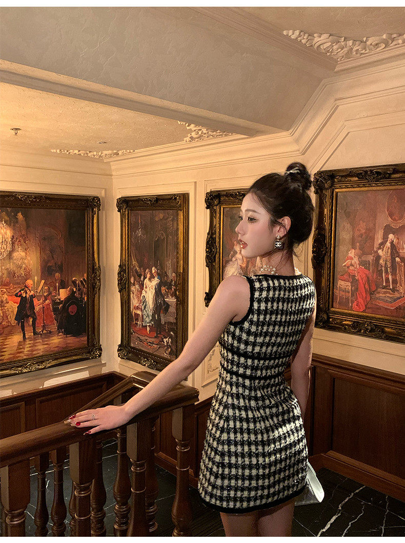 Hollin Grid U-Neck Chanel-Style Spaghetti Strap Dress for Women, Spring and Autumn, High-End Waist-Cinching Slimming Base Dress