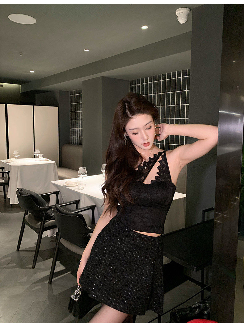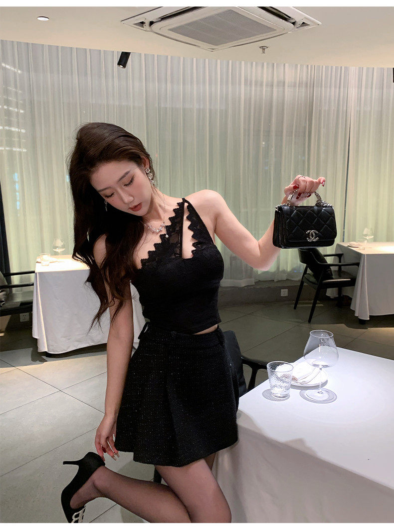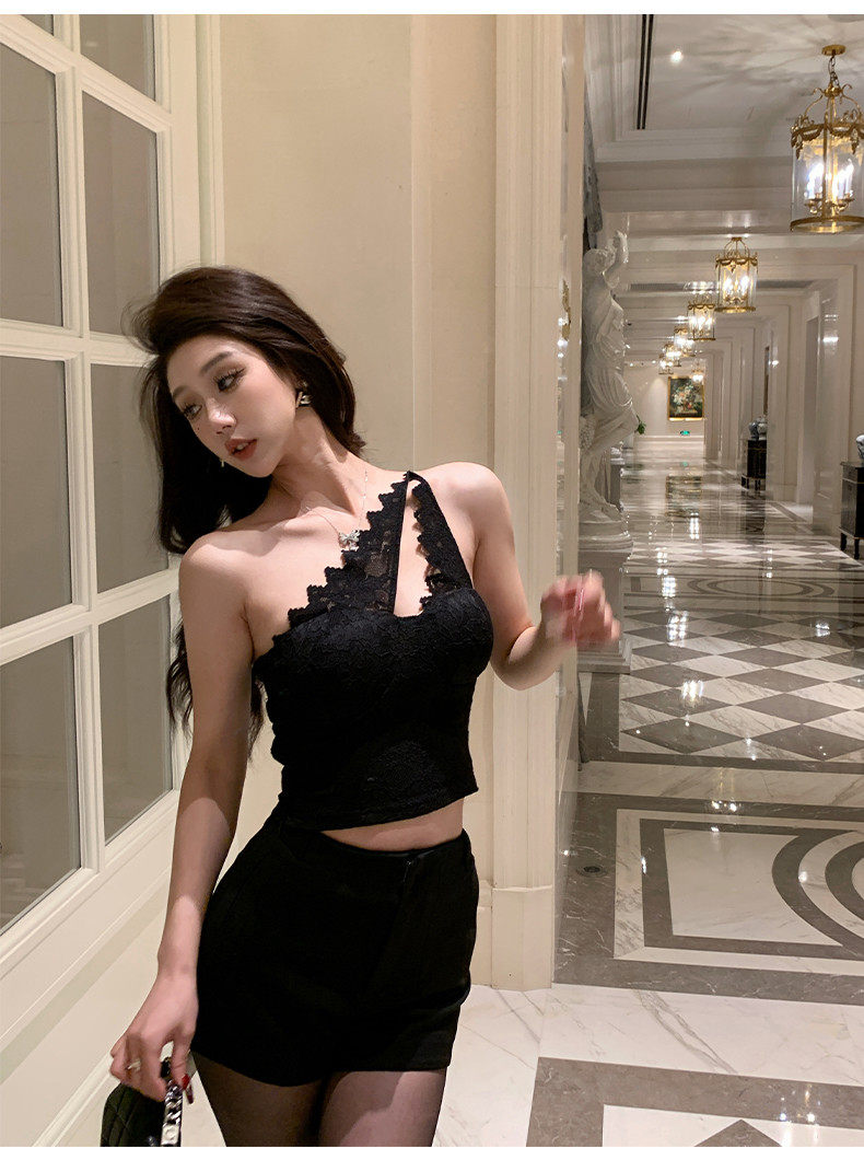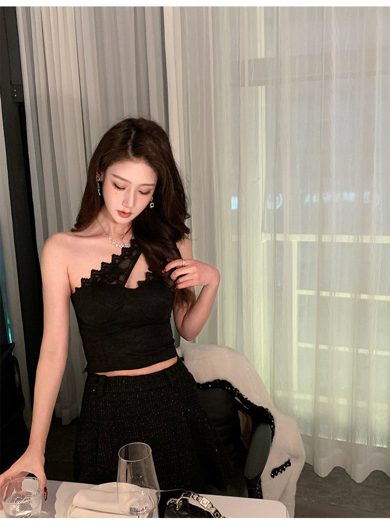 Hollin Off-Shoulder Lace Camisole with Chest Pads for Women, Spring and Autumn 2025, Sexy Hot Girl Knitted Top, Base Shirt